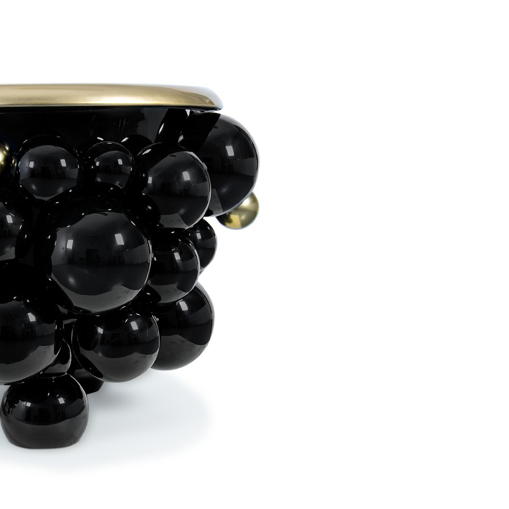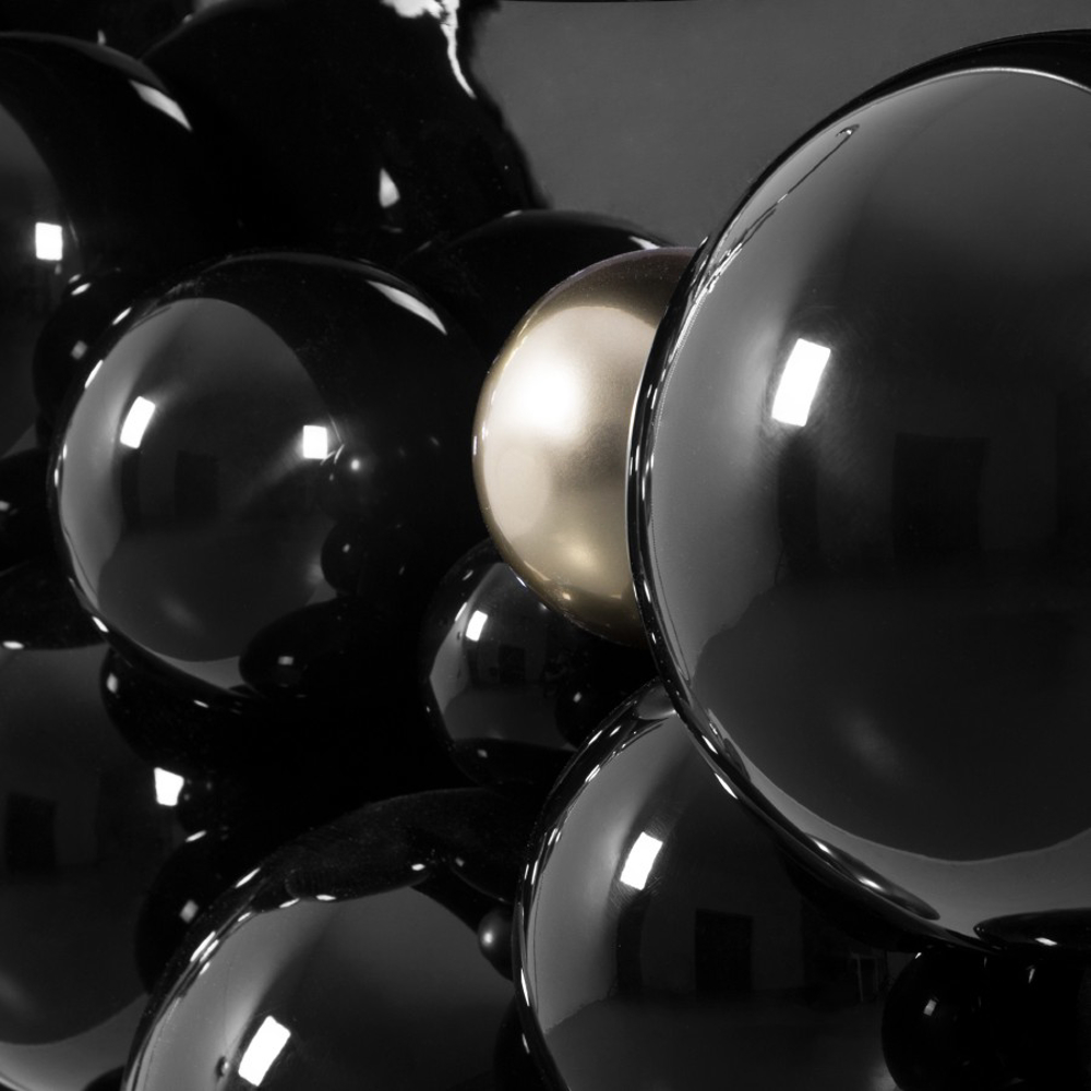 Black lacquer brass spheres with high gloss varnish finishing and some gold plated spheres on the base.