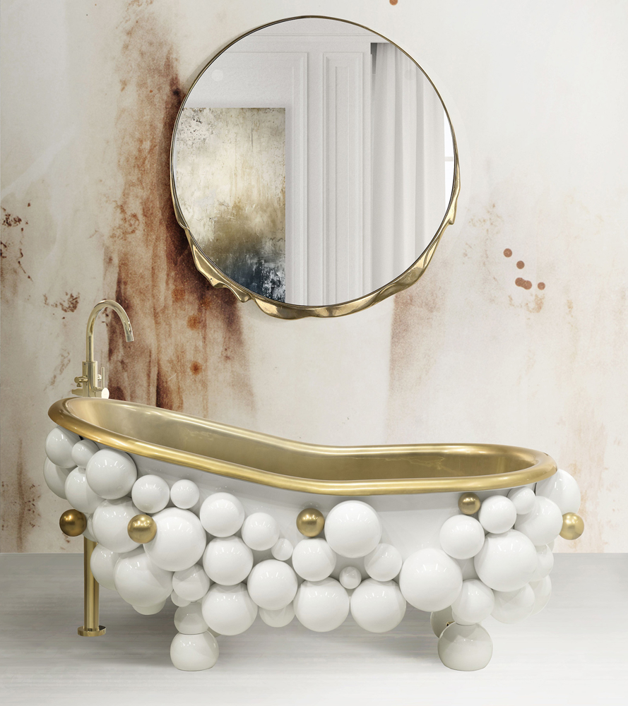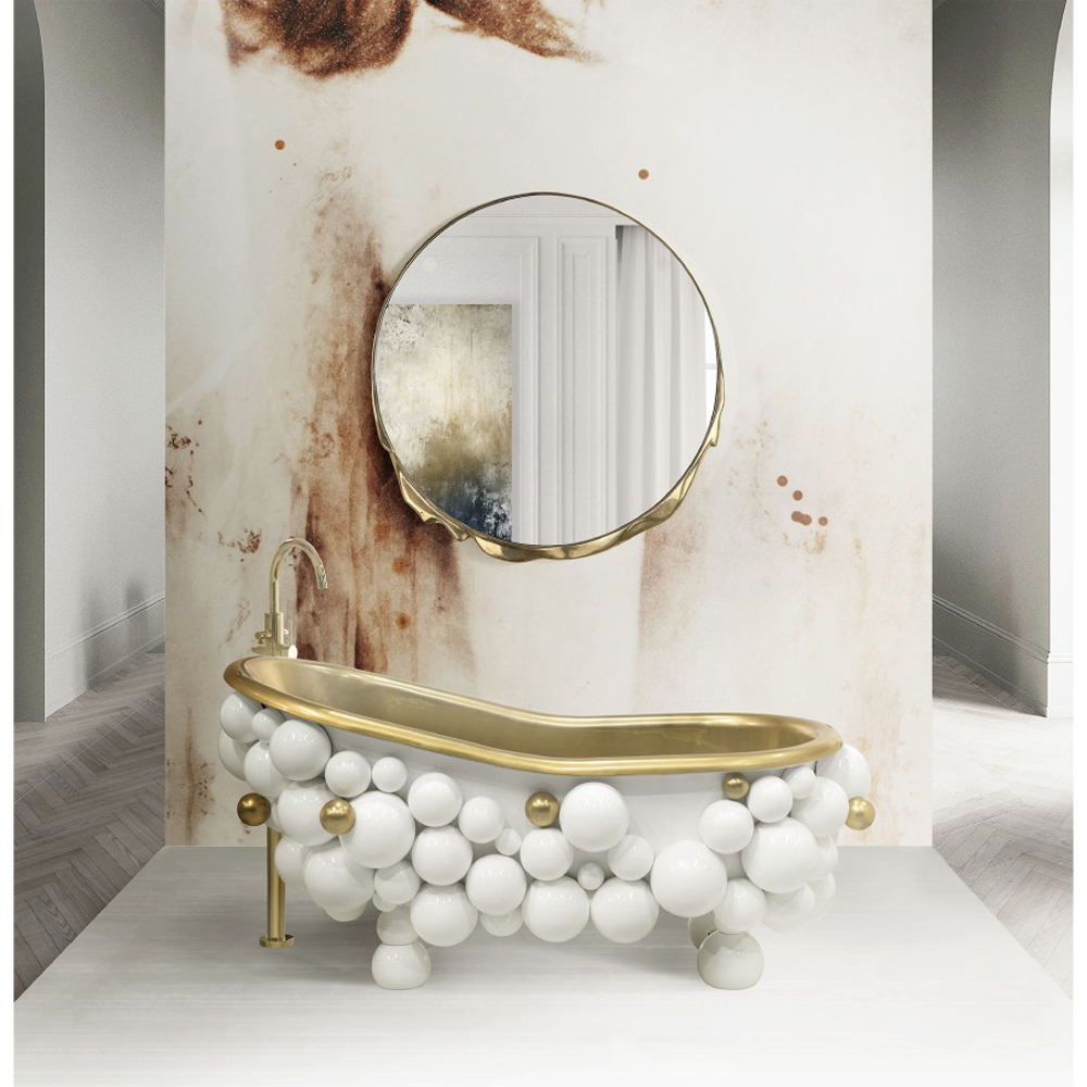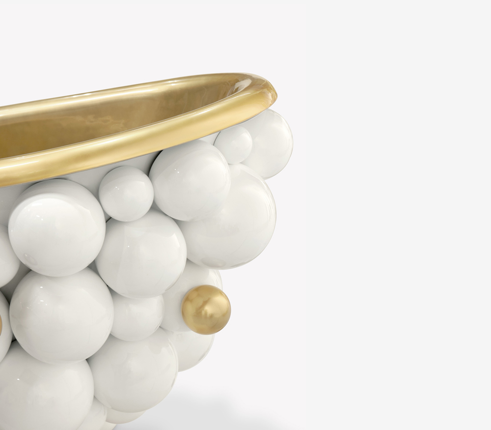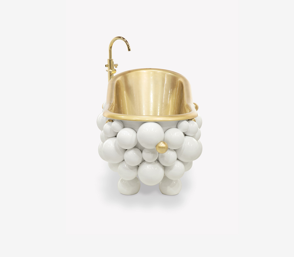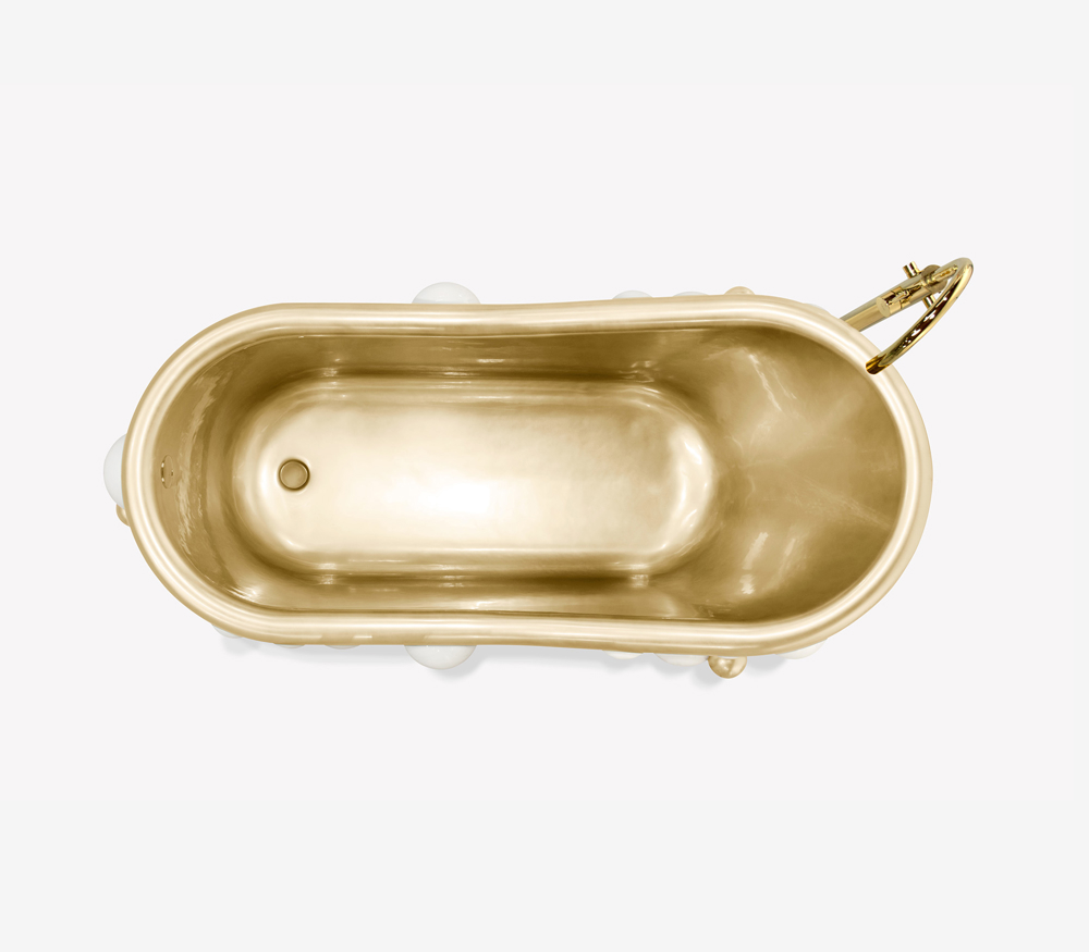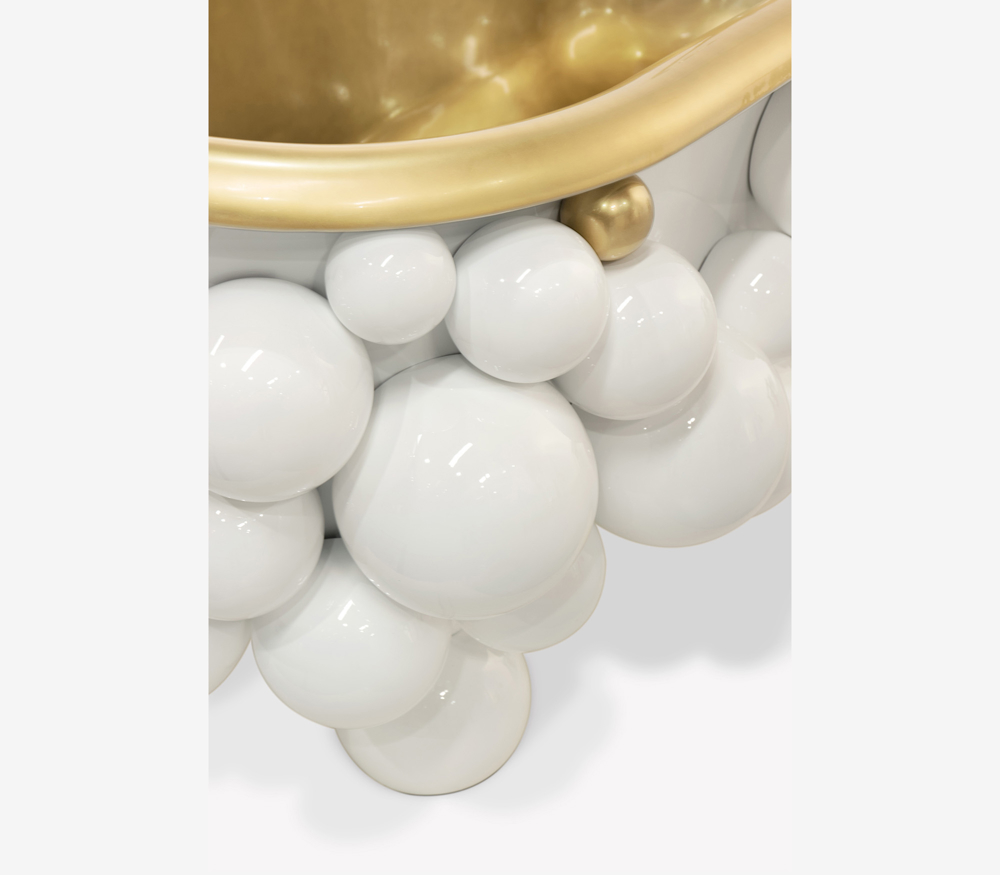 Fiber glass | Black lacquered spheres, High gloss varnish | Gold Painted Spheres, High Gloss Varnish; Tub: Casted iron, Gold painted; Water drainage: Floor