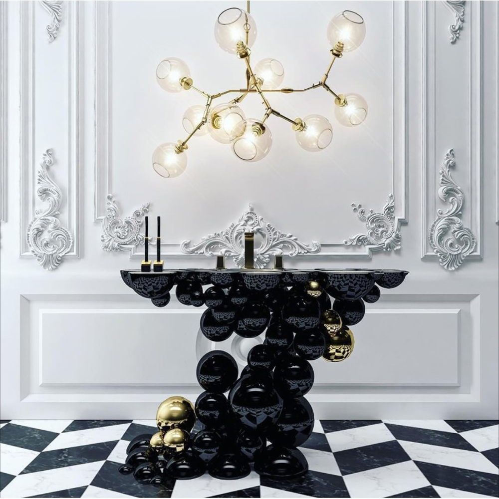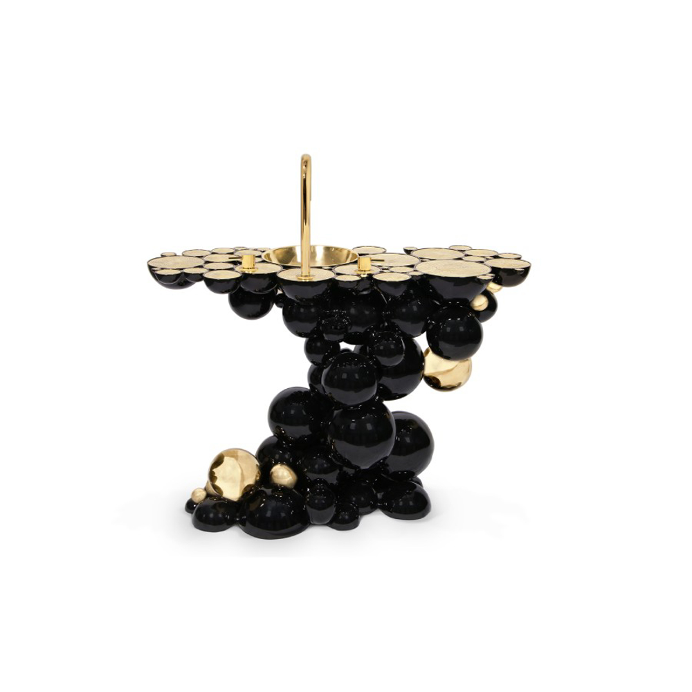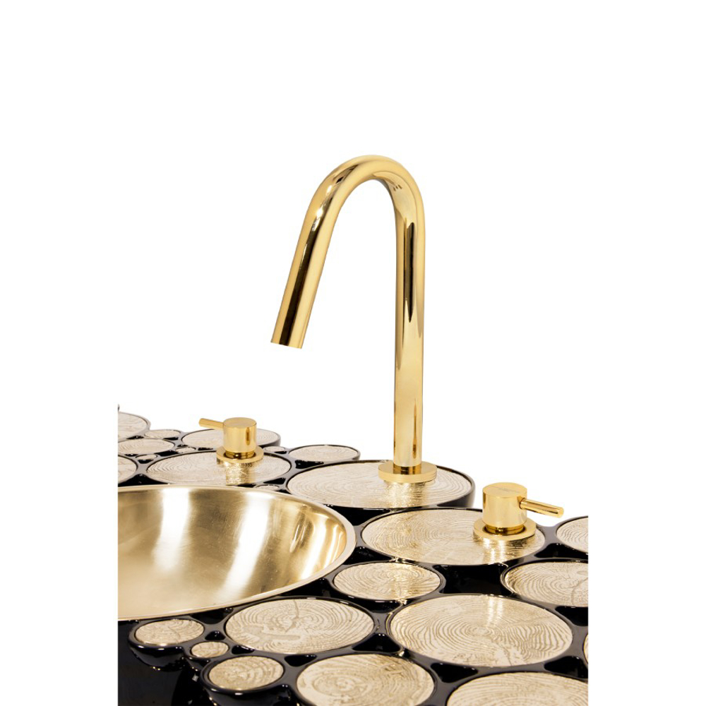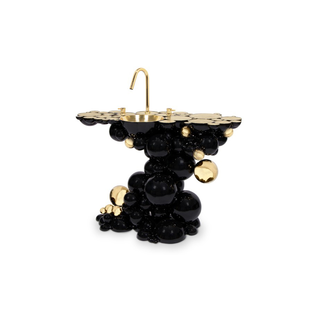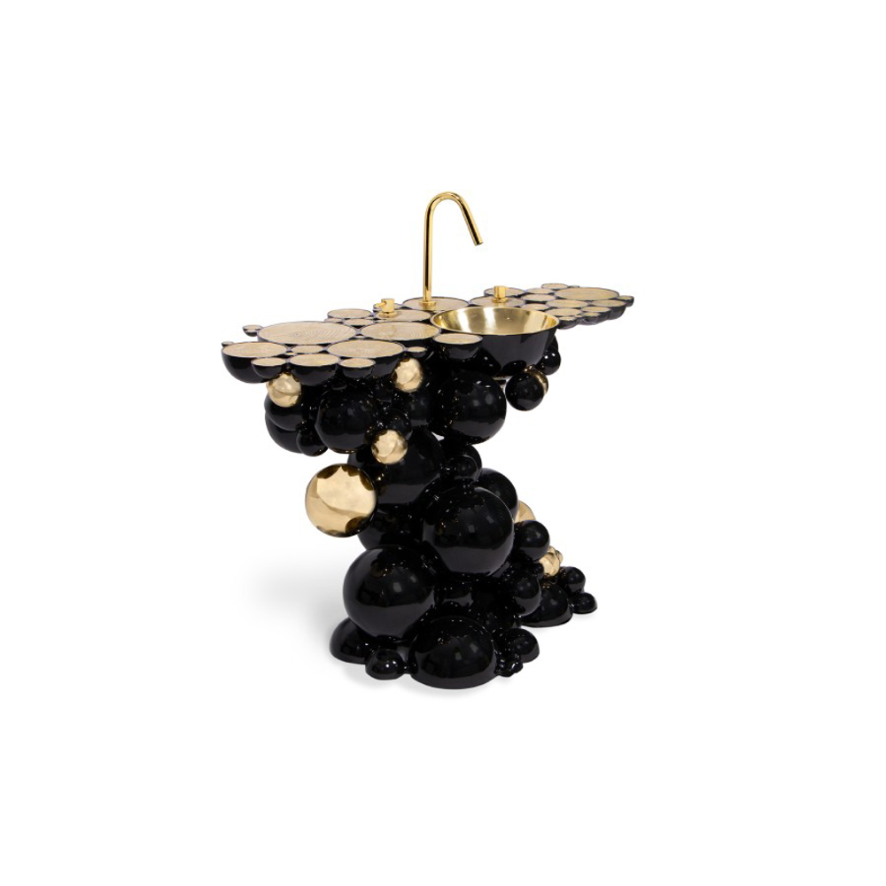 Structure: Casted aluminum, High gloss black lacquered | Polished Brass spheres, High gloss varnish; Top: Casted brass, High gloss varnish; Sink: Polished brass, High gloss varnish; Water drainage: Wall