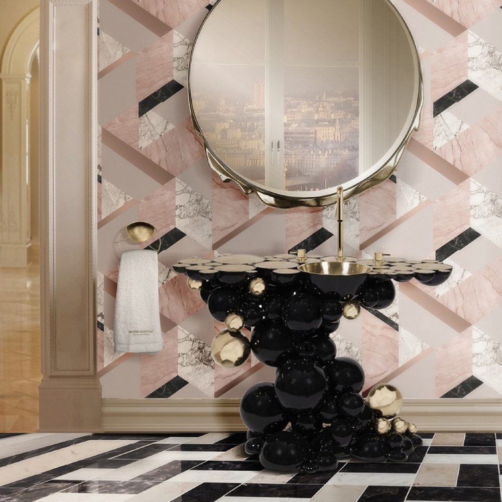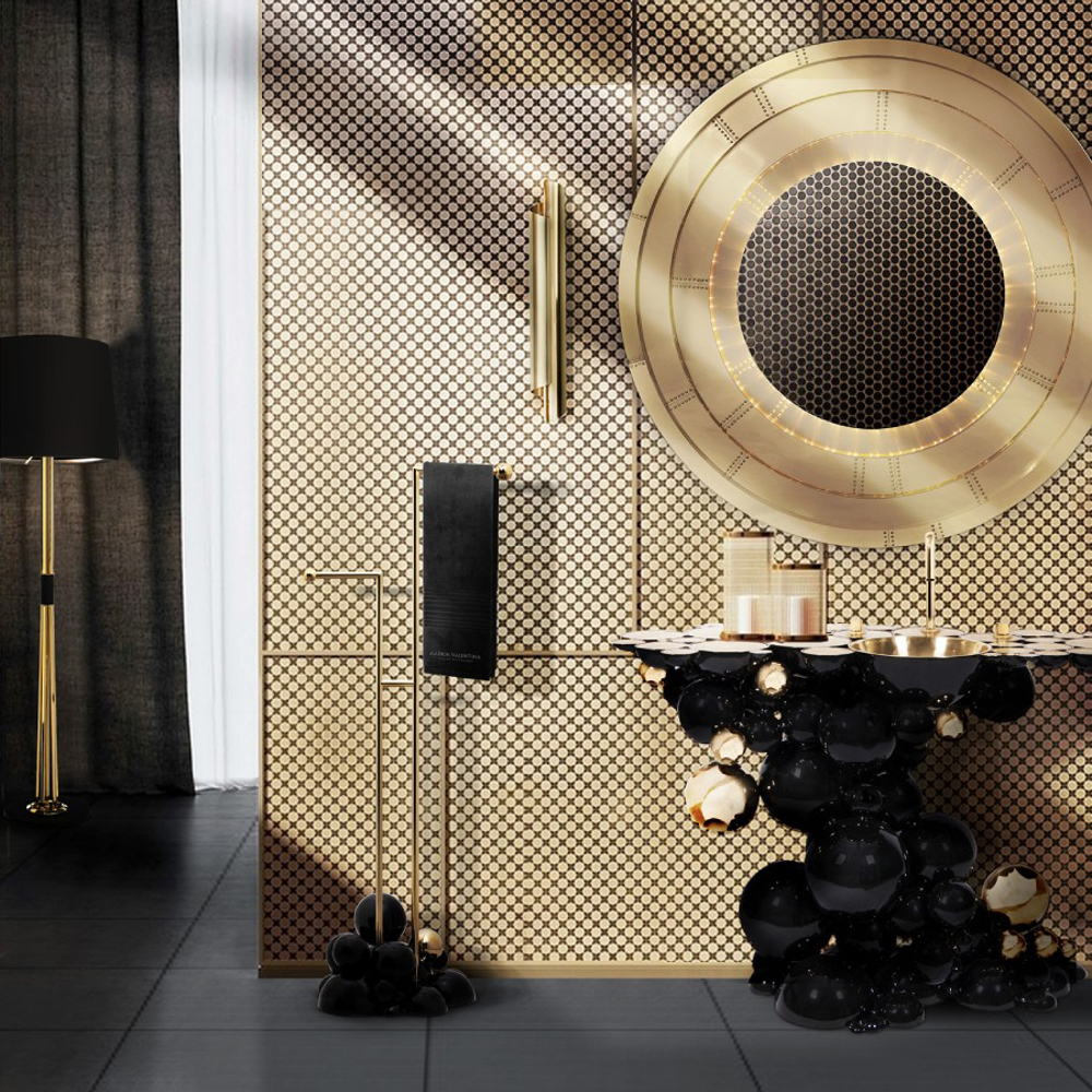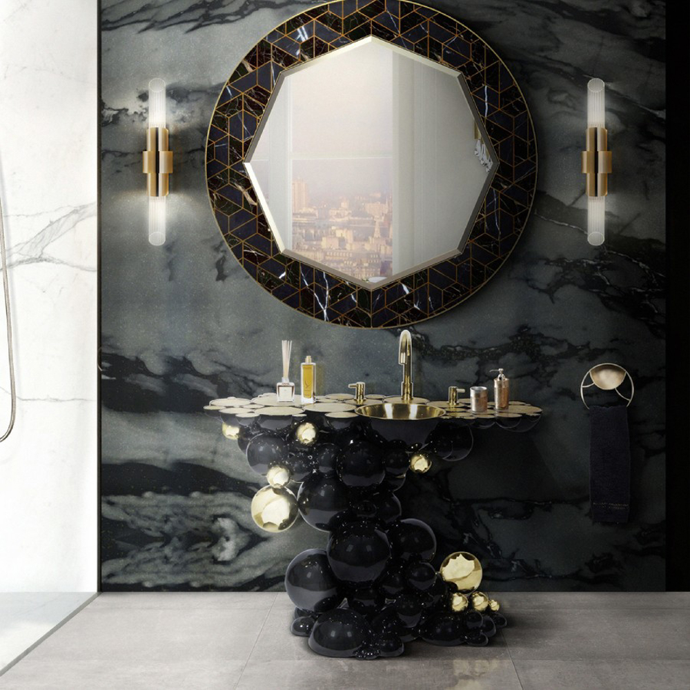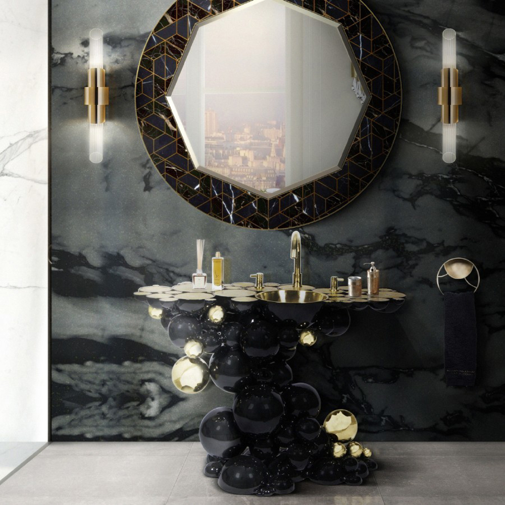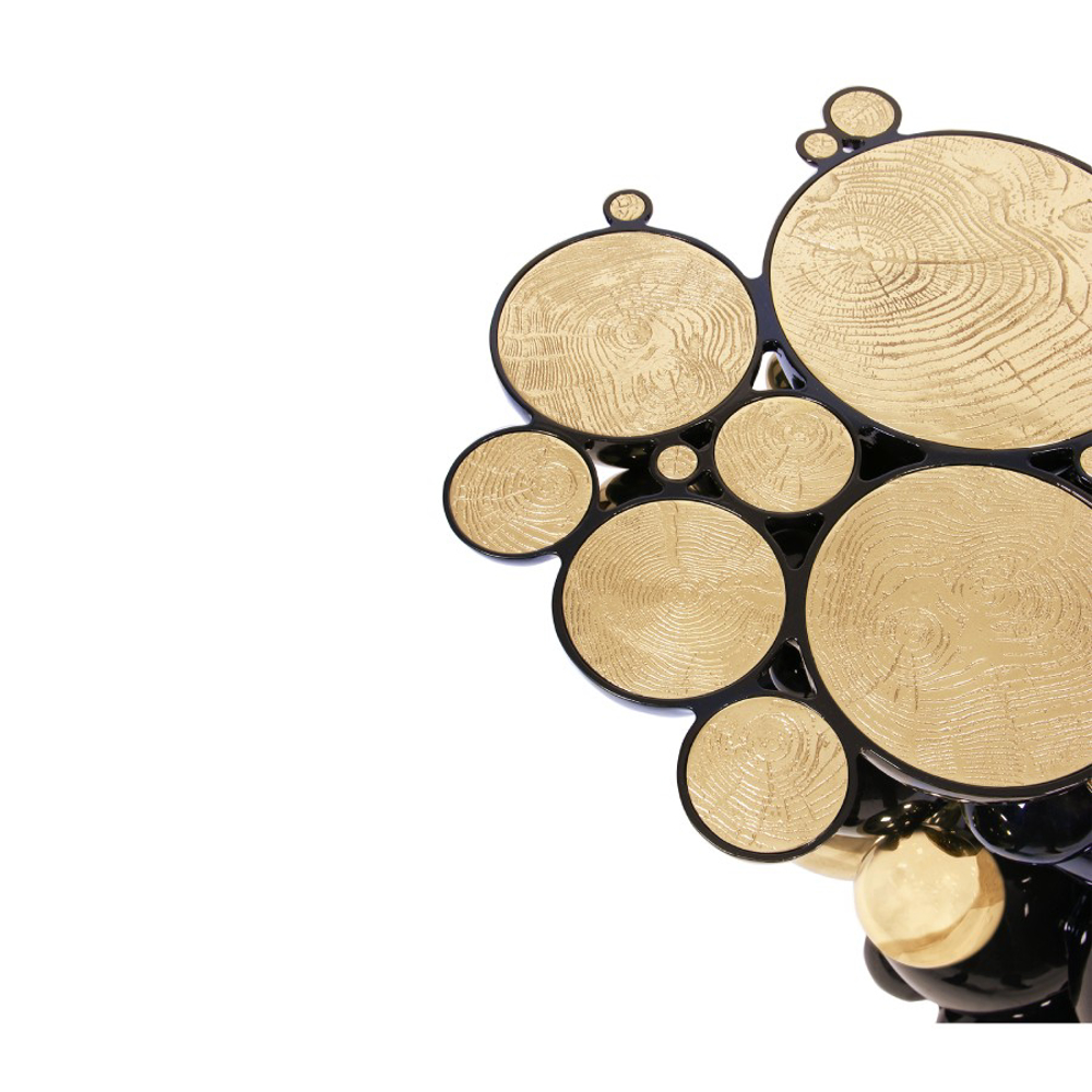 Structure: Casted aluminum, High gloss black lacquered | Polished Brass spheres, High gloss varnish; Top: Casted brass, High gloss varnish; Sink: Polished brass, High gloss varnish; Water drainage: Wall