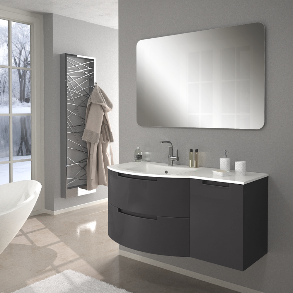 Bruna 43" wall-mounted vanity in glossy black, white, red, grey, slate, or sand. This includes the vanity piece, which has two soft-closing drawers, along with the Tekorlux (composite) sink top. Also, a right side cabinet, which has a soft closing door and a glass shelf. Hardware is included. Optional legs are available (model number: OA-AM-LEGS).