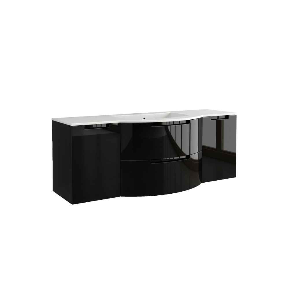 Bruna 57" wall-mounted vanity in glossy black, white, red, grey, slate, or sand. This includes the vanity piece, which has two soft-closing drawers, along with the Tekorlux (composite) sink top. Also, the left and right side cabinets, which have soft closing doors and one glass shelf each. Hardware is included. Optional legs are available (model number: OA-AM-LEGS).