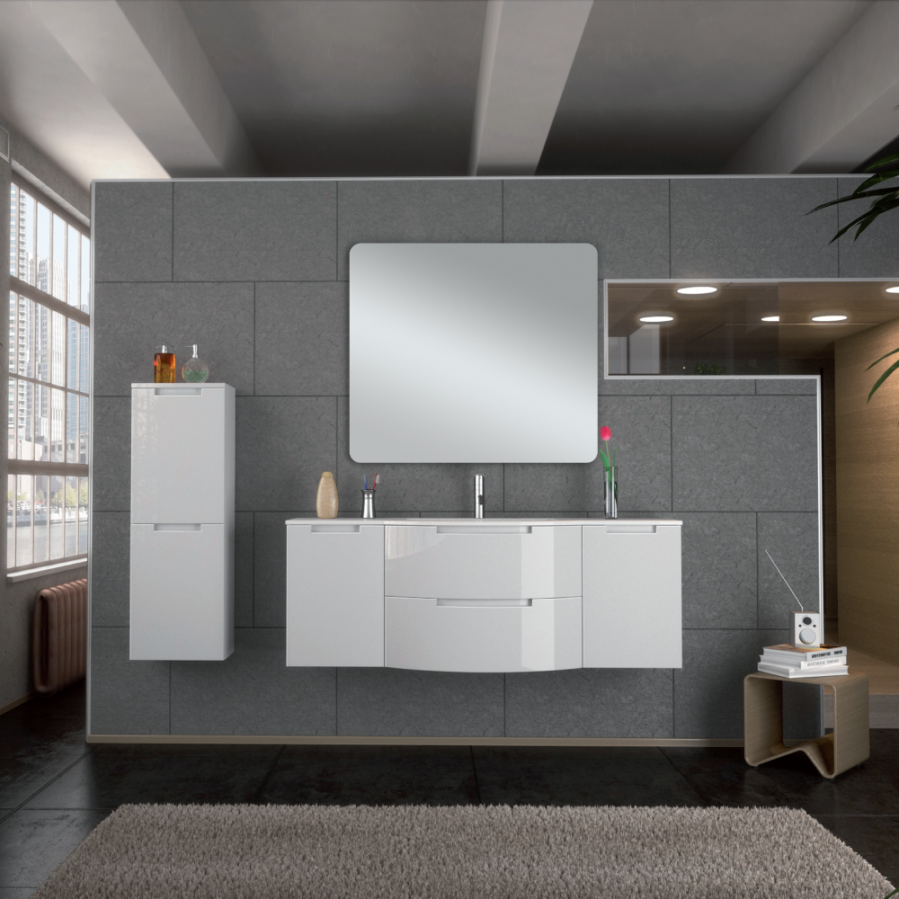 Bruna 57" wall-mounted vanity in glossy black, white, red, grey, slate, or sand. This includes the vanity piece, which has two soft-closing drawers, along with the Tekorlux (composite) sink top. Also, the left and right side cabinets, which have soft closing doors and one glass shelf each. Hardware is included. Optional legs are available (model number: OA-AM-LEGS).