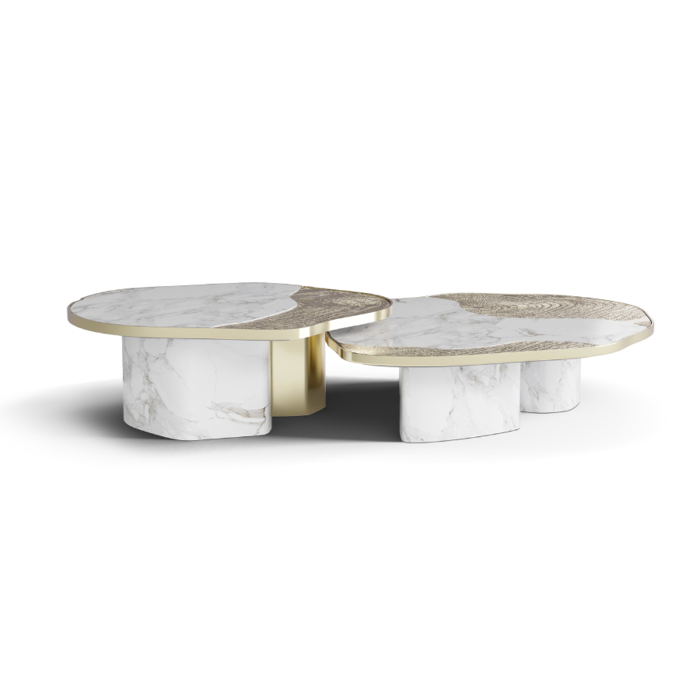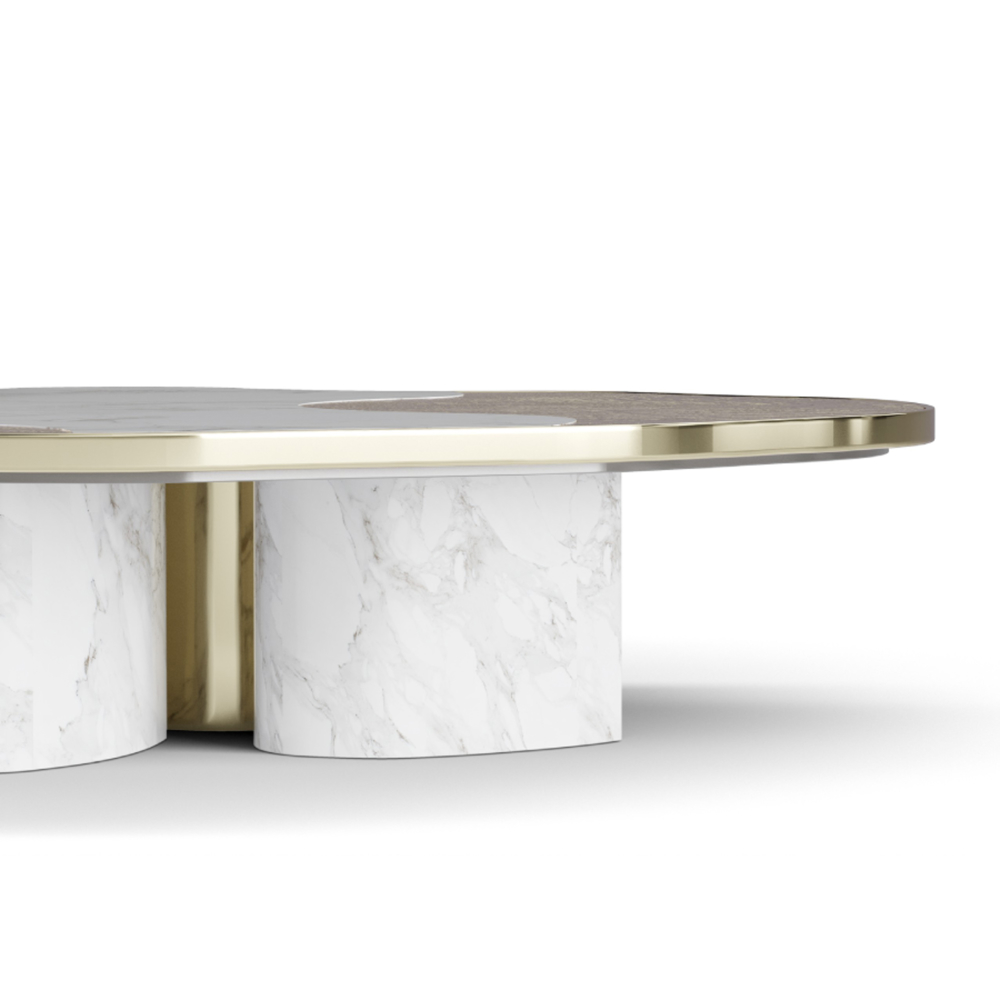 The Ophelia center table set is produced in Calacatta marble and casted brass with a gold plated finish.