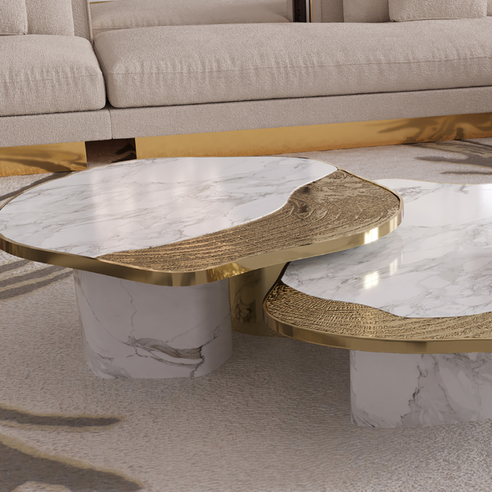 The Ophelia center table set is produced in Calacatta marble and casted brass with a gold plated finish.