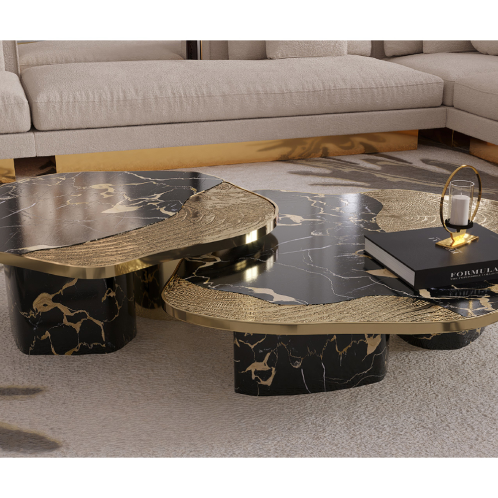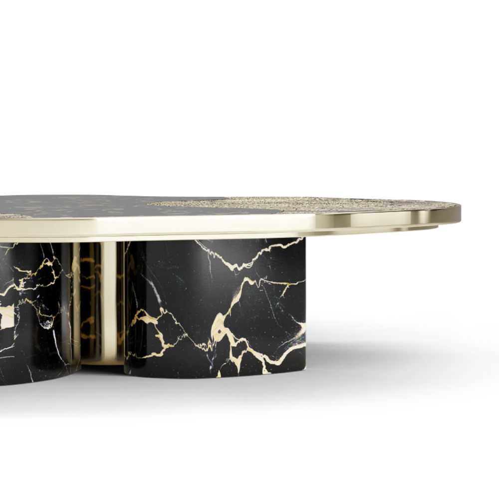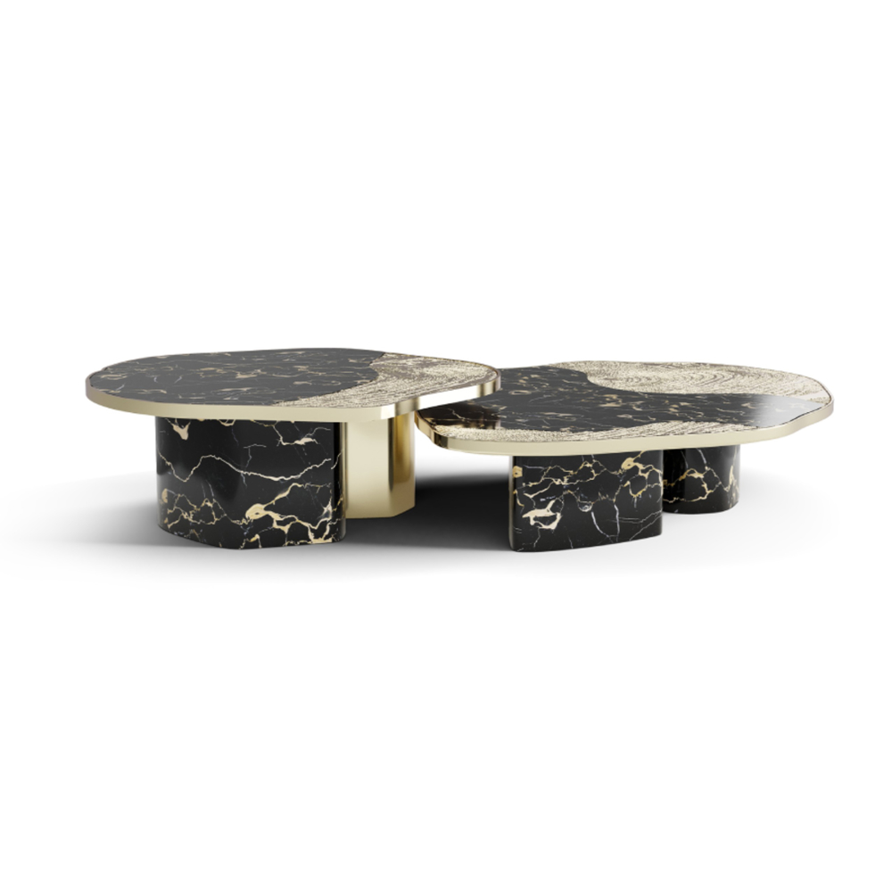 The Ophelia center table set is produced in Portoro marble and casted brass with a black nickel finish.