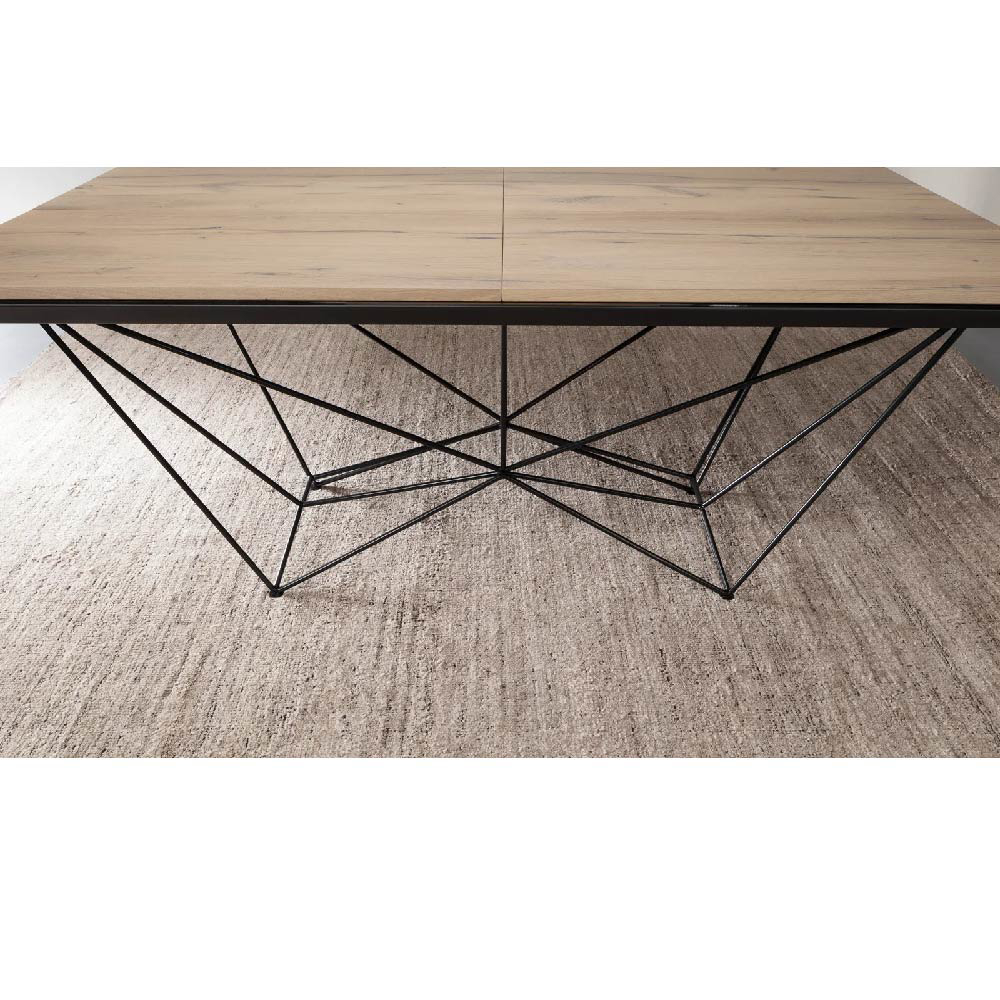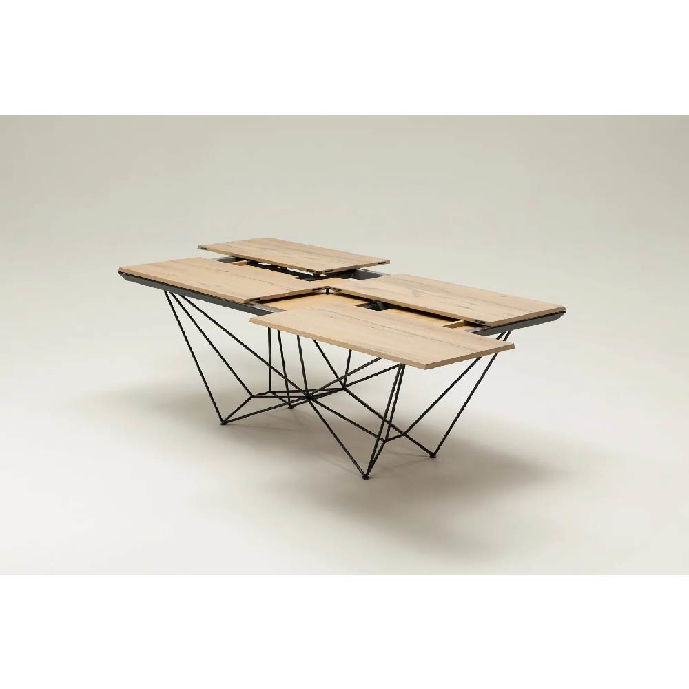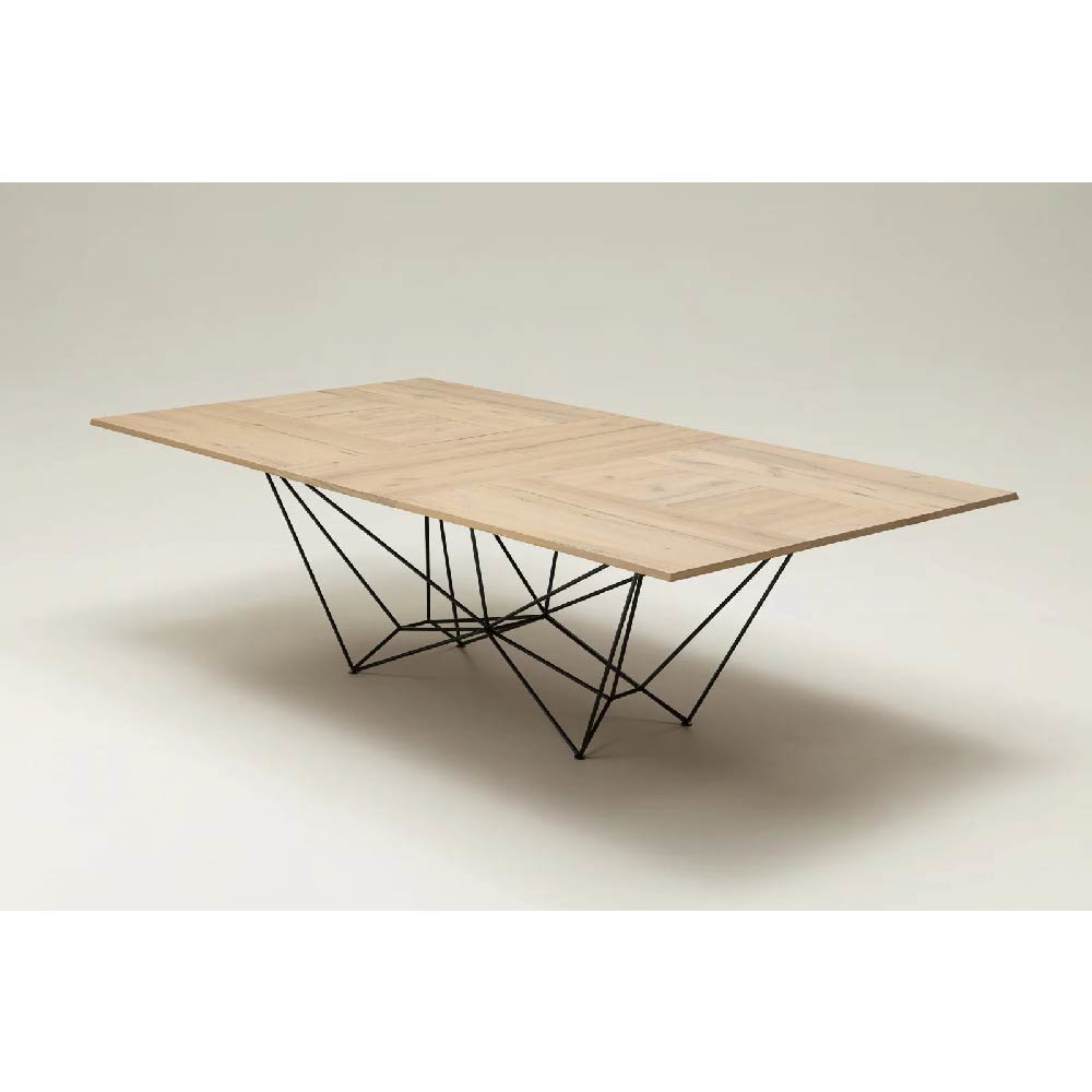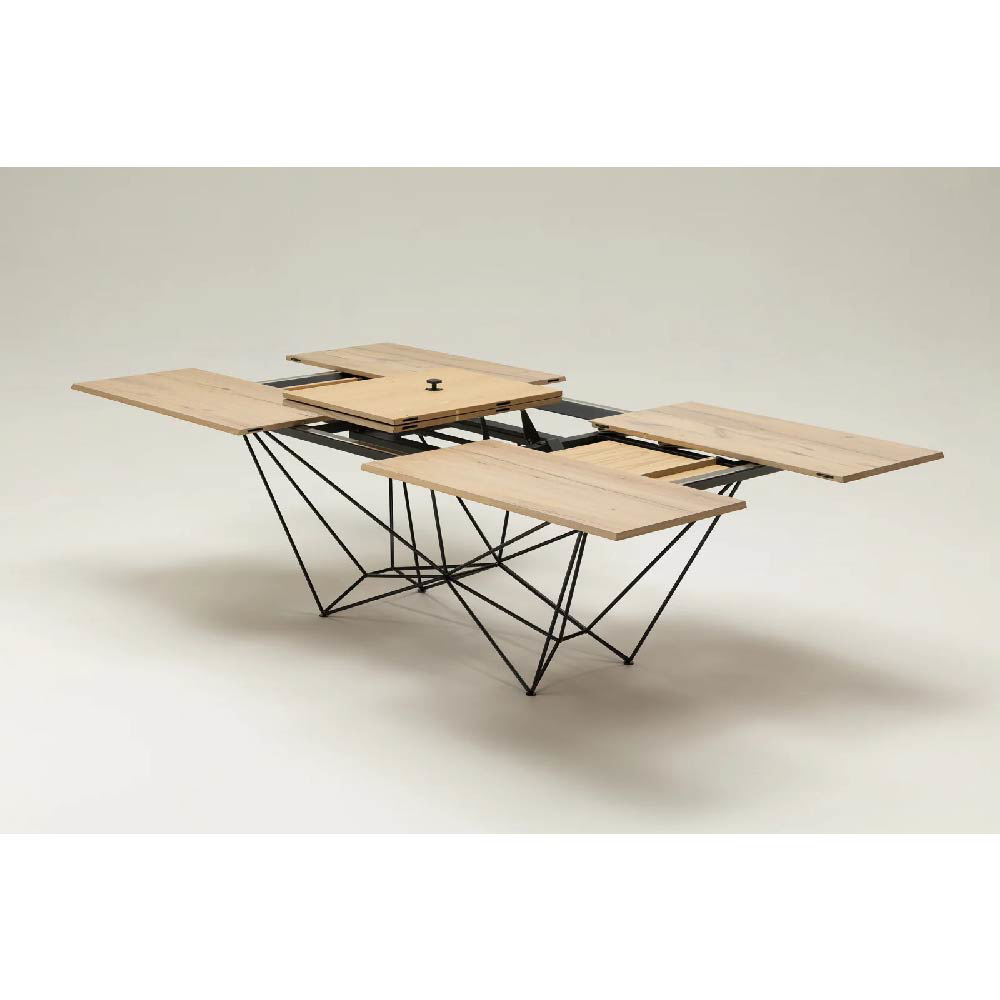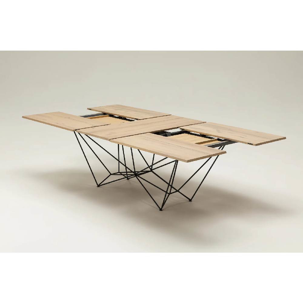 Extendable dining table with metal structure, wooden or cement top and extensions, metal sliding mechanism. Designer: Giulio Manzoni