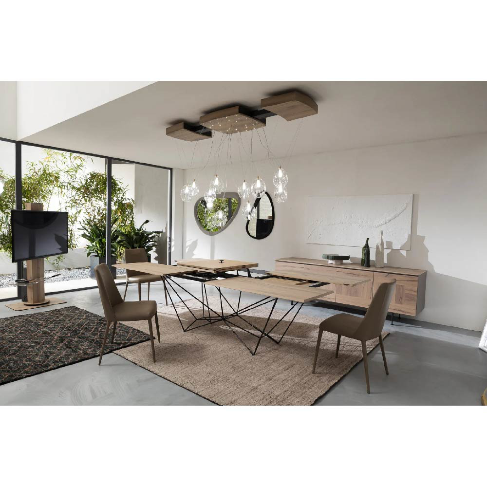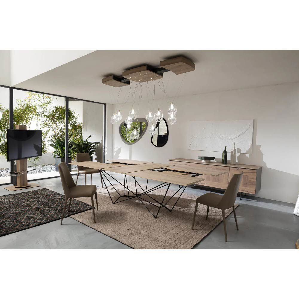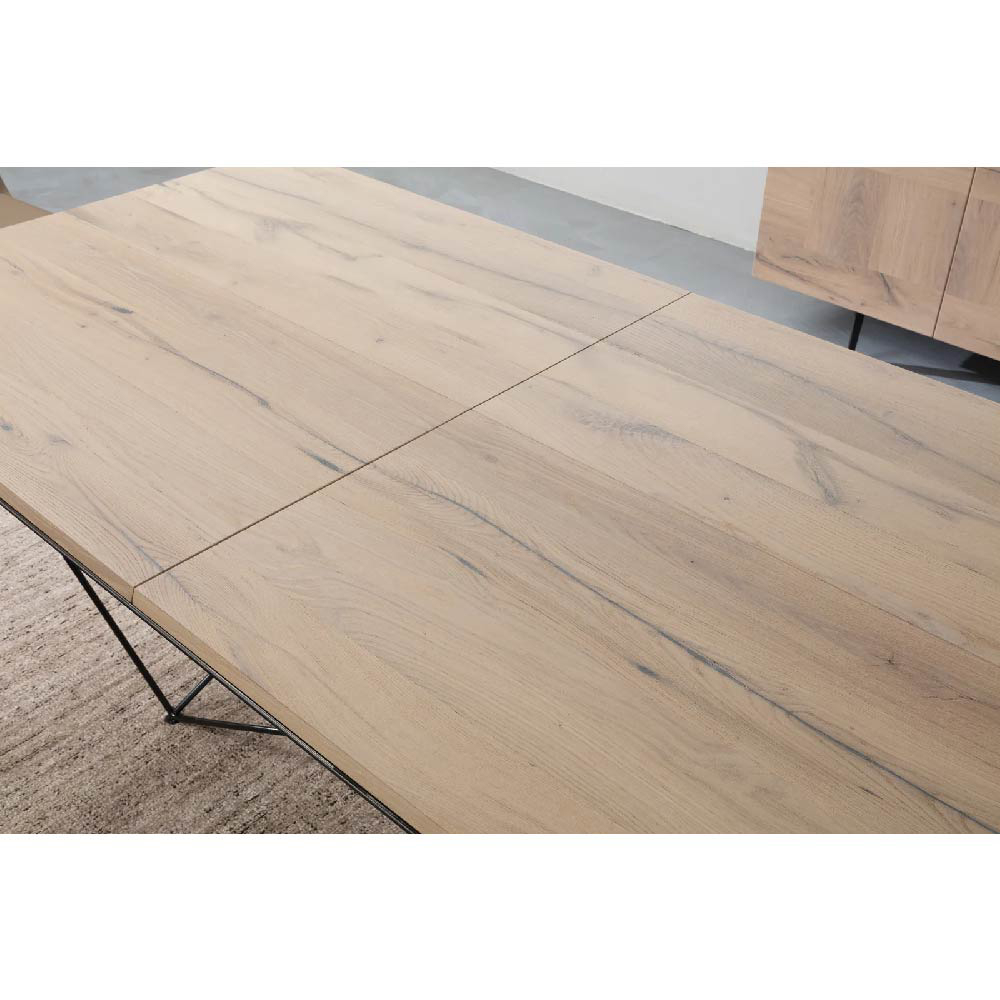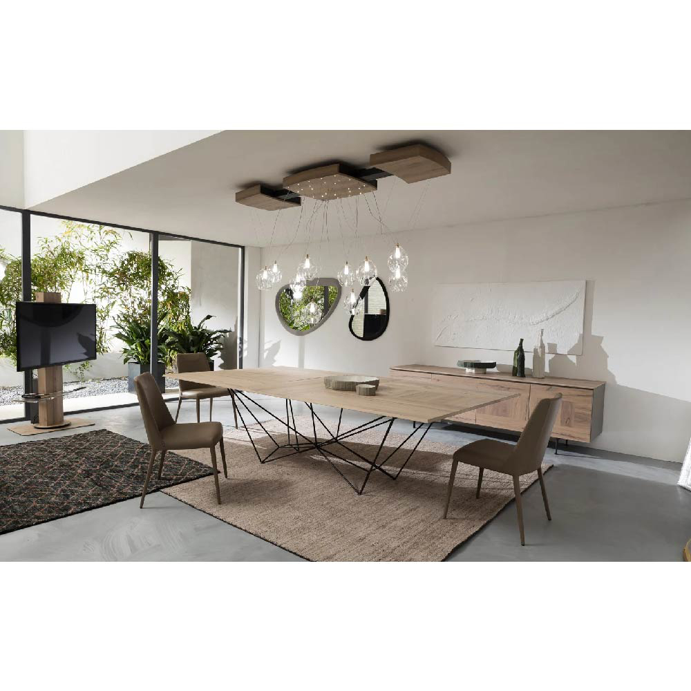 Extendable dining table with metal structure, wooden or cement top and extensions, metal sliding mechanism. Designer: Giulio Manzoni