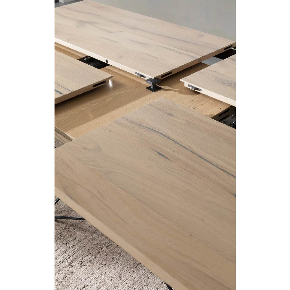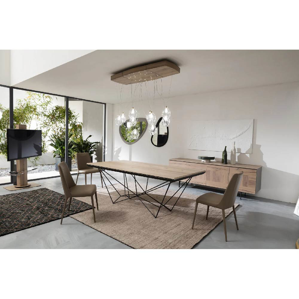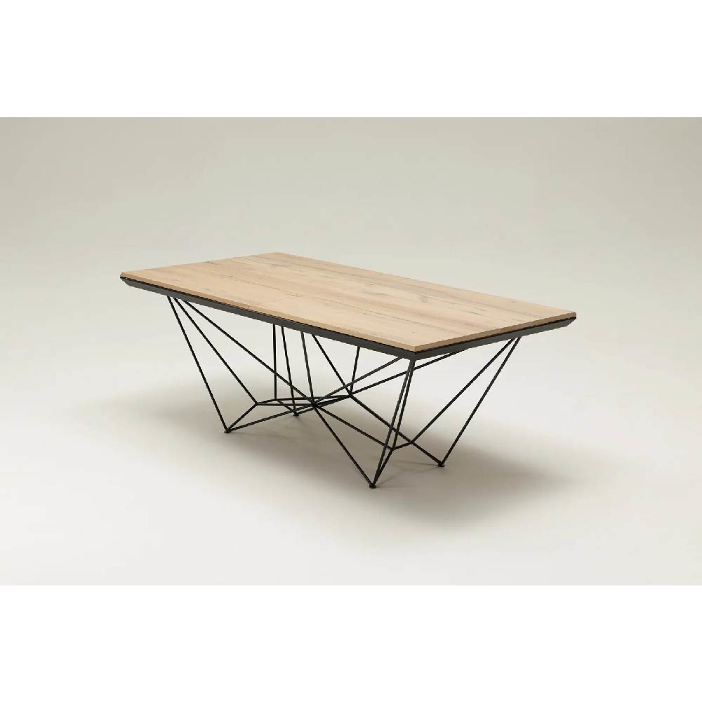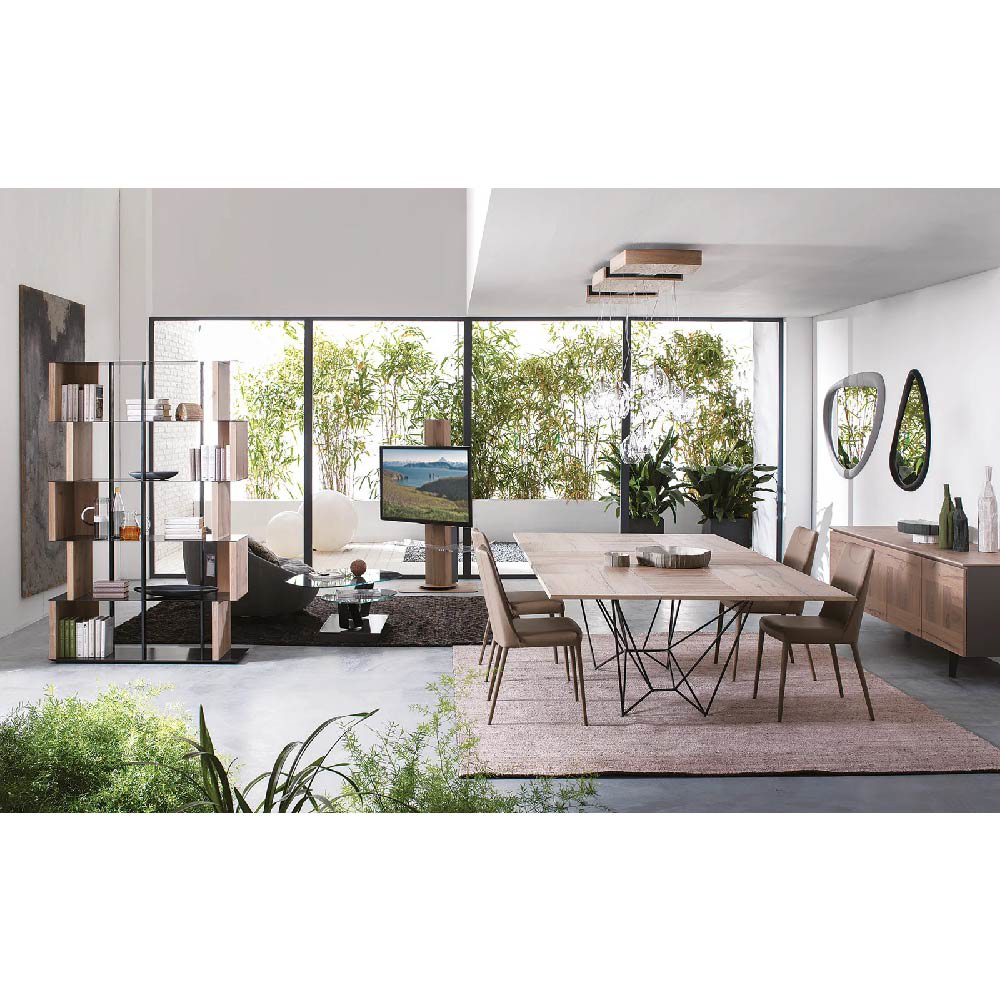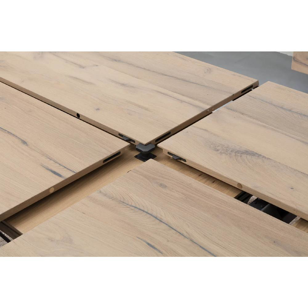 Extendable dining table with metal structure, wooden or cement top and extensions, metal sliding mechanism. Designer: Giulio Manzoni