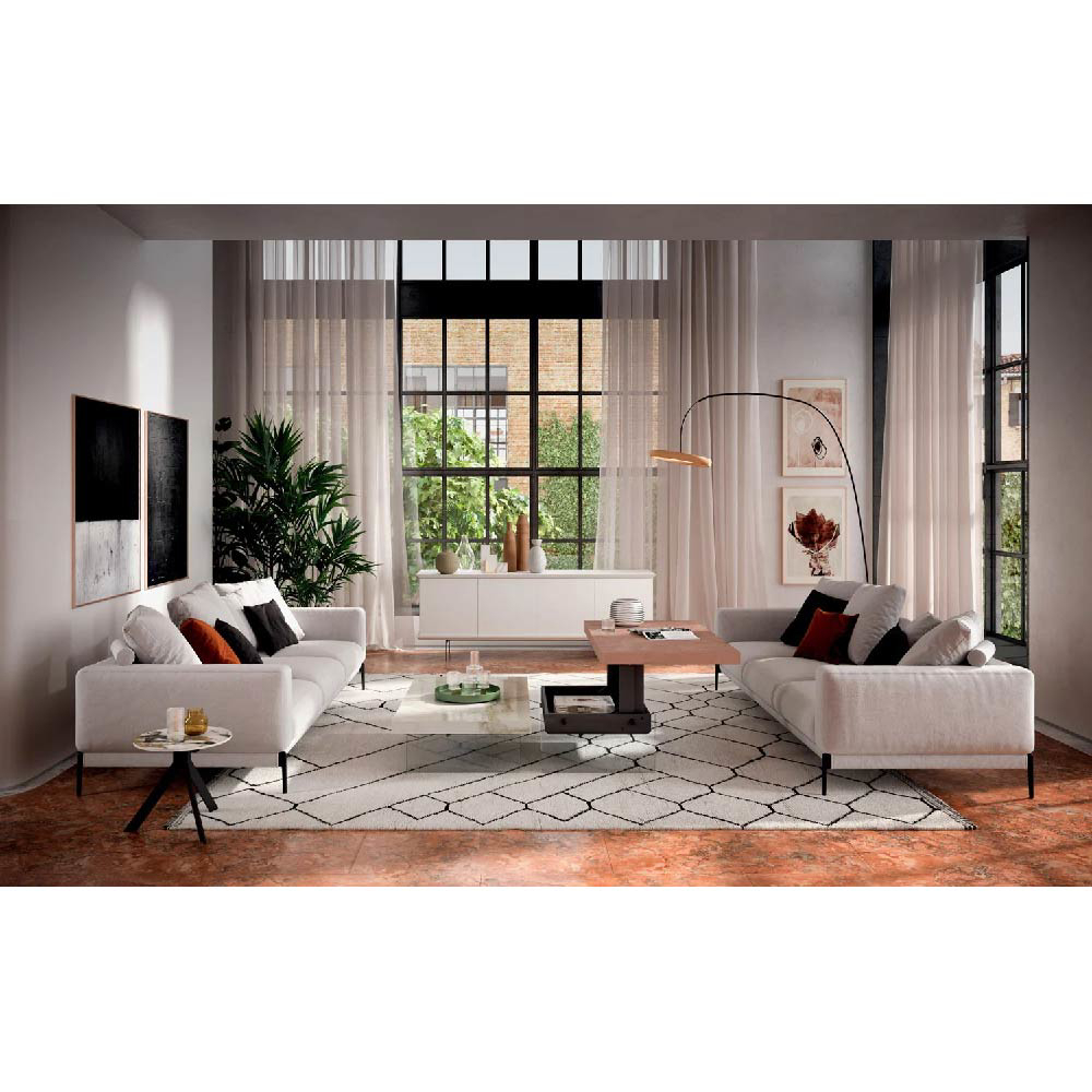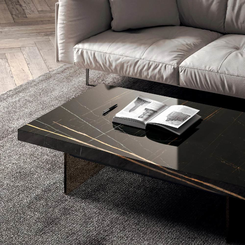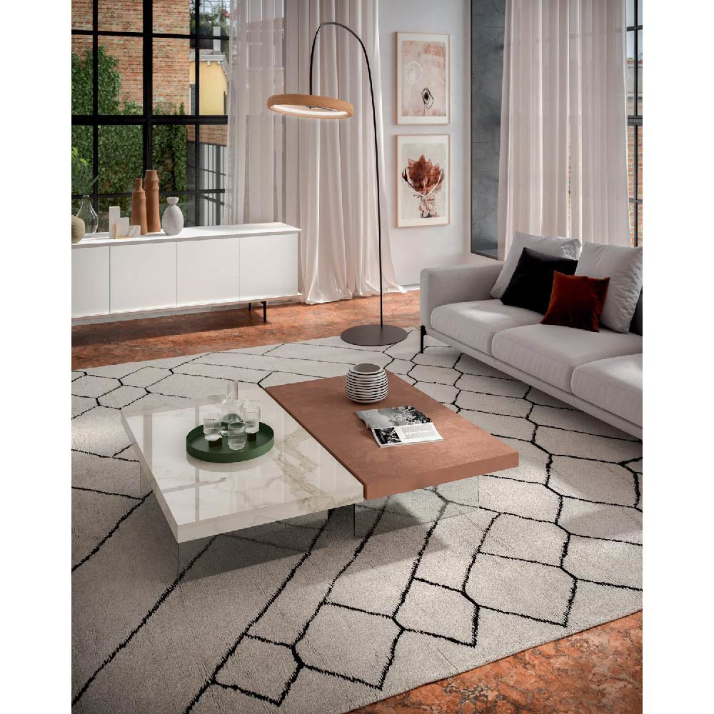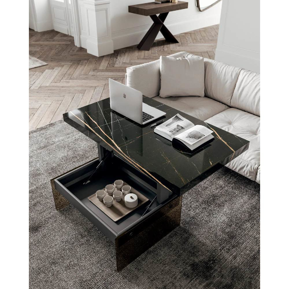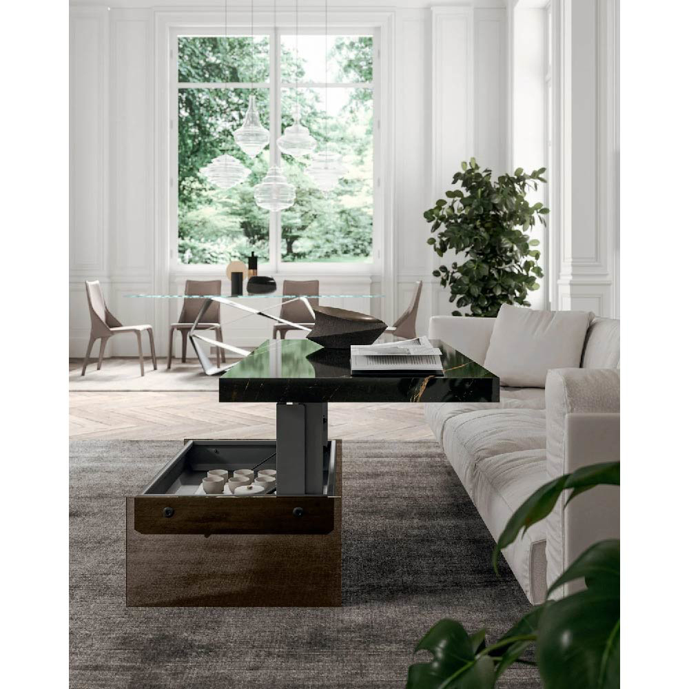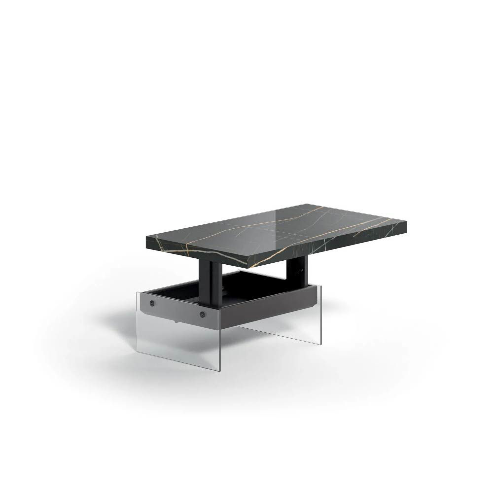 Two-heights (cm 32>cm 65) transformable coffee-table with metal structure, natural stone layer, marble glass or wooden top and crystal legs. Self-braking gas-lifting device.