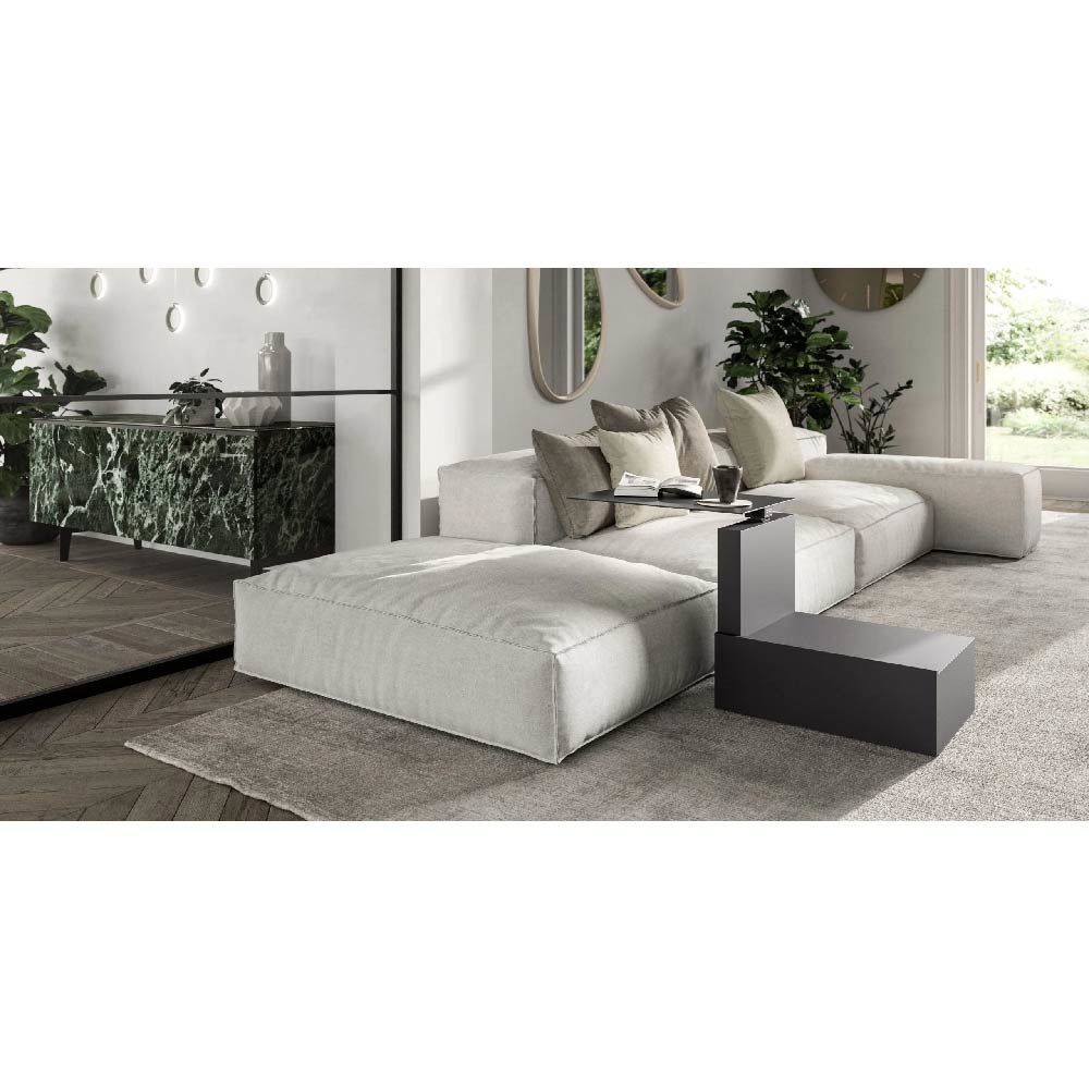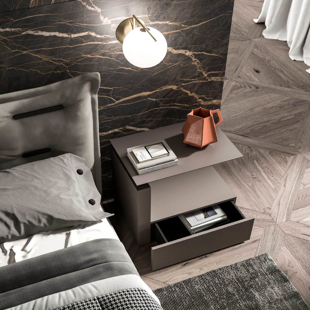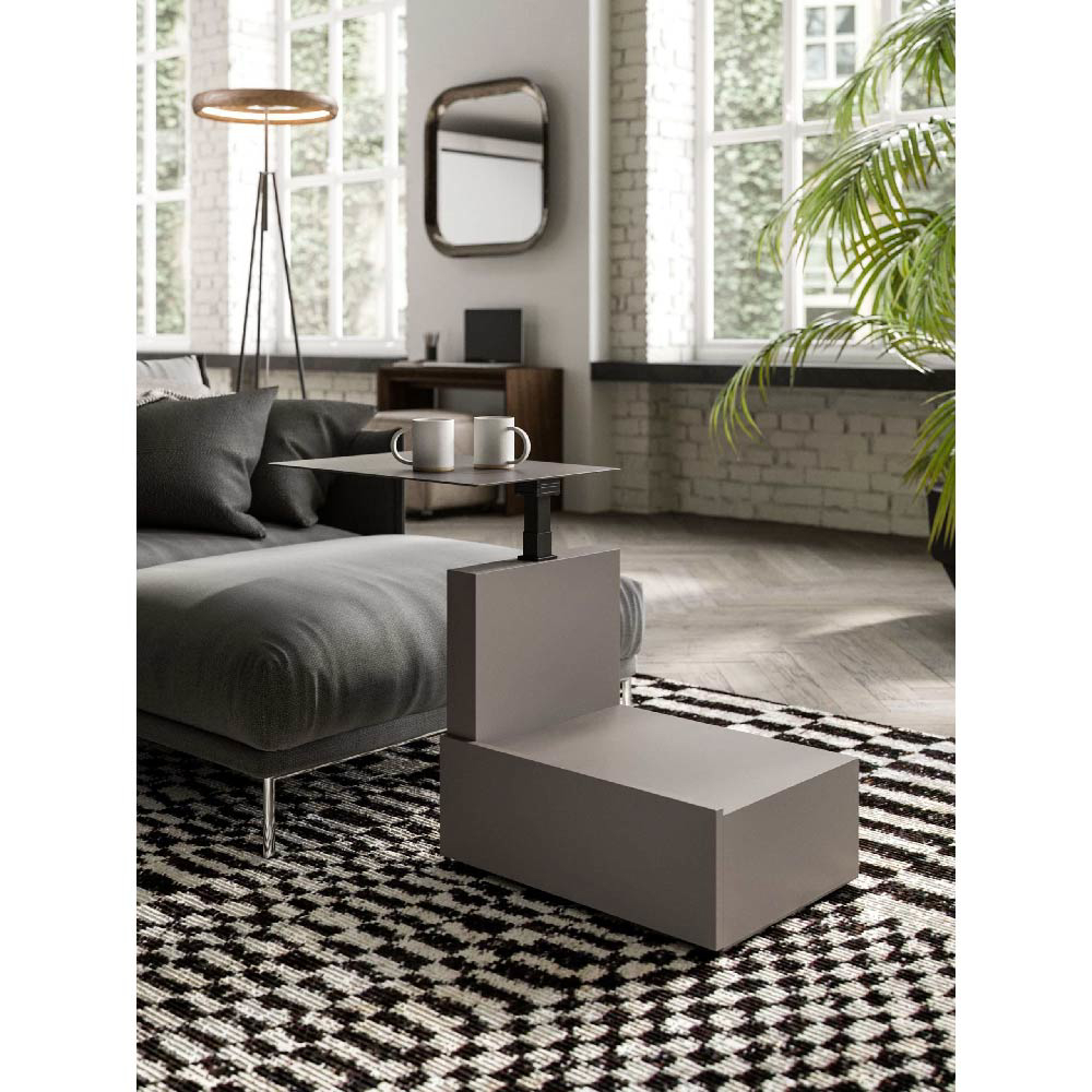 Bedside or sofa side table, adjustable in height and with 360° top rotation. Metal top, column and drawer in closed-pore lacquer.
