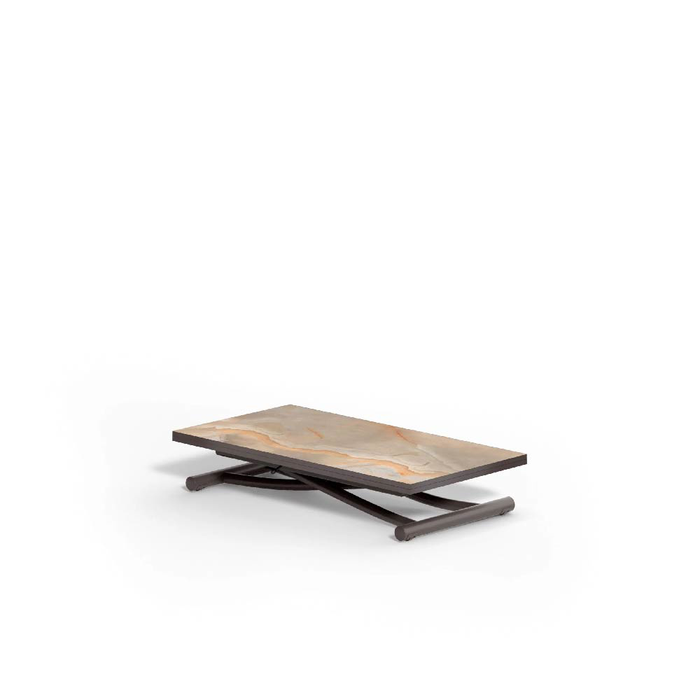 Transformable couch table; it turns into a dining table. Glass and marble glass folding doubling top. Metal base, gas lifting device. Adjustable at any height. Hidden wheels Designer: Studio Ozeta