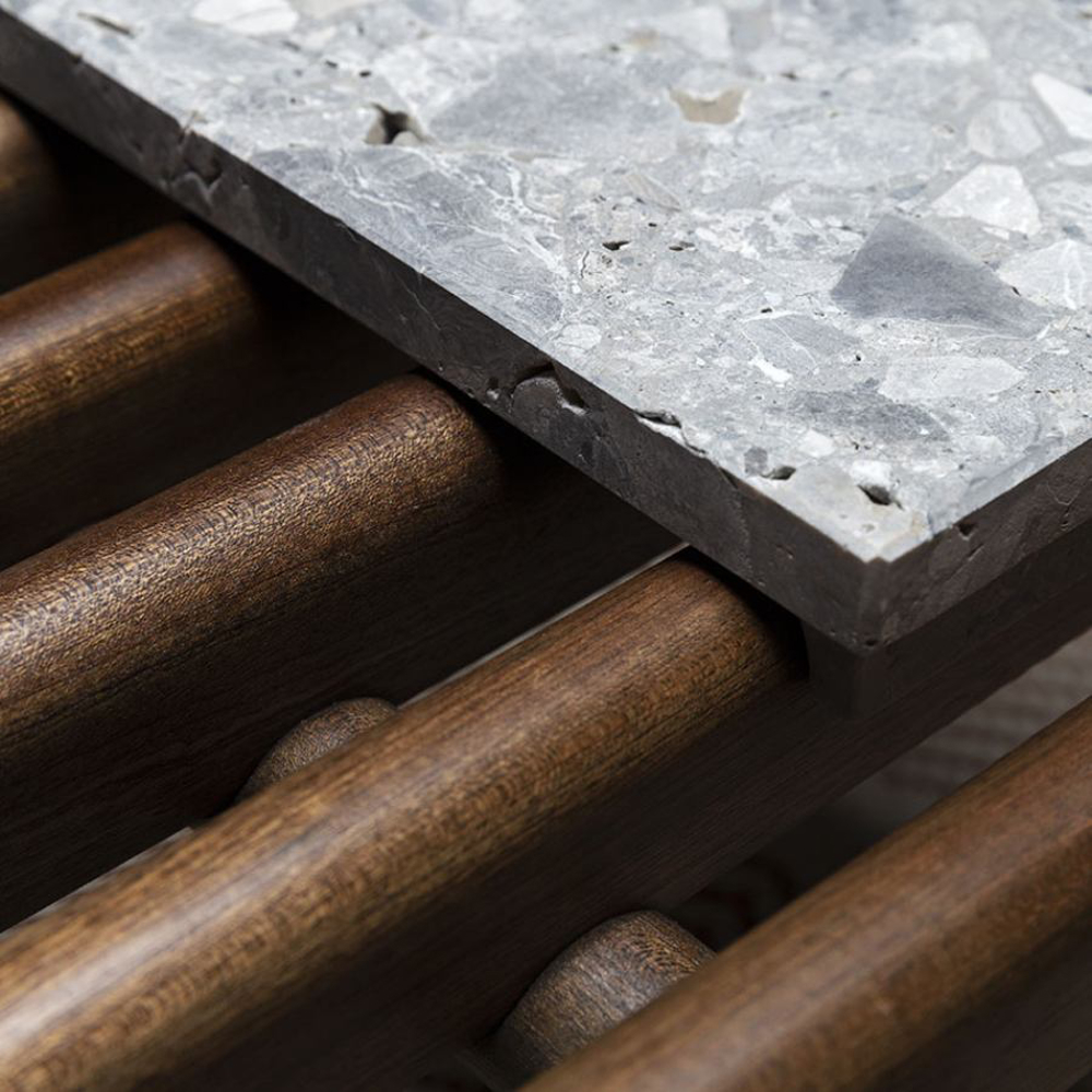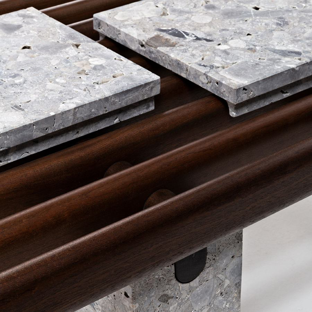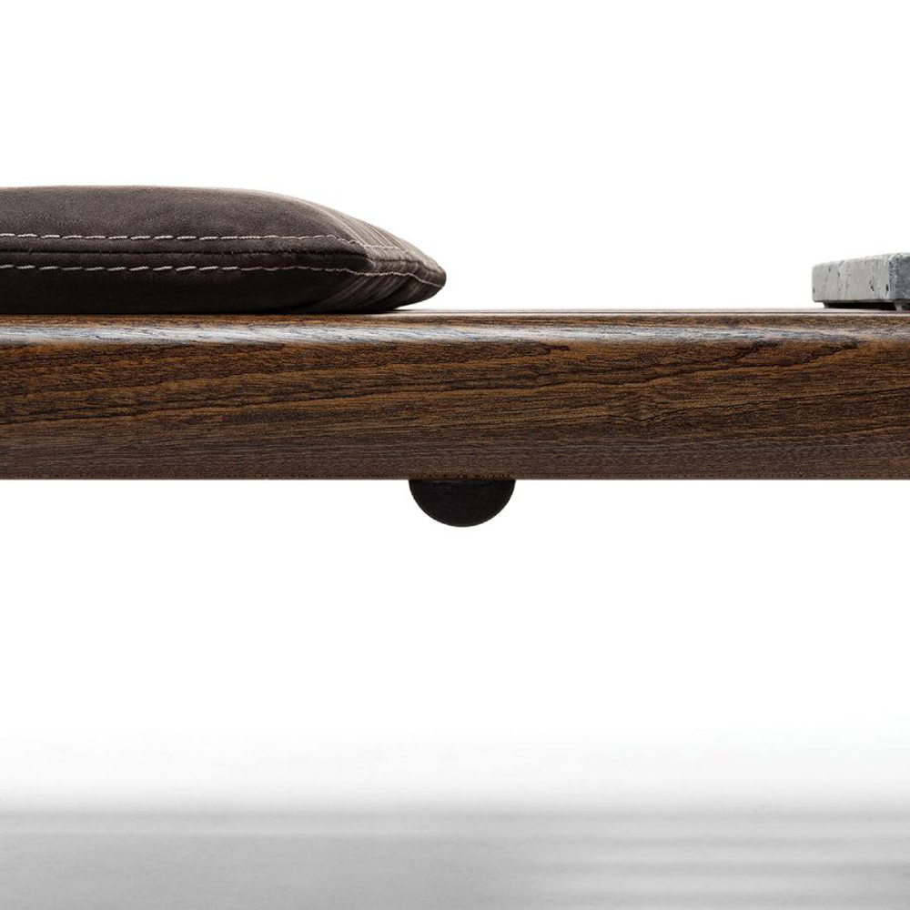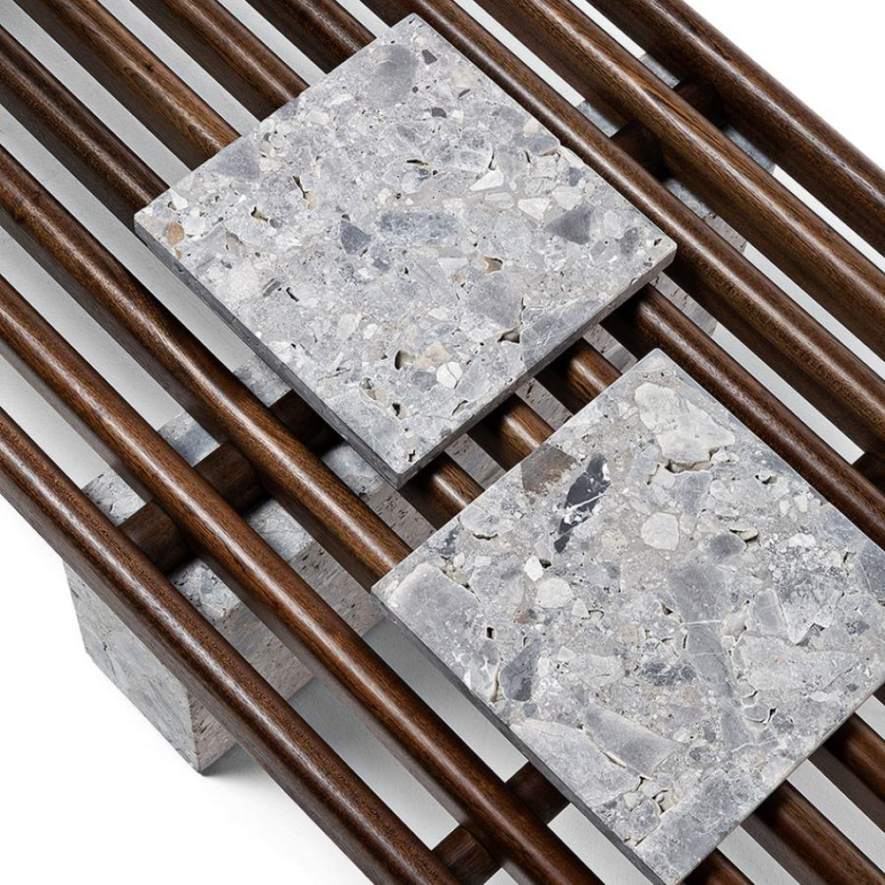 Available in Leaf Rust, Arabesco Orobico Red, Steven Black, Olimpo Striato, Ostuni Travertine and Ceppo Stone finishes, the marble tiles become an original tray. The cushions, available in fabric or leather, are interchangeable to offer maximum functionality and transform to meet every style requirement.