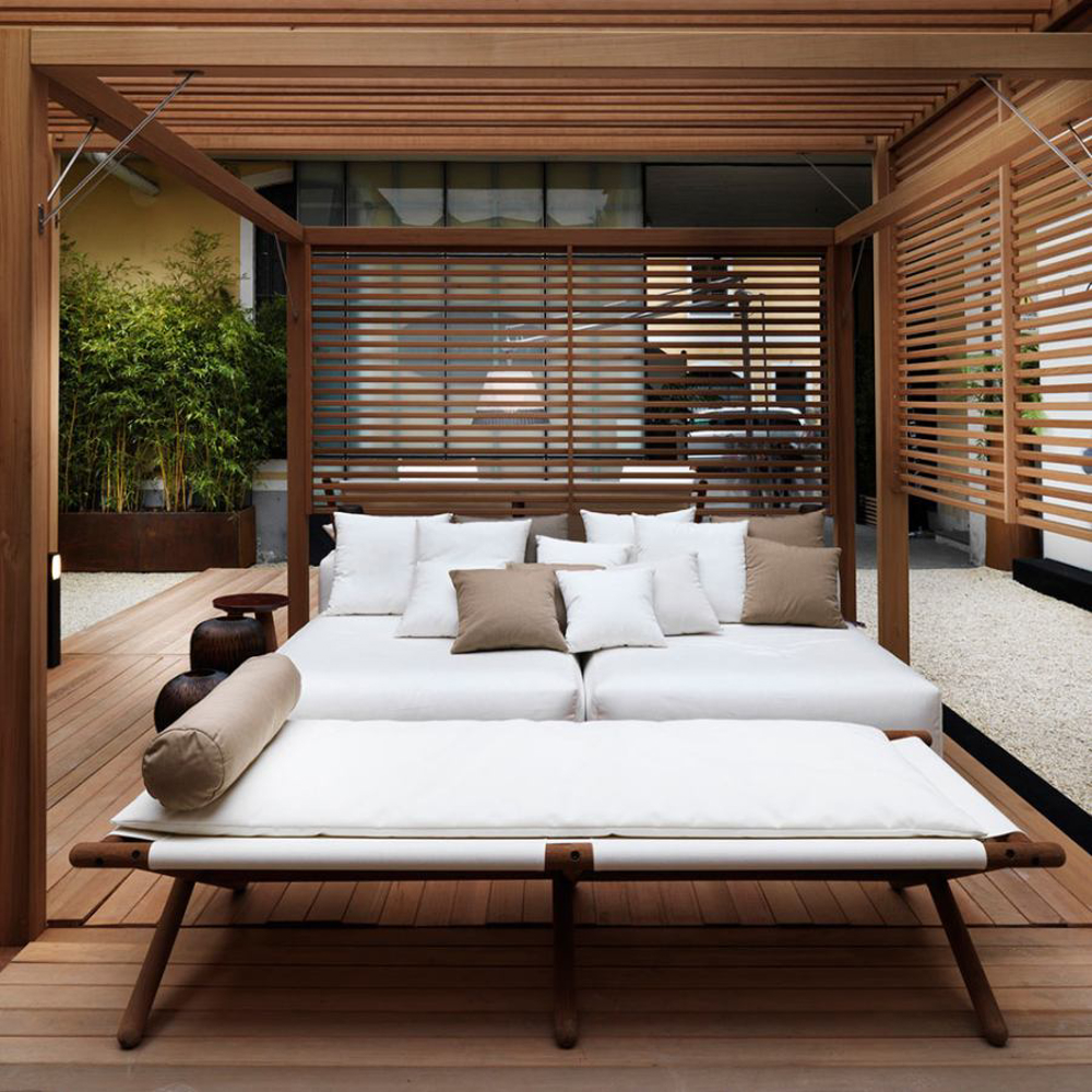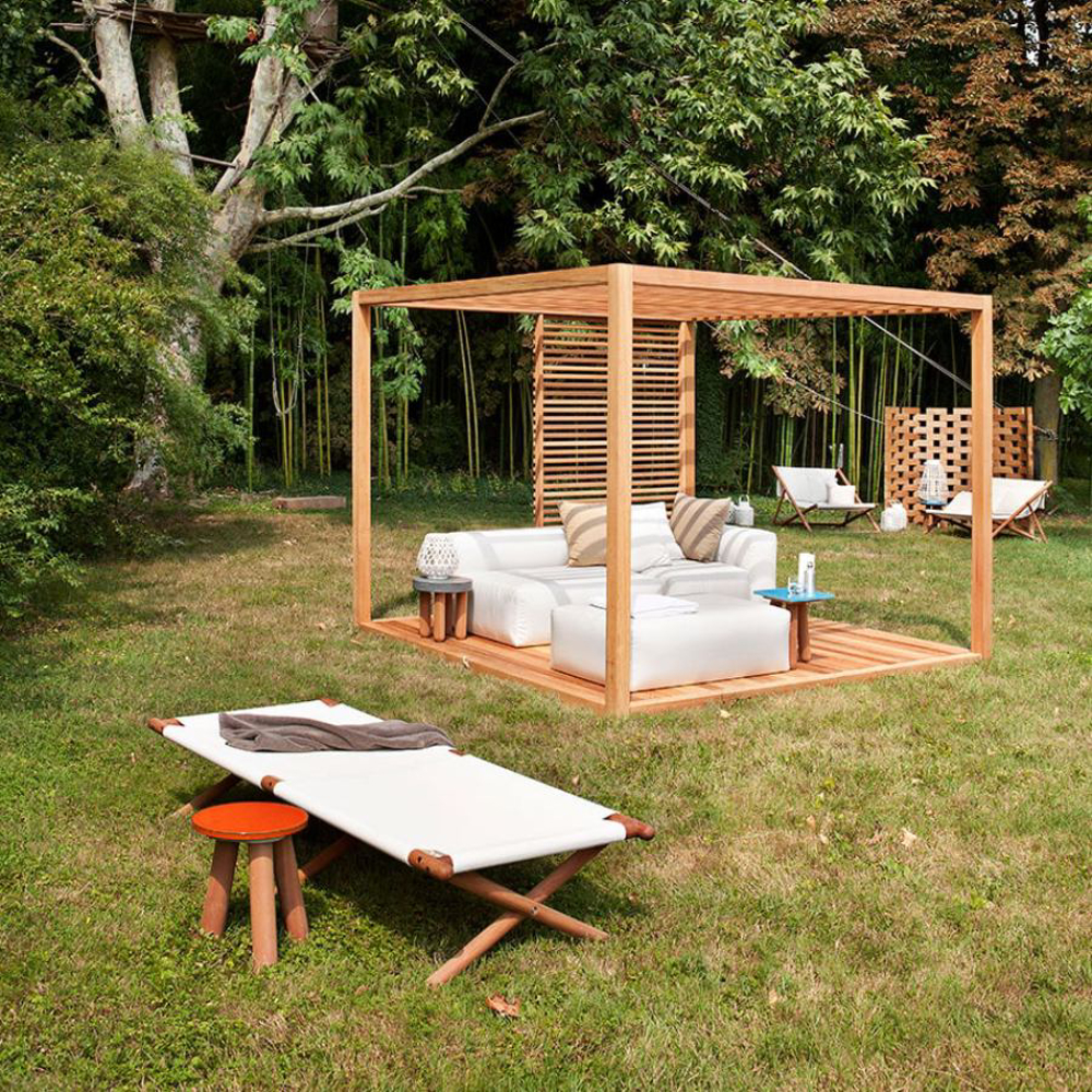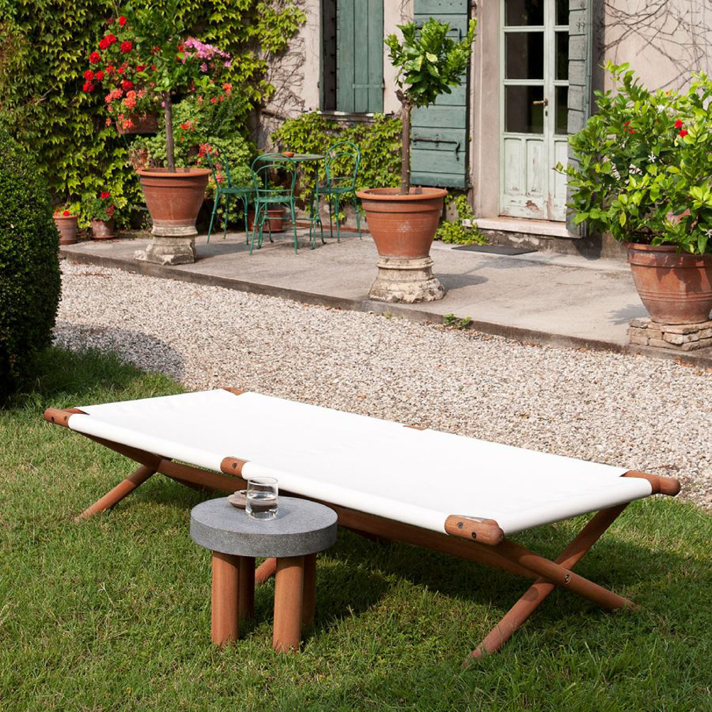 “Stessa spiaggia, stesso mare”: the essential design of Paraggi Camp Bed is inspired by the notes of the Italian summers of the Sixties. The frame of the elegant sunbed is handmade in solid Sapelli mahogany. Available in fabric and treated leather for outdoor use, it can be equipped with the soft “Comfort” cushion.