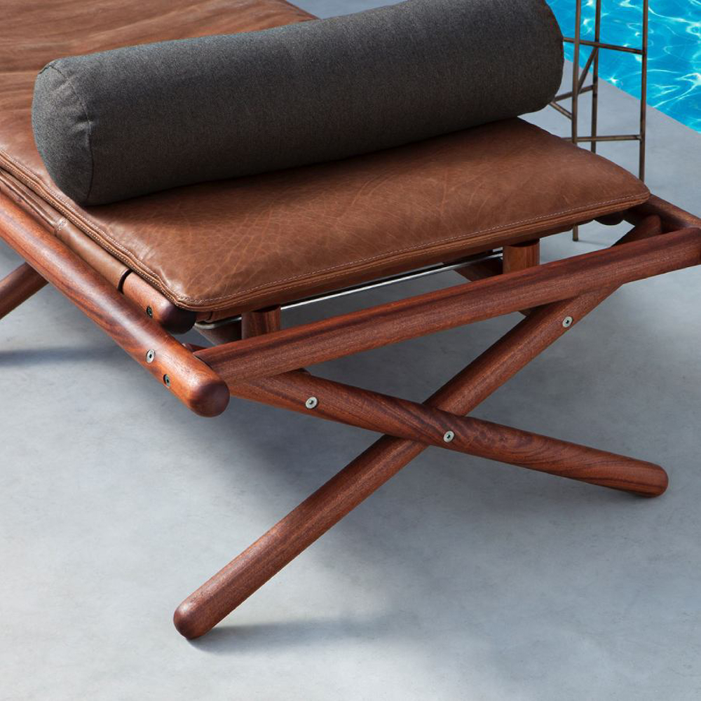 Entirely handmade in solid Sapelli mahogany, the seat frame is made even more pleasant by a reclining backrest, designed to accommodate any need for comfort. The structural weaves are upholstered in fabric or leather with the possibility of adding the soft "Comfort" cushioning.
