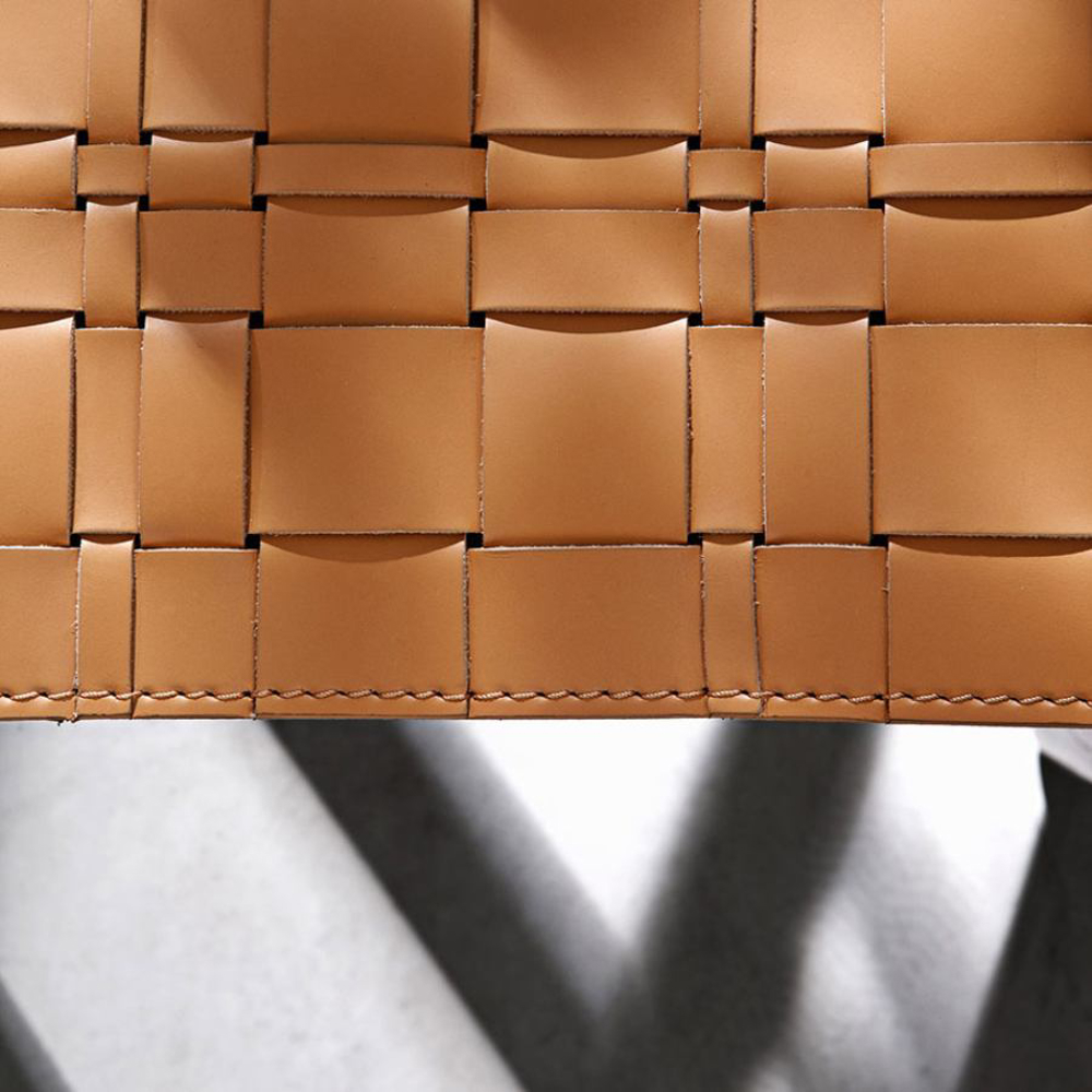 The geometric design of the Sapelli mahogany frame frames the seat, available in woven leather or outdoor fabric.