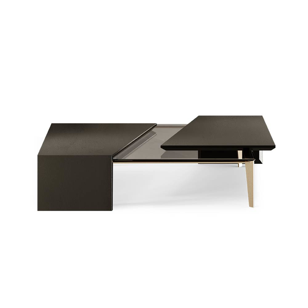 The minimalist aesthetic of the architect John Pawson is exalted in this center table. The pivot of the whole structure concentrates on a sleek rectangular glass supported by brass feet, on which converge two opposite structures, adding more character to the piece.