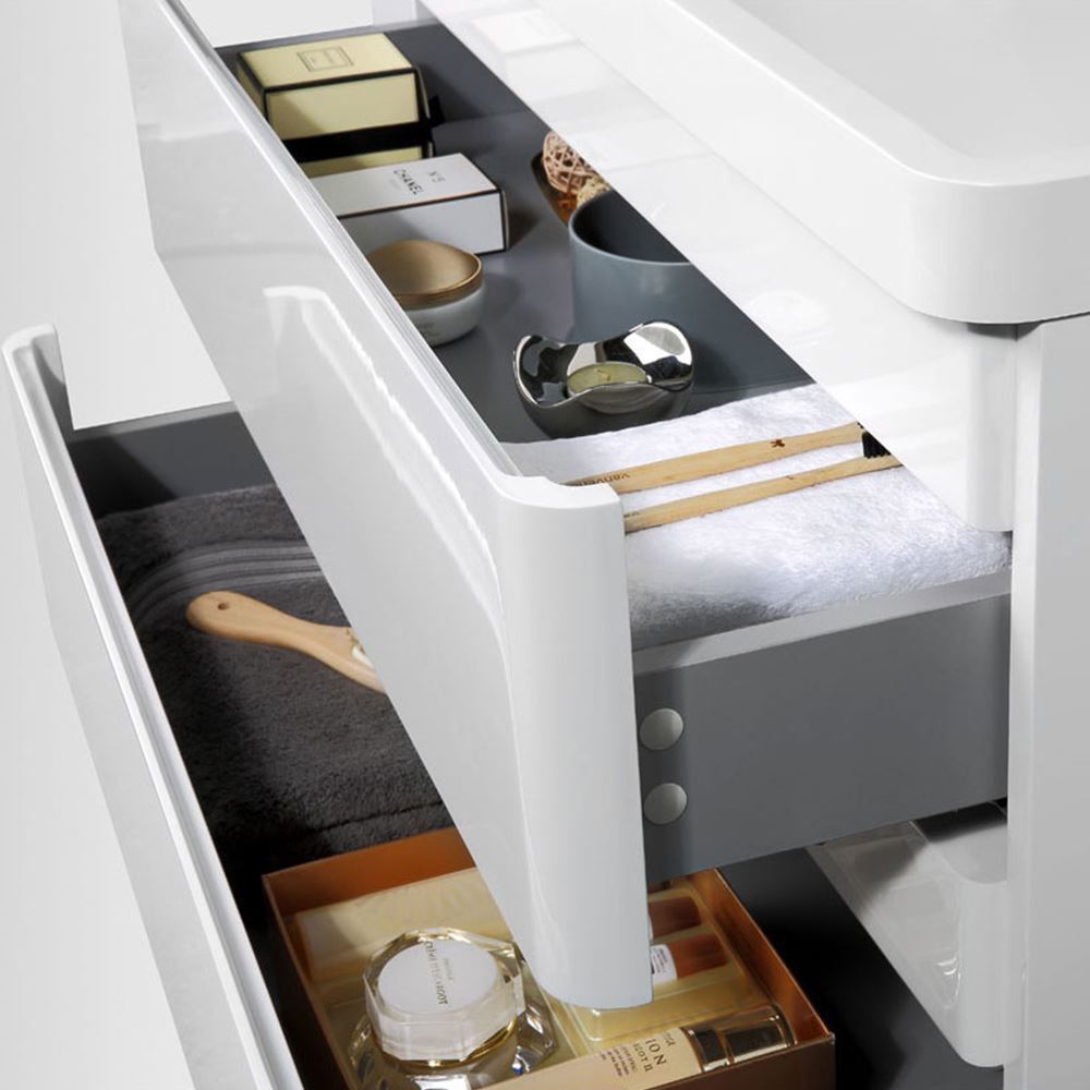 Ideally curved corners, beautifully emphasized drawer lines and glossy white countertop adds additional elegance to its contemporary design.