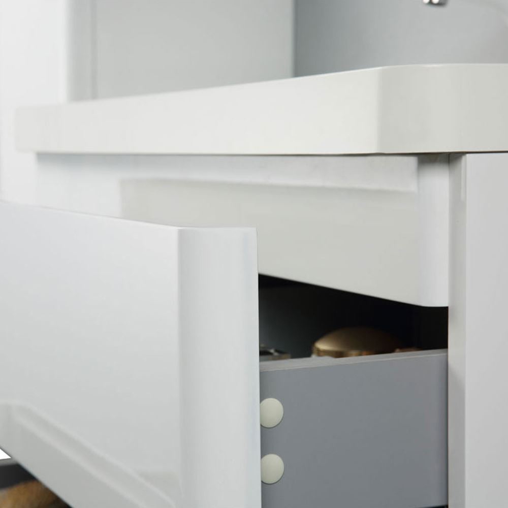 Ideally curved corners, beautifully emphasized drawer lines and glossy white countertop adds additional elegance to its contemporary design.