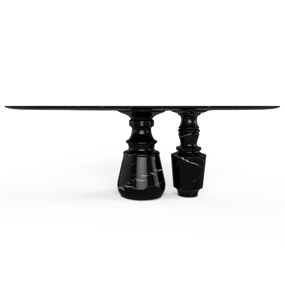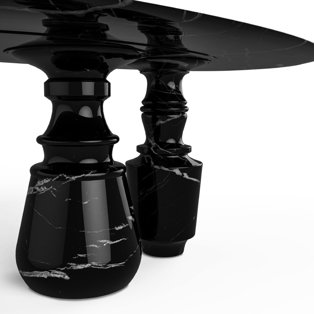 Oval table made of black Nero Marquina marble. Two detailed pedestal bases in turned marble.