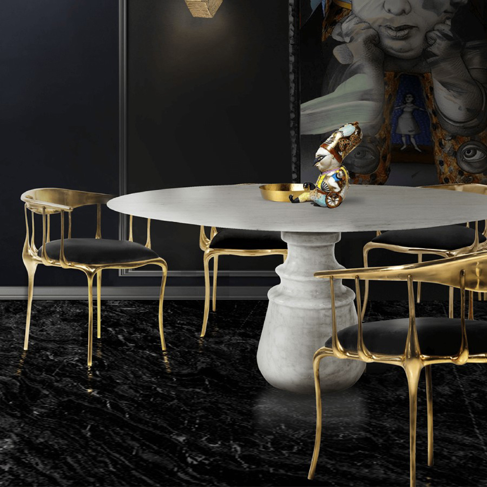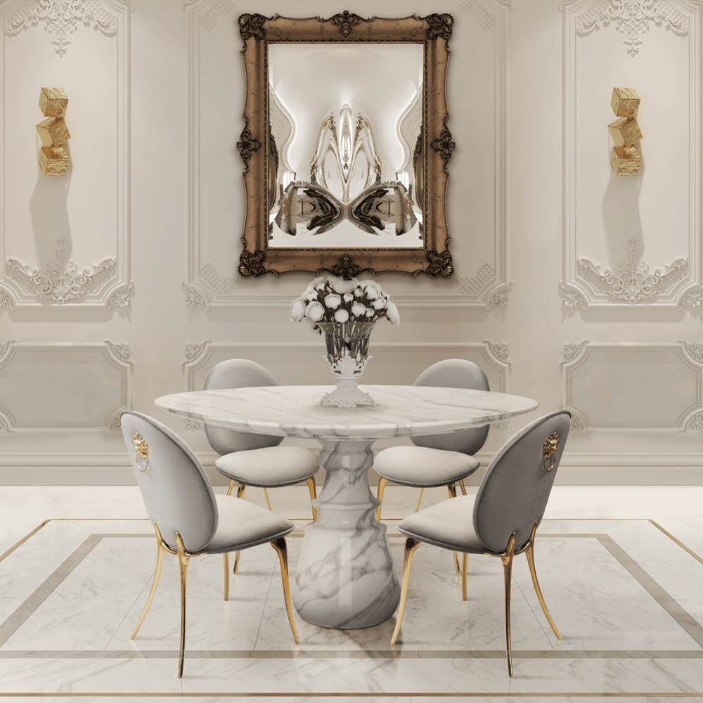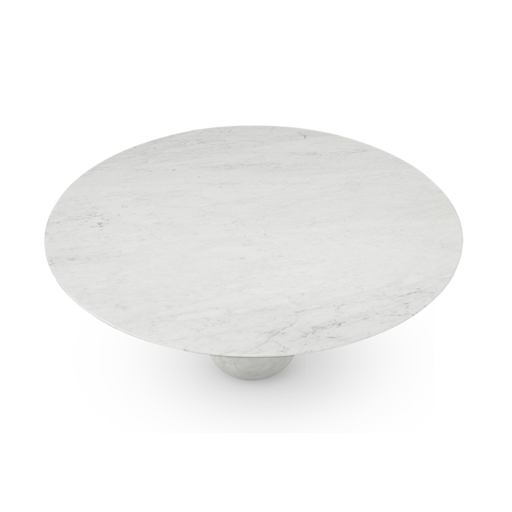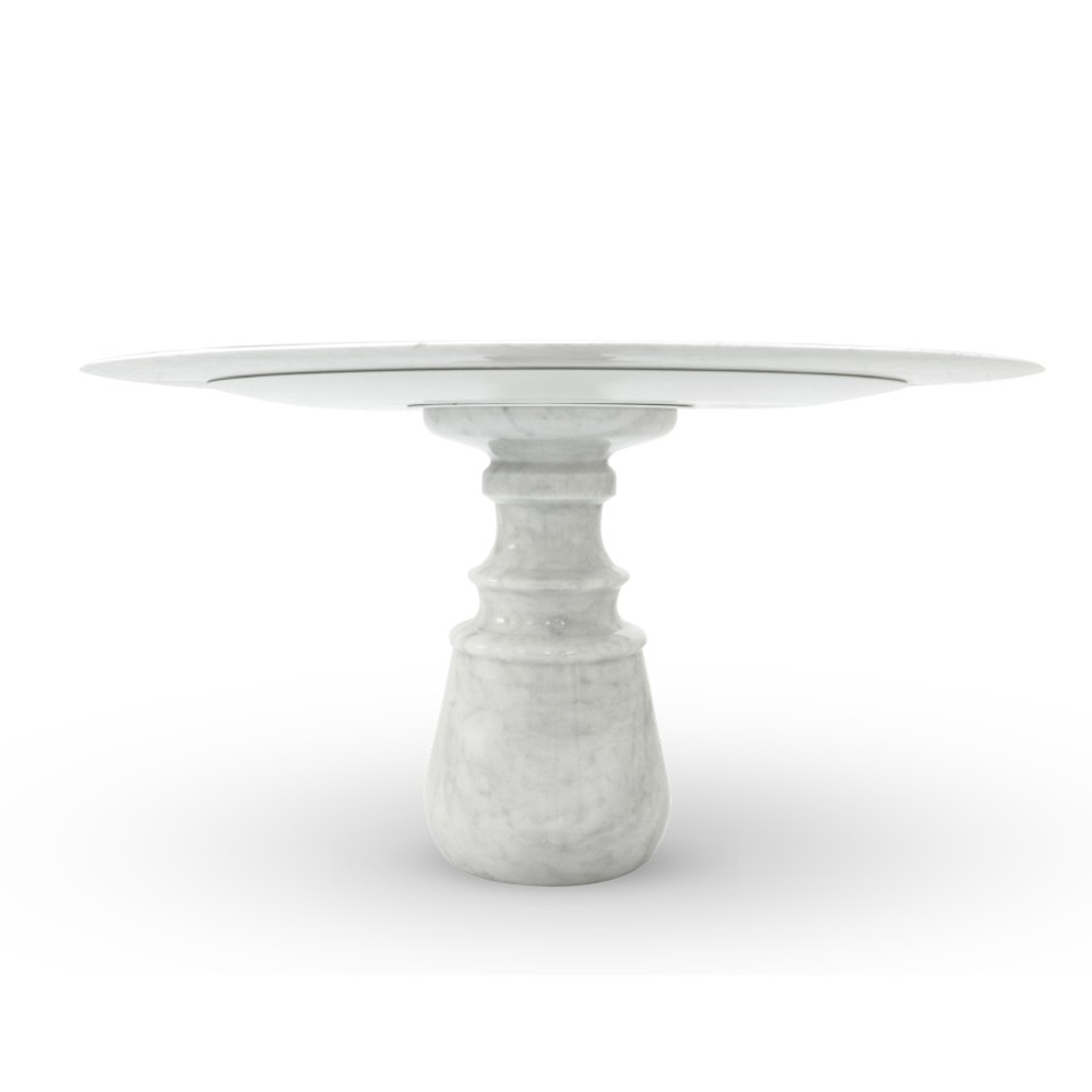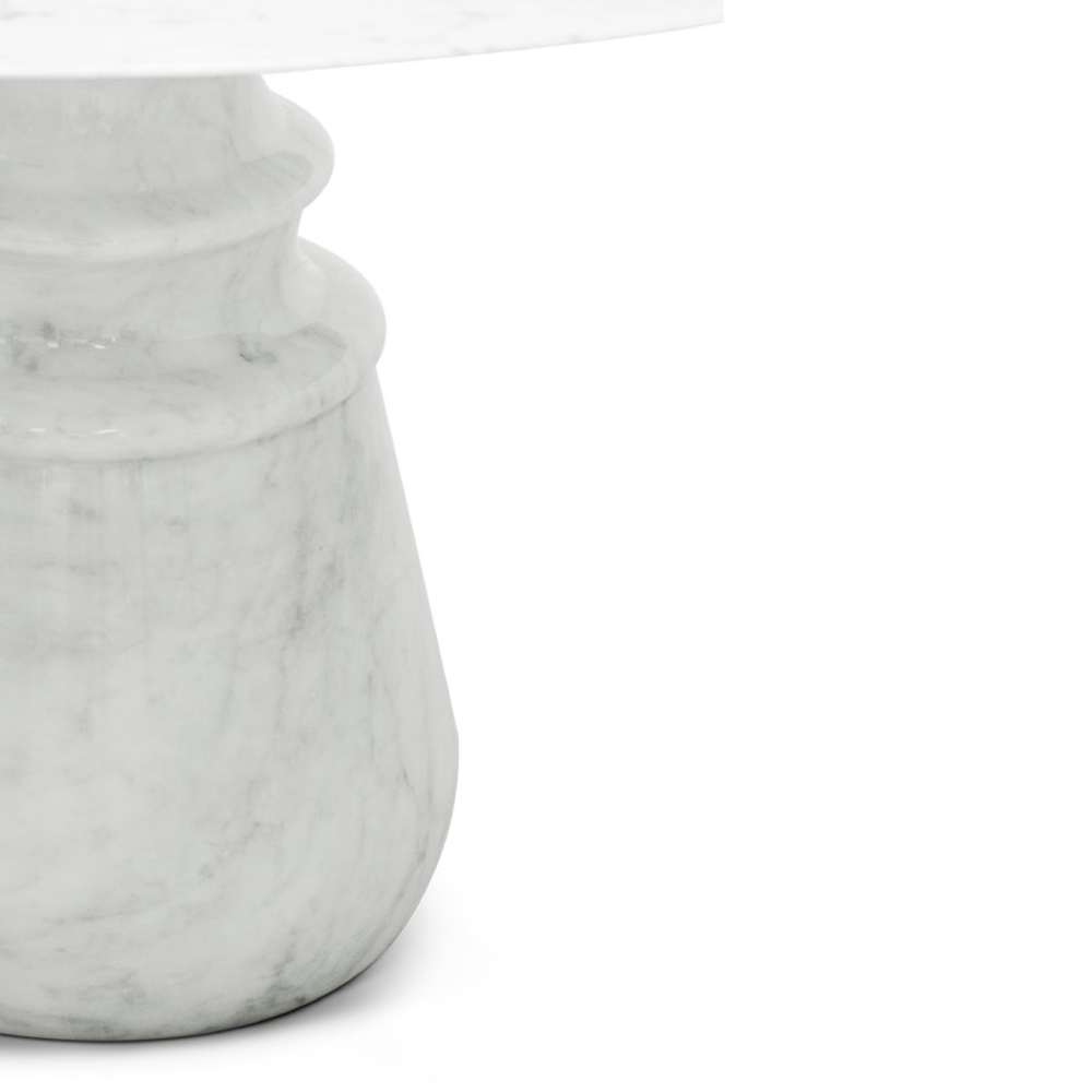 Square table made of white Estremoz marble. One detailed pedestal base in turned marble.