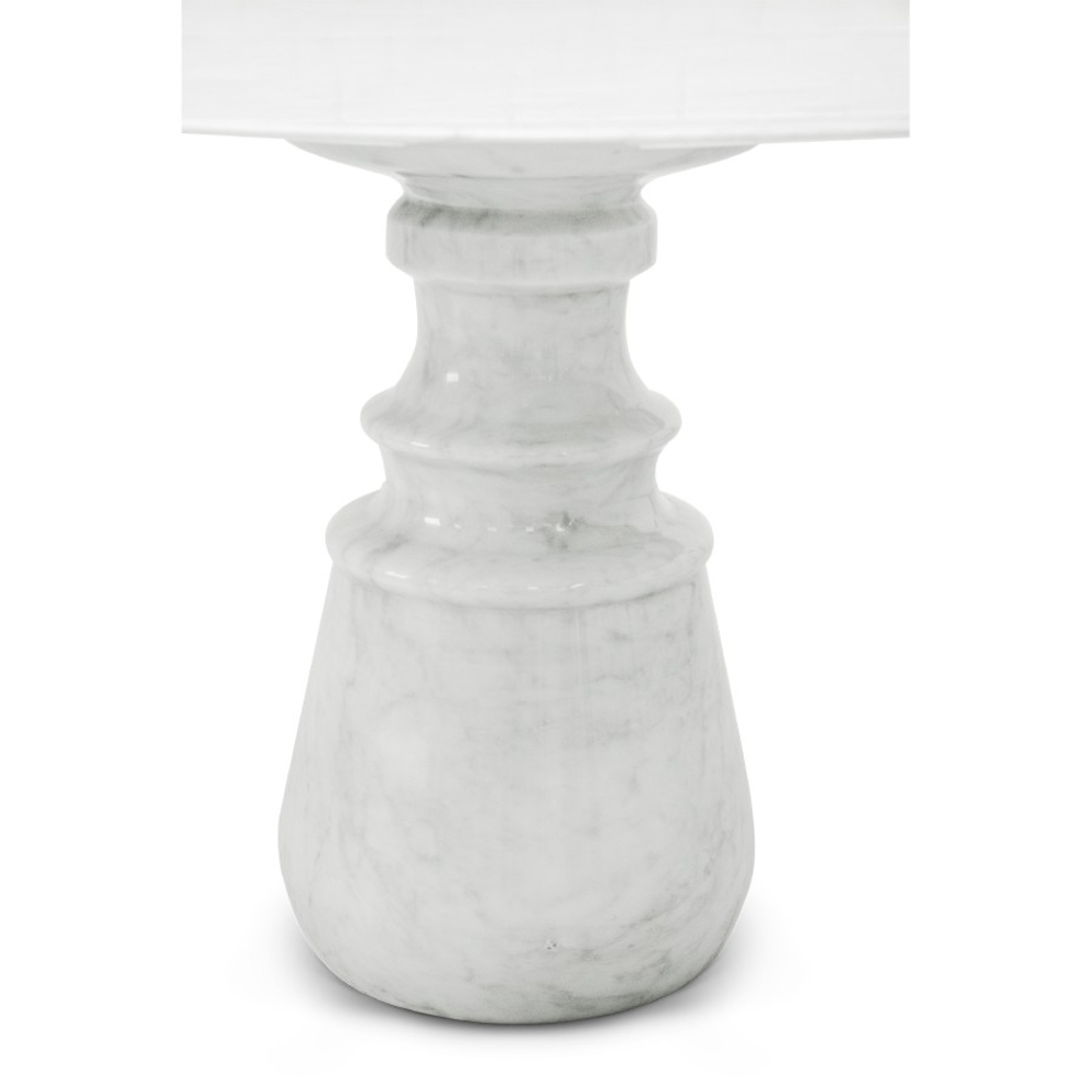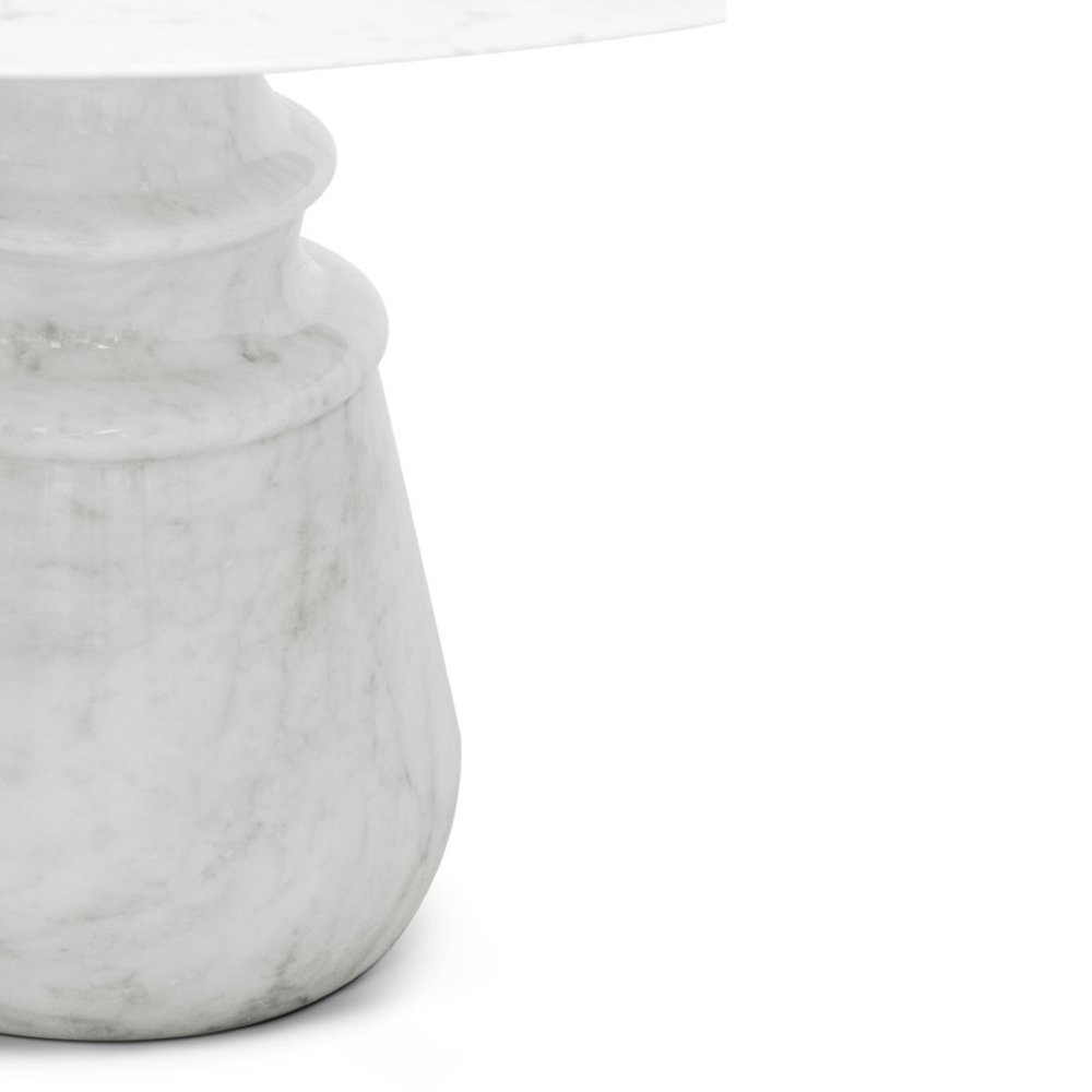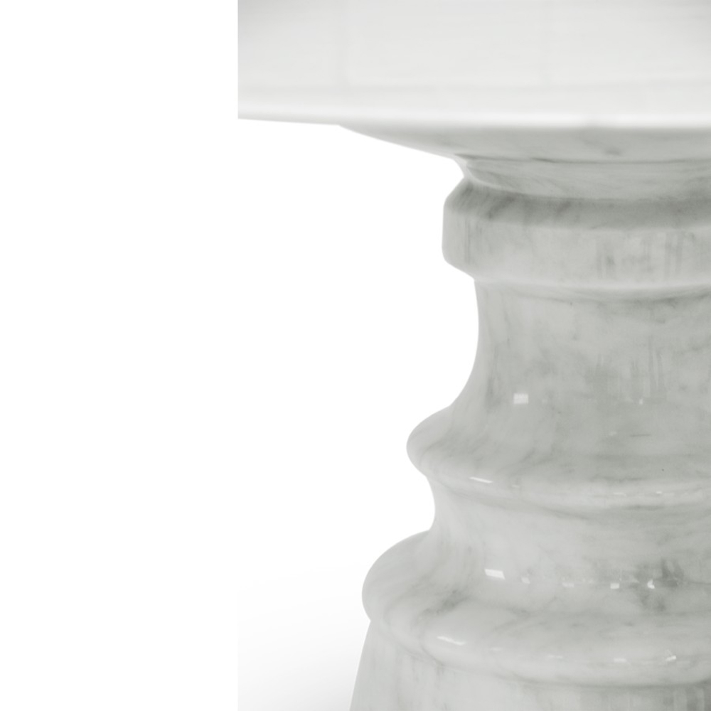 Playing with function and sculptural form, Pietra dining table shapes a timeless experience through its classical aura and finest Estremoz white marble. Reminding the renaissance era, its square top gently lies in one robust marble column, conceived from a solid block hand-sculpted and turned to create different details for additional texture. A noble material carved in Boca do Lobo workshops, conceiving a statement white table ideal for a grand entryway, elegant dining rooms or other open settings. Ideal as a four-seater table, the contemporary feel of Pietra is effortlessly stylish and it is suitable for indoor or outdoor use.