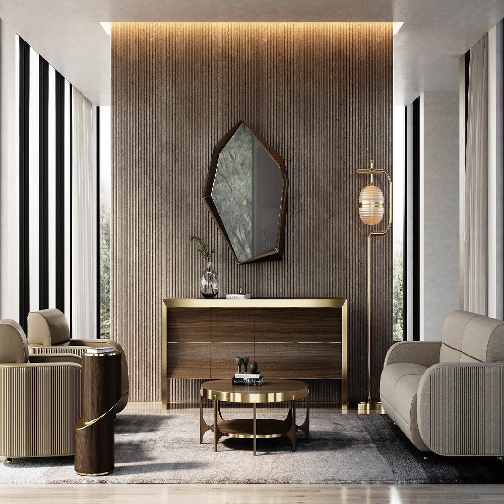 Plateau Center Table is the ultimate expression of contemporary architecture. The contrast conquered by the use of Walnut Venner and Aged Brass, result in sober yet elegant details. Inspired by the well-known work of the famous Brazilian architect Oscar Niemeyer, this is the ideal choice for a modern living room.