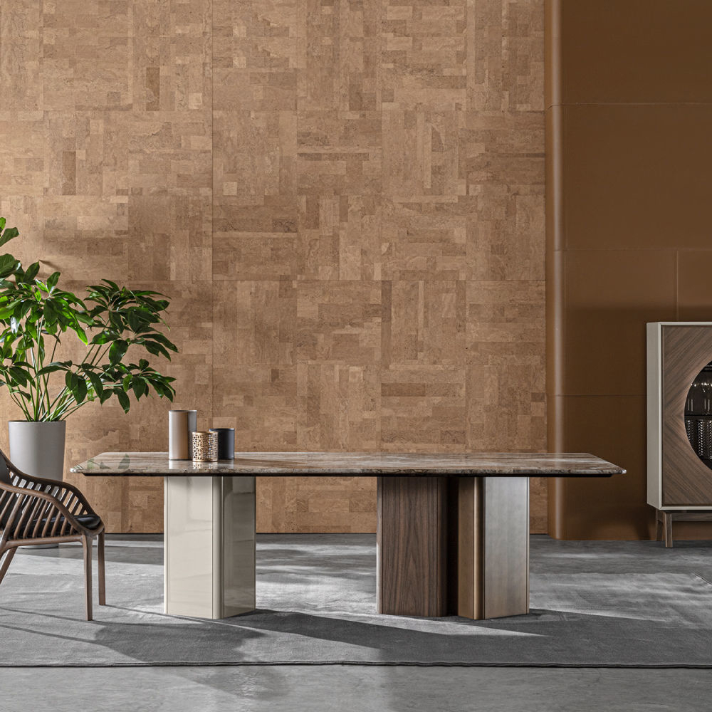 The Portofino rectangular table is the elegant result of melting in contemporary interior design: marble – wood – metal brass effects. The three legs have the versatil shape sides and allow the choise among matt canaletto walnut or ash, lacquered matt or glossy and metal effects in MC colors.
