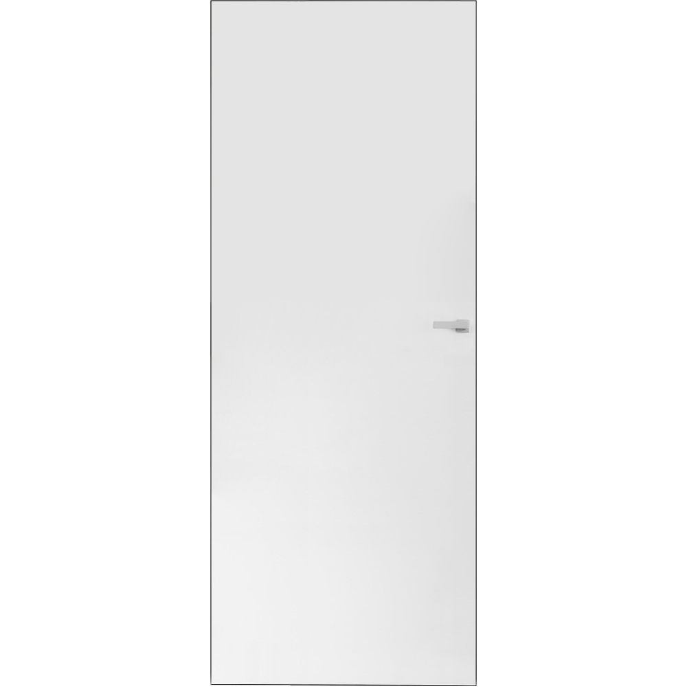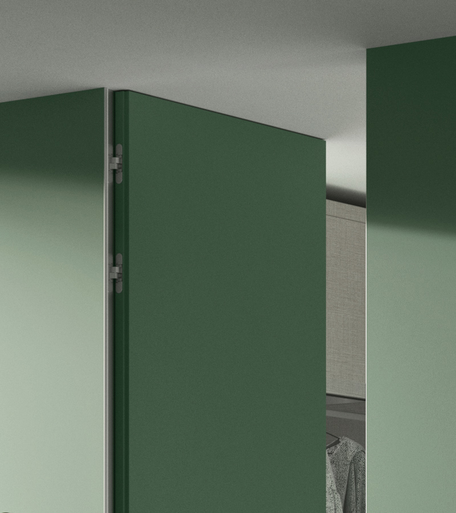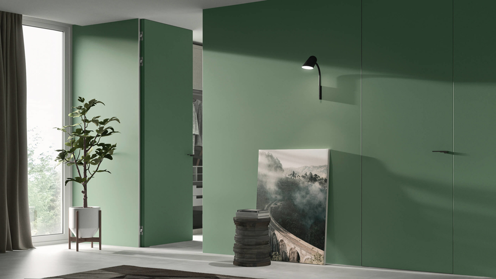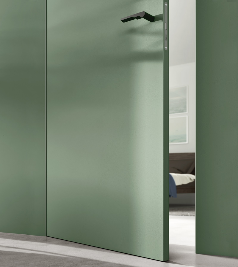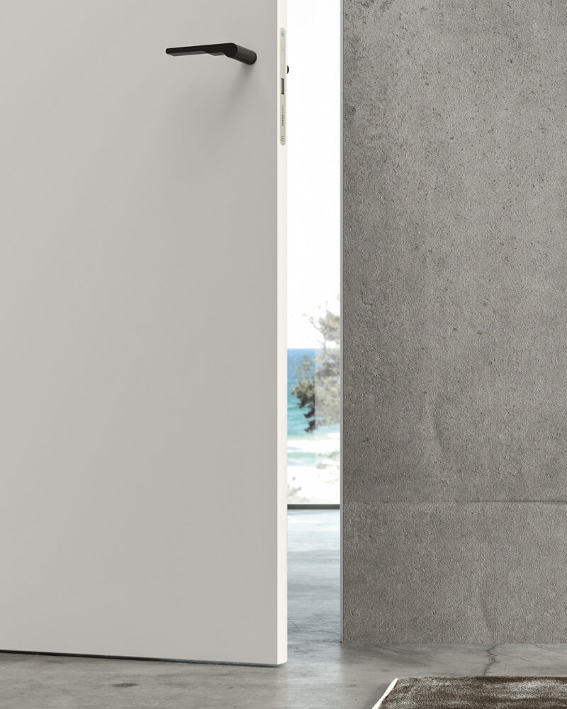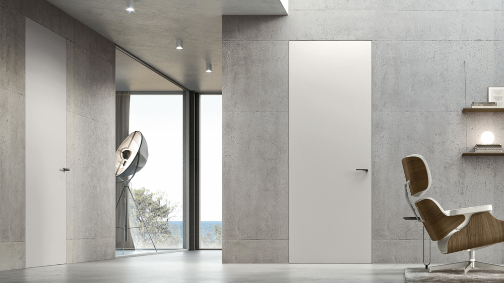 These doors are coplanar, meaning they are perfectly aligned with the wall itself. The hinges are concealed and there is no door casing, to emphasise the minimalist look.