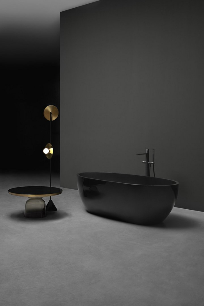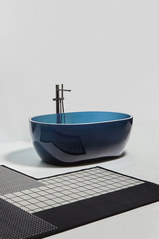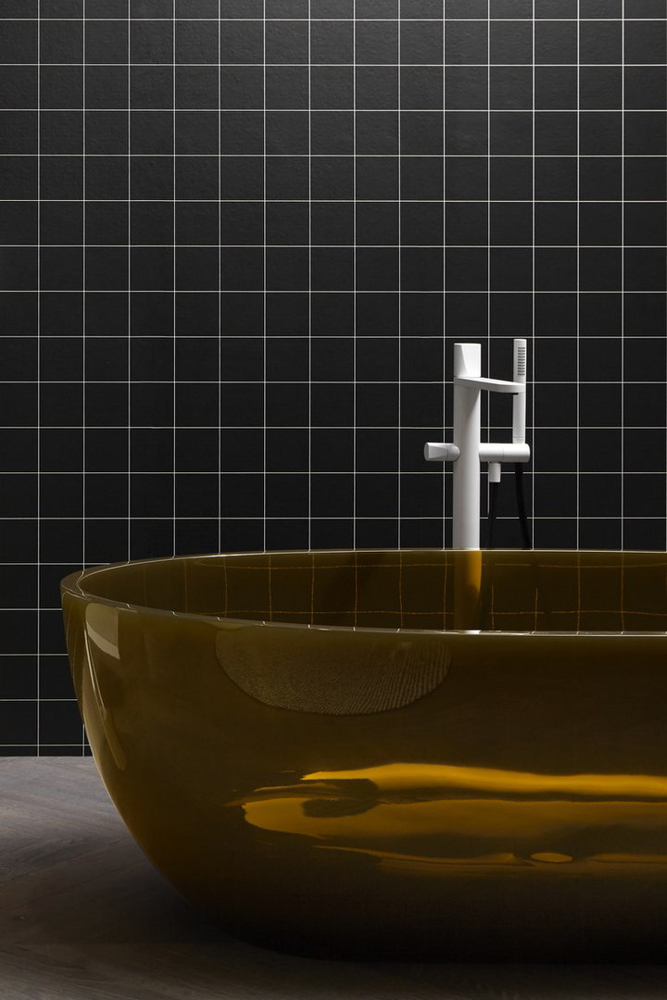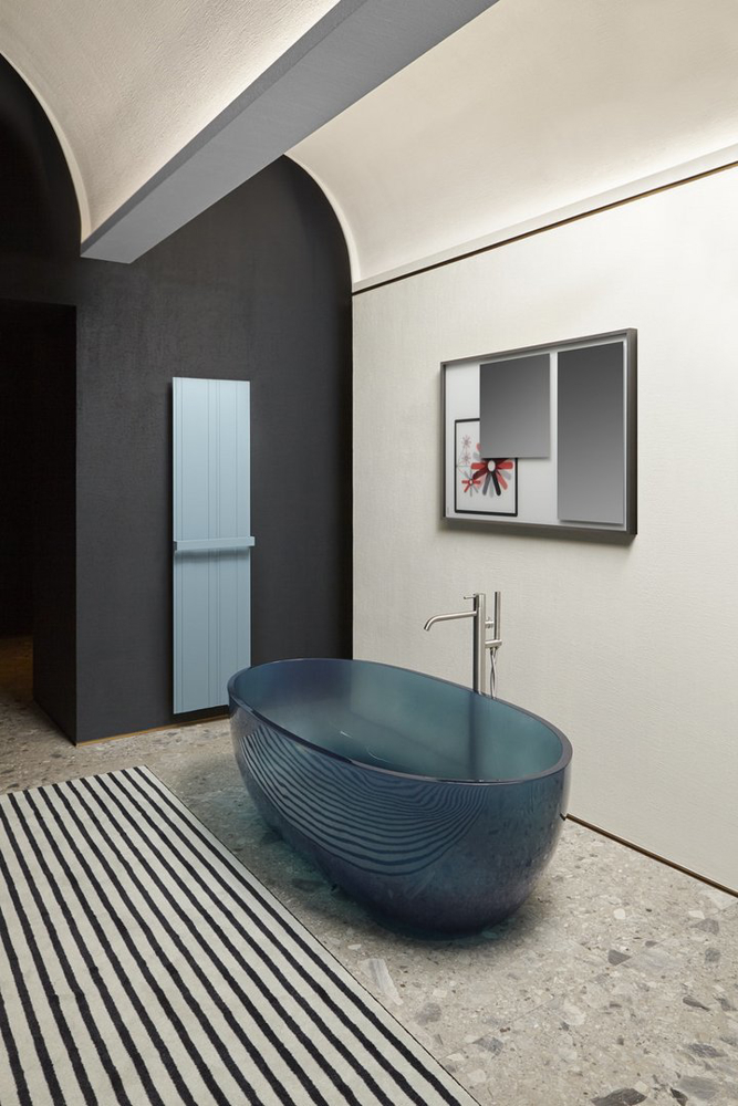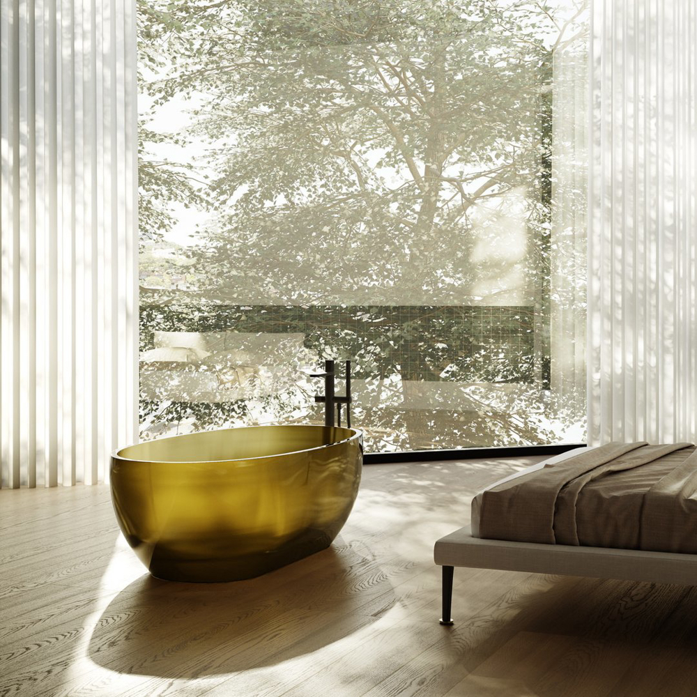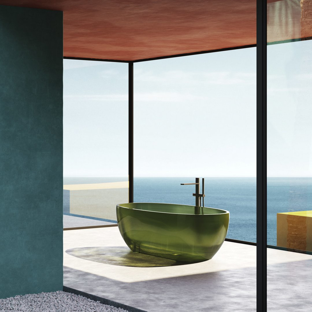 Thus Nebbia, Ocra, Bottiglia, Ginger, Ambra, Petrolio, Oleo, Gran Cru, Ceruleo, and then Vespero, Notturno, Mostato, Barrique shades were born, which give color, elegance and liveliness to the plastic volumes made in Cristalmood or Icemood. The chromatic variations that follow the geometry and the curved lines of washbasins and tubs give plastic behavior to the elements in a constant dialogue with the light.
