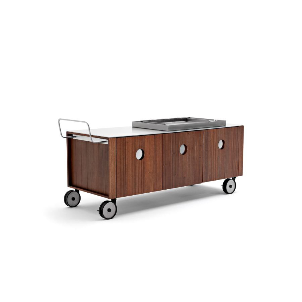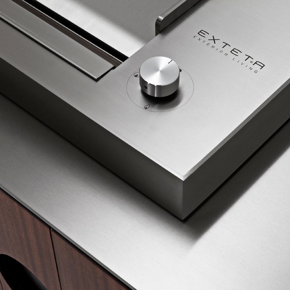 The exclusive Exteta cooking accessories and systems available for the Roller Kitchen are made of stainless steel for outdoor use. The kitchen becomes a unique and personal project, adapting to different needs and preferred cooking methods thanks to a wide range of customizable elements, such as the teppan yaki hotplate, perfect for an outdoor BBQ.