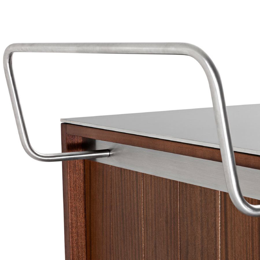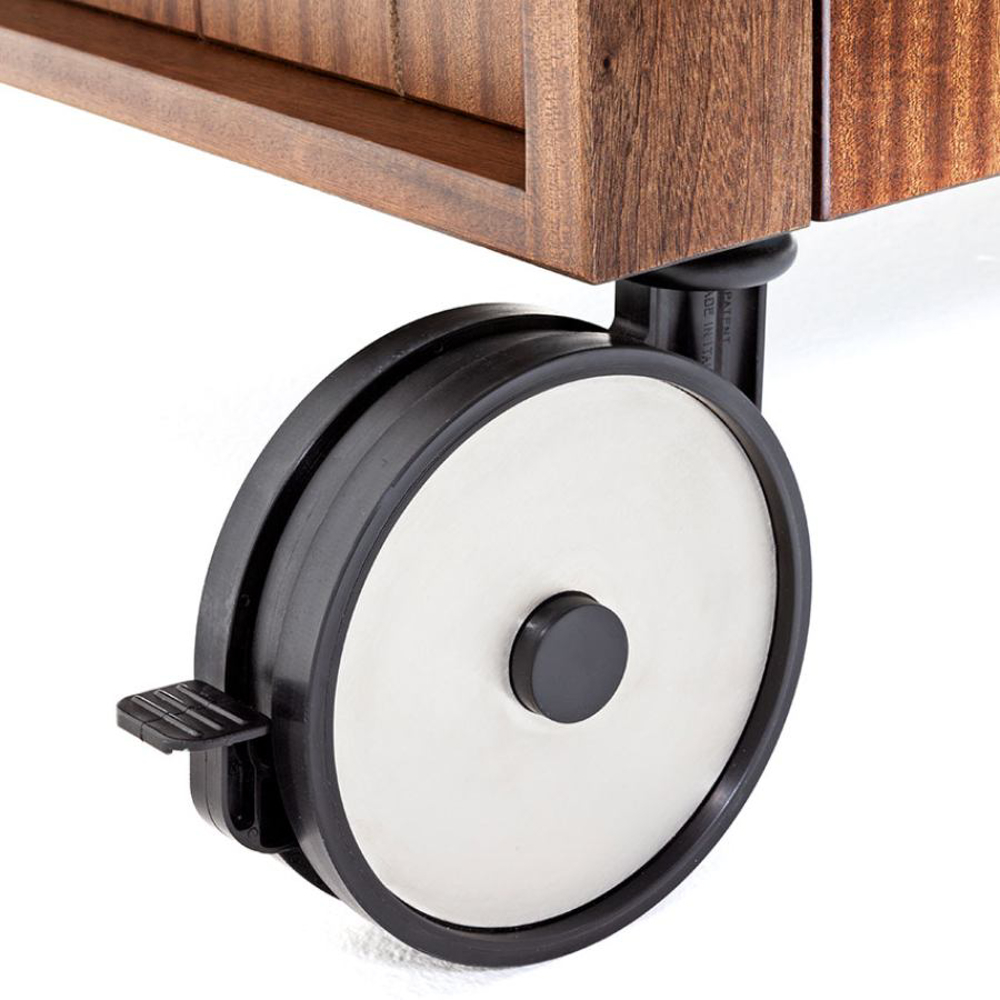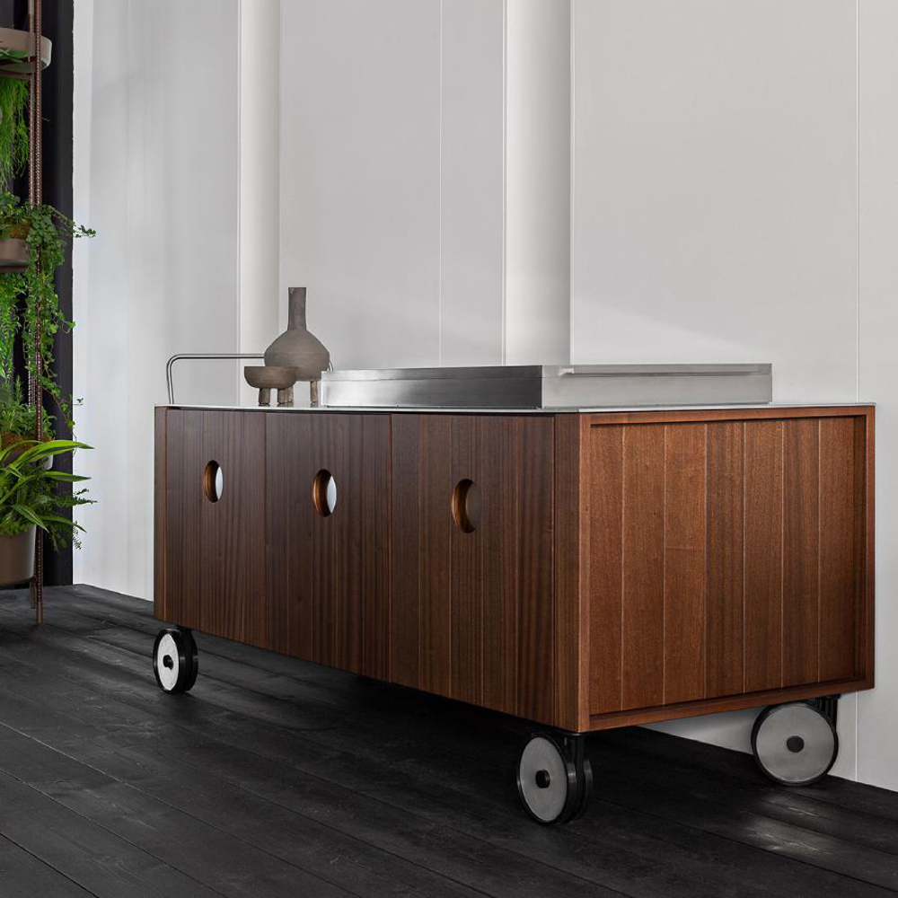 The stainless steel top adds a contemporary flavor to the material’s functional characteristics. Resistance to impact, scratches, external agents, corrosion, and deterioration caused by wear are combined with simple and linear aesthetics to embrace every outdoor scenario. The finish gives a traditional material, considered cold and aseptic, a new warm, bright, and shining soul that creates a special play of light and reflections. The curved steel handle is an accessory that makes moving even more fluid and gives the Roller Kitchen a retro detail.