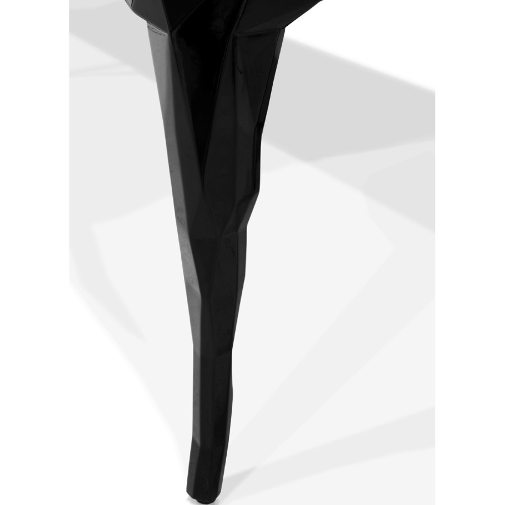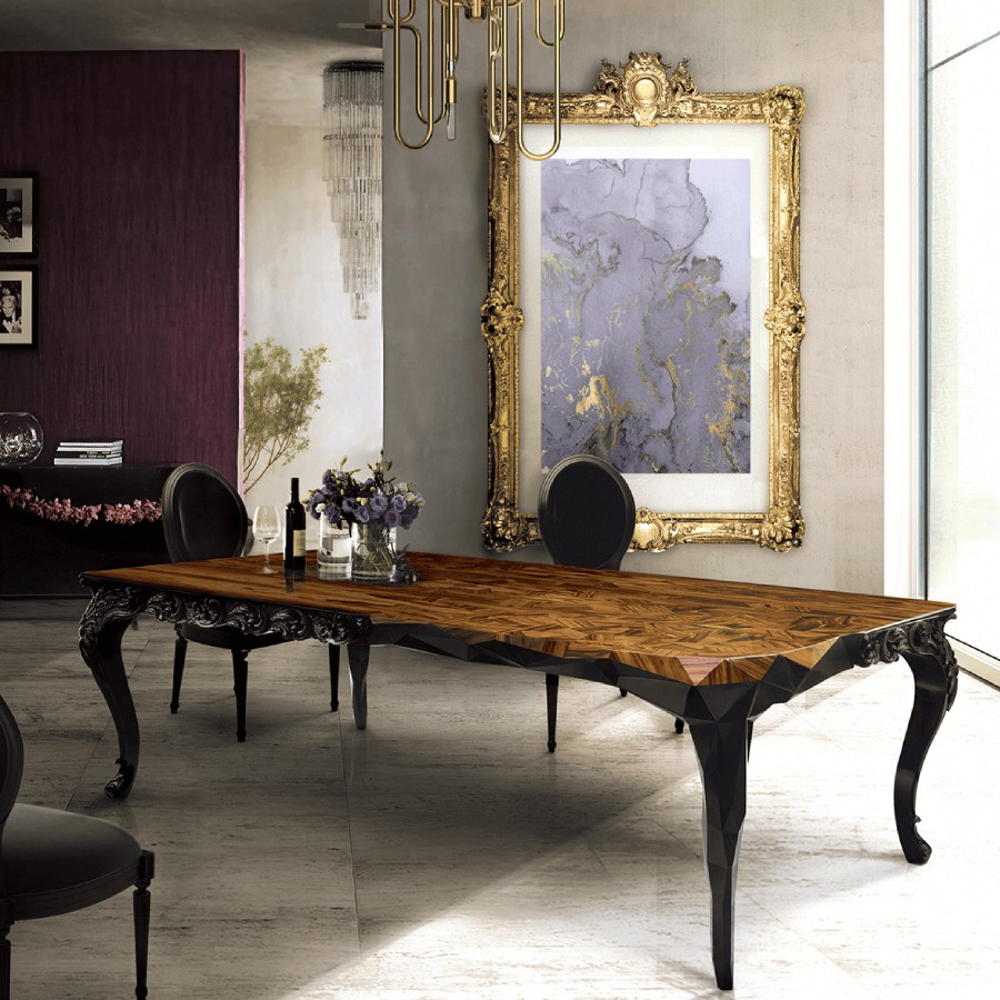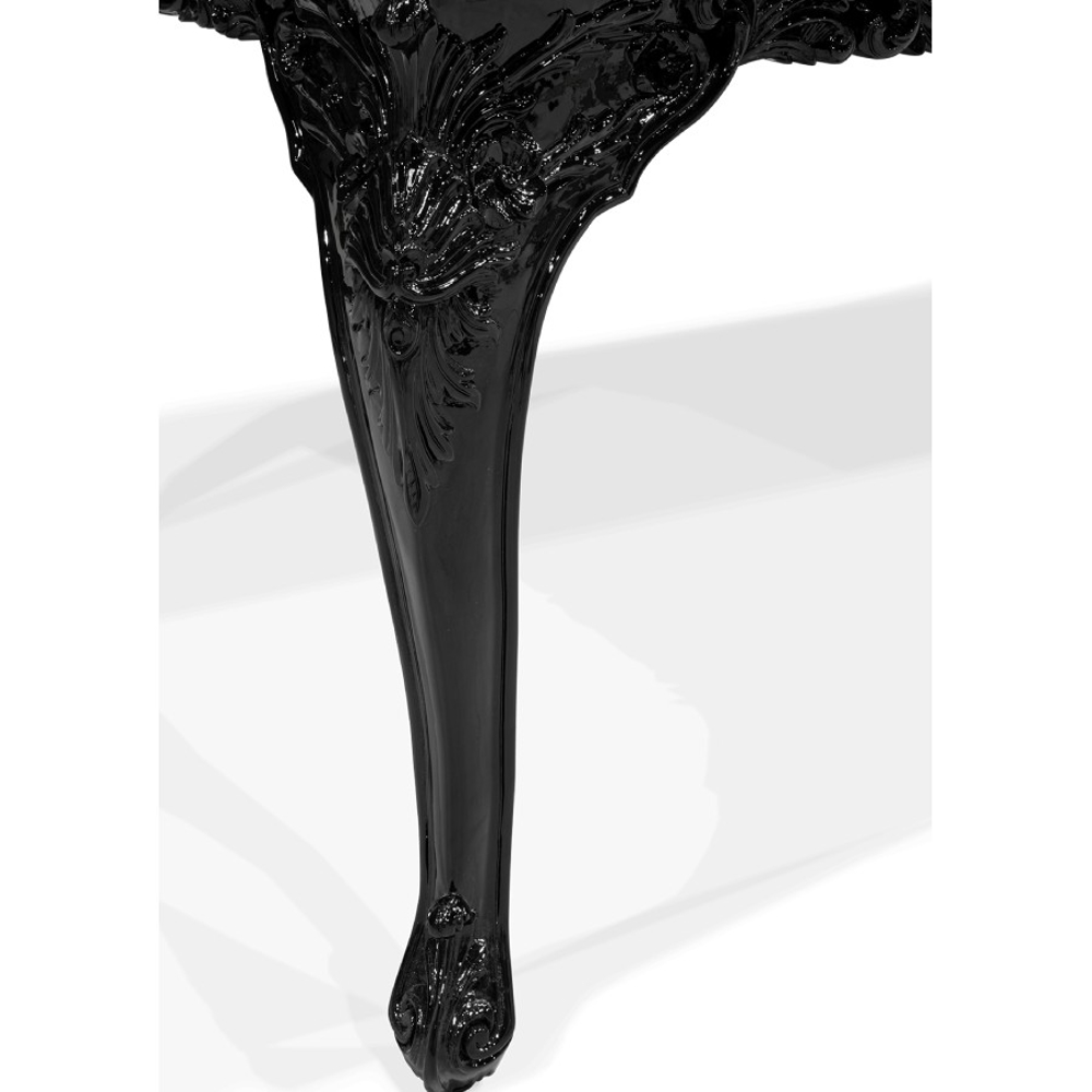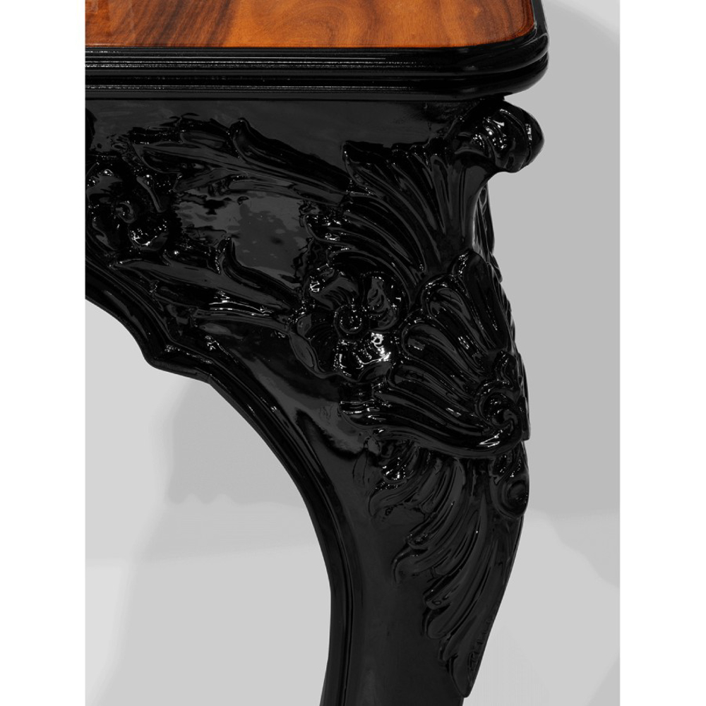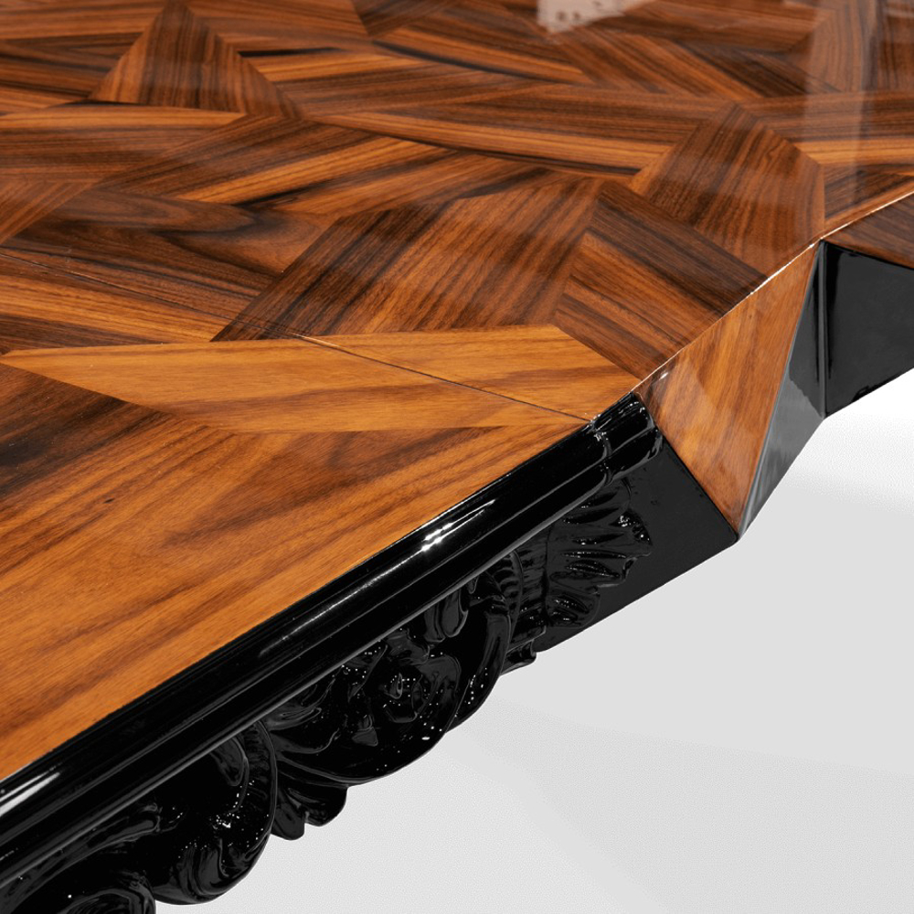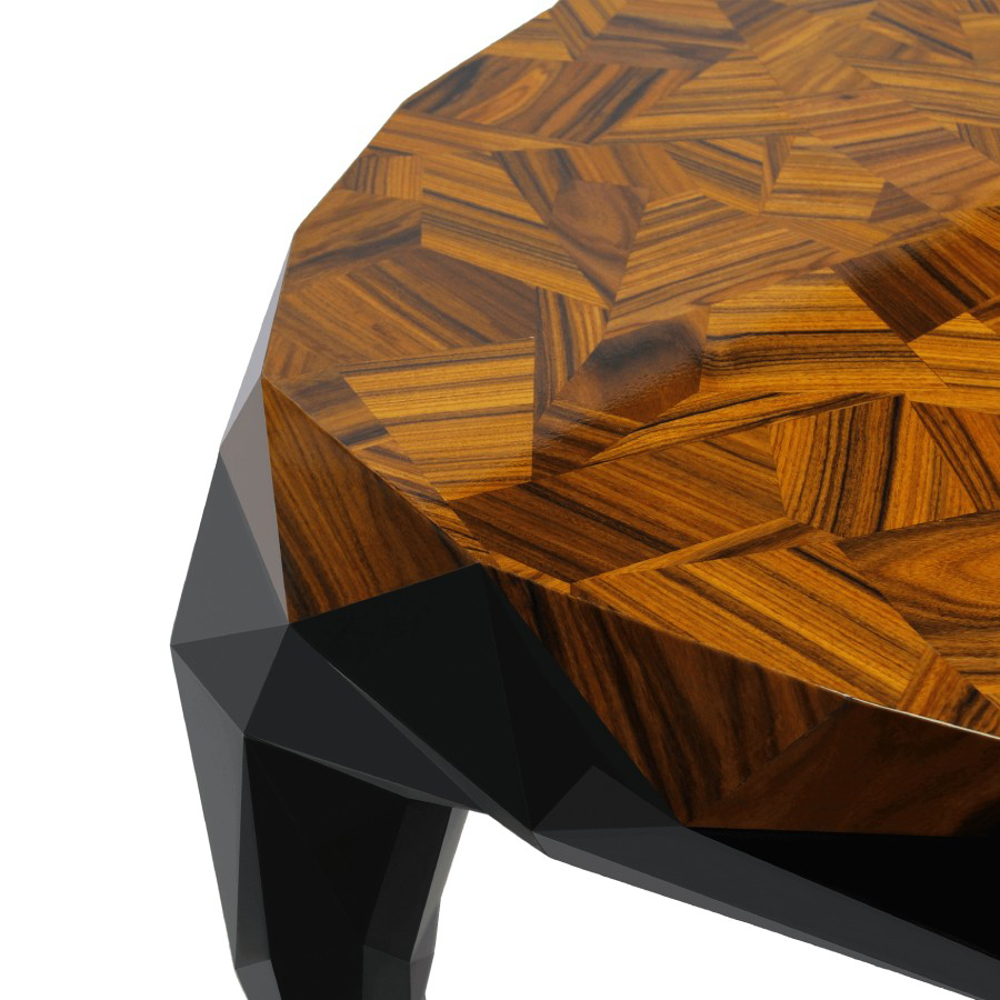 The table surface is finished in a palisander wood veneer, with a patchwork collage. It's legs are finished in high gloss black lacquer finish.