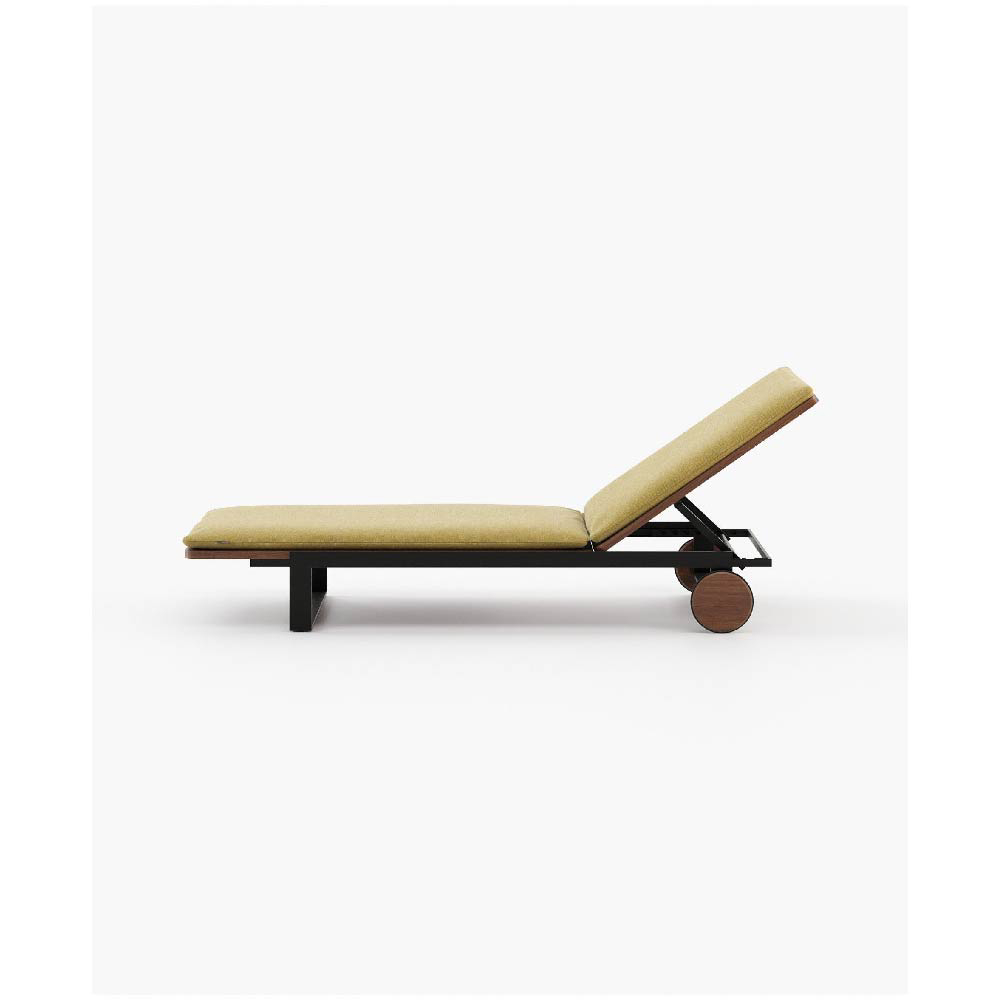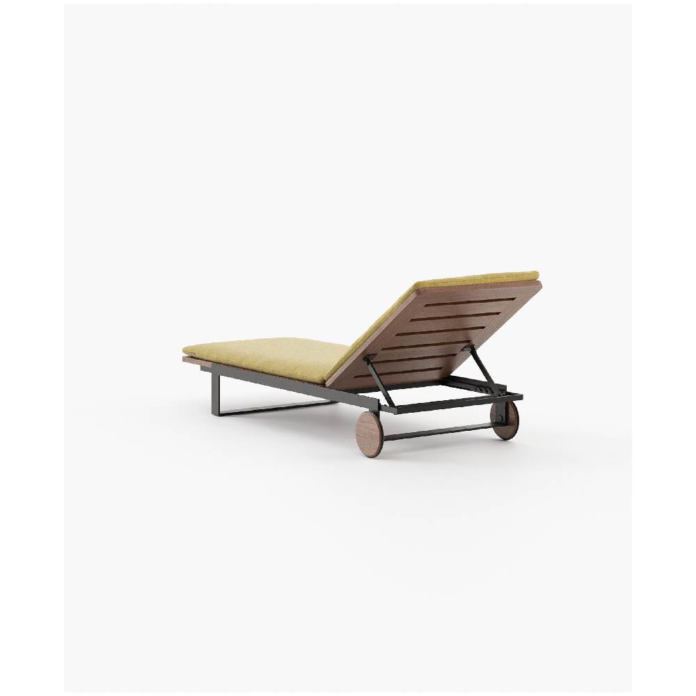 For ultimate outdoor comfort and style, this contemporary sun lounger features a textured black iron frame with dark Kambala wood accents. This sun lounger with wheels is designed for easy transportation, allowing relaxation and enjoyment of the outdoors with unparalleled elegance and comfort.
