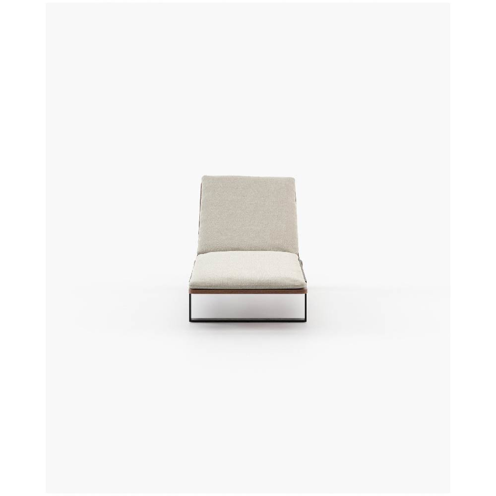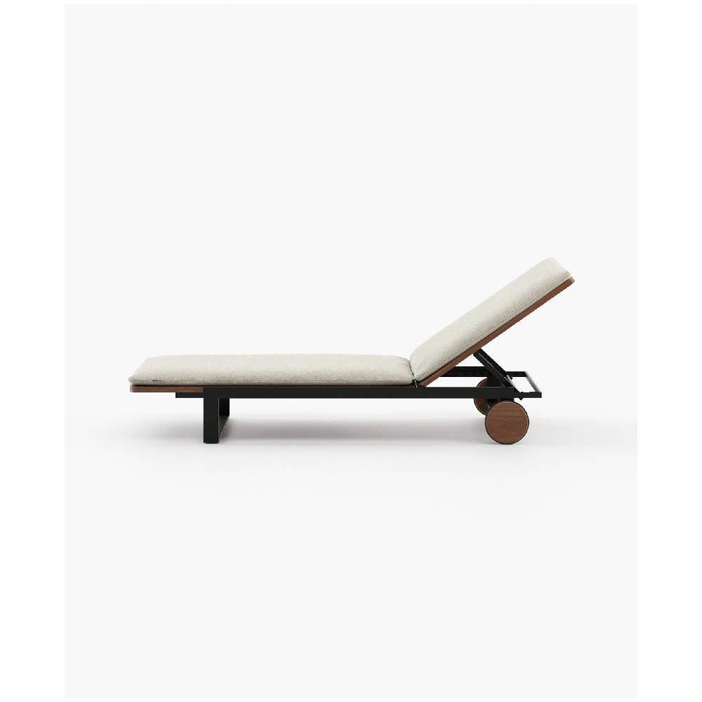 For ultimate outdoor comfort and style, this contemporary sun lounger features a textured black iron frame with dark Kambala wood accents. This sun lounger with wheels is designed for easy transportation, allowing relaxation and enjoyment of the outdoors with unparalleled elegance and comfort.