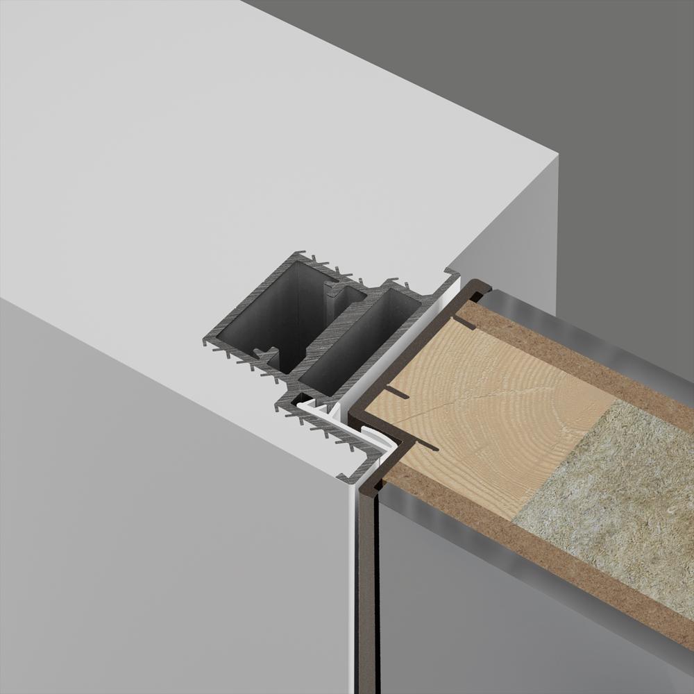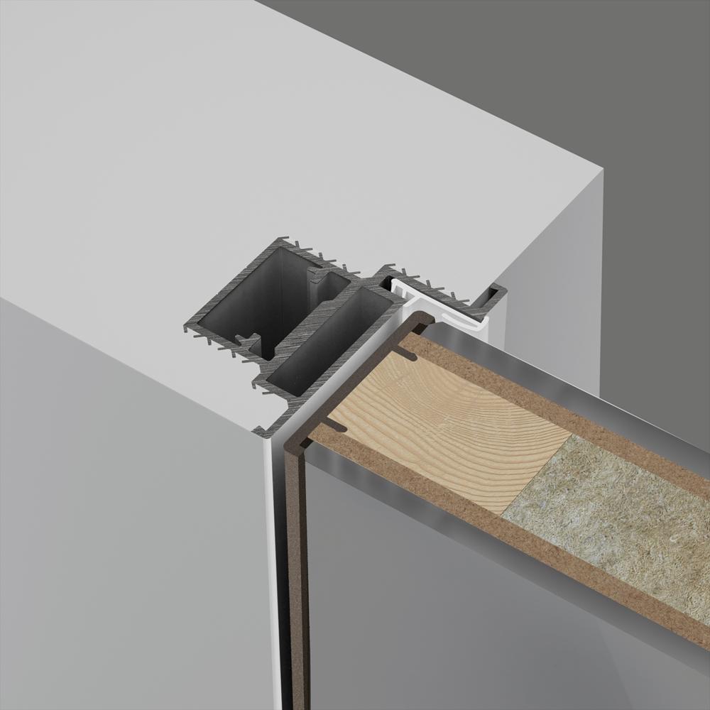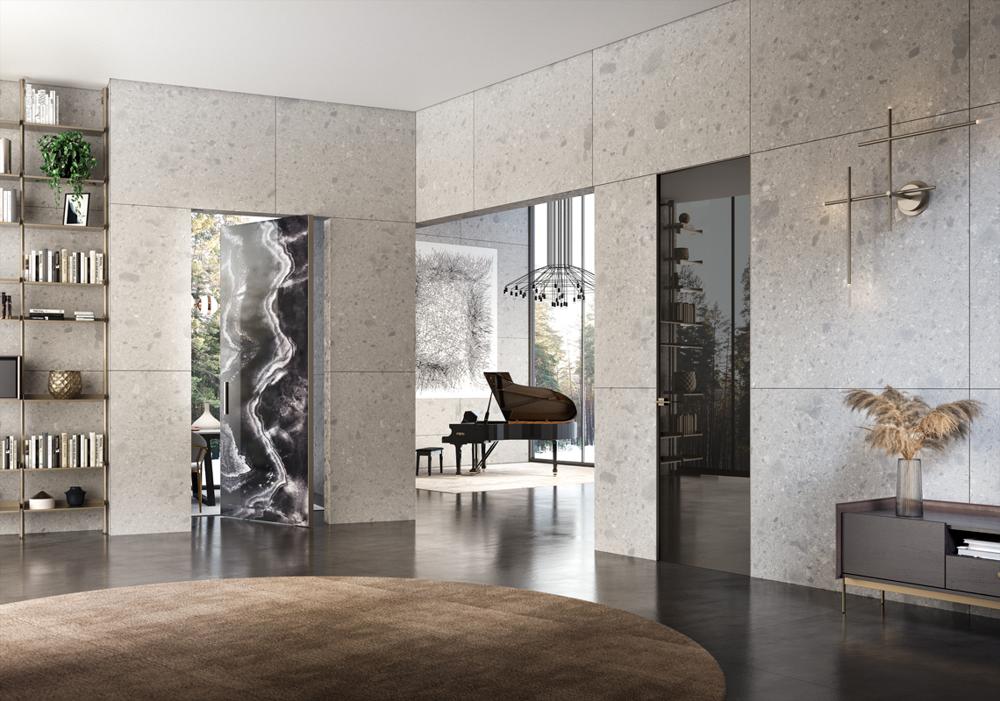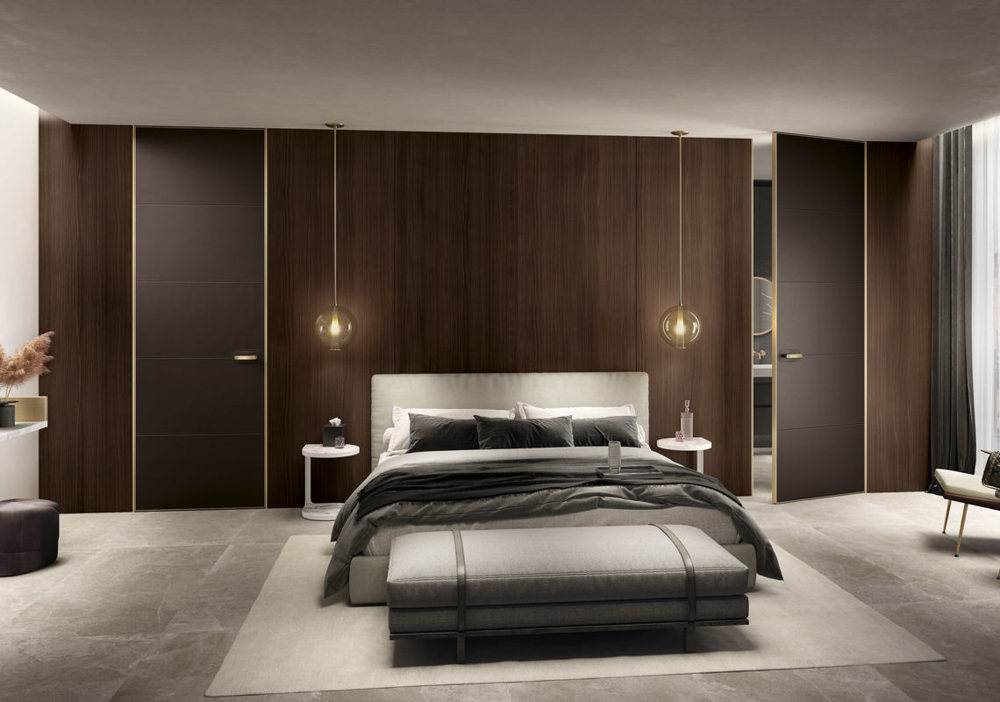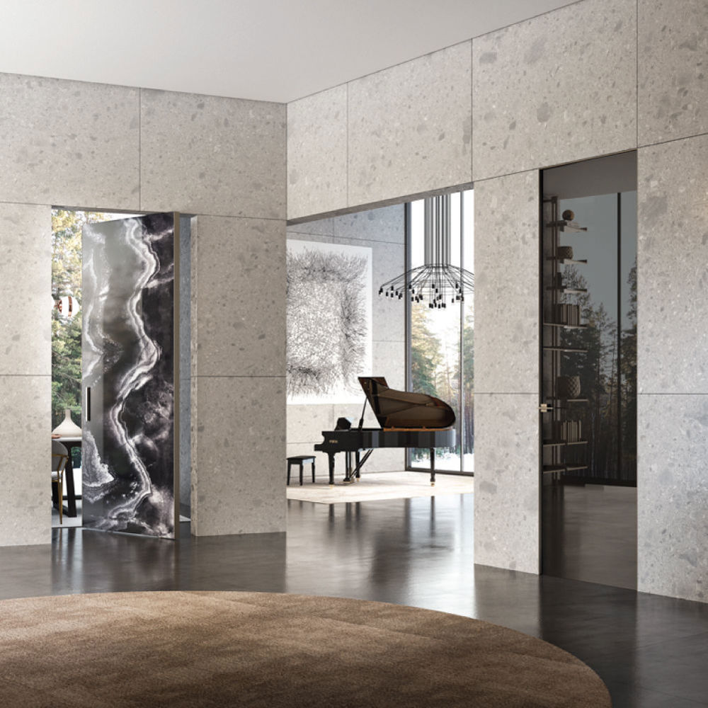Shell is the line of flush-to-the-wall doors that allows the application of glass, mirror or leather panels, guaranteeing modernity and customization in any environment. This solution also makes it possible to obtain the possible bifaciality of the door. The door is framed by a metal profile that gives an even more refined touch to the door.