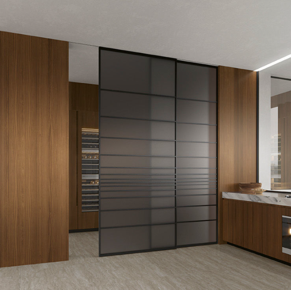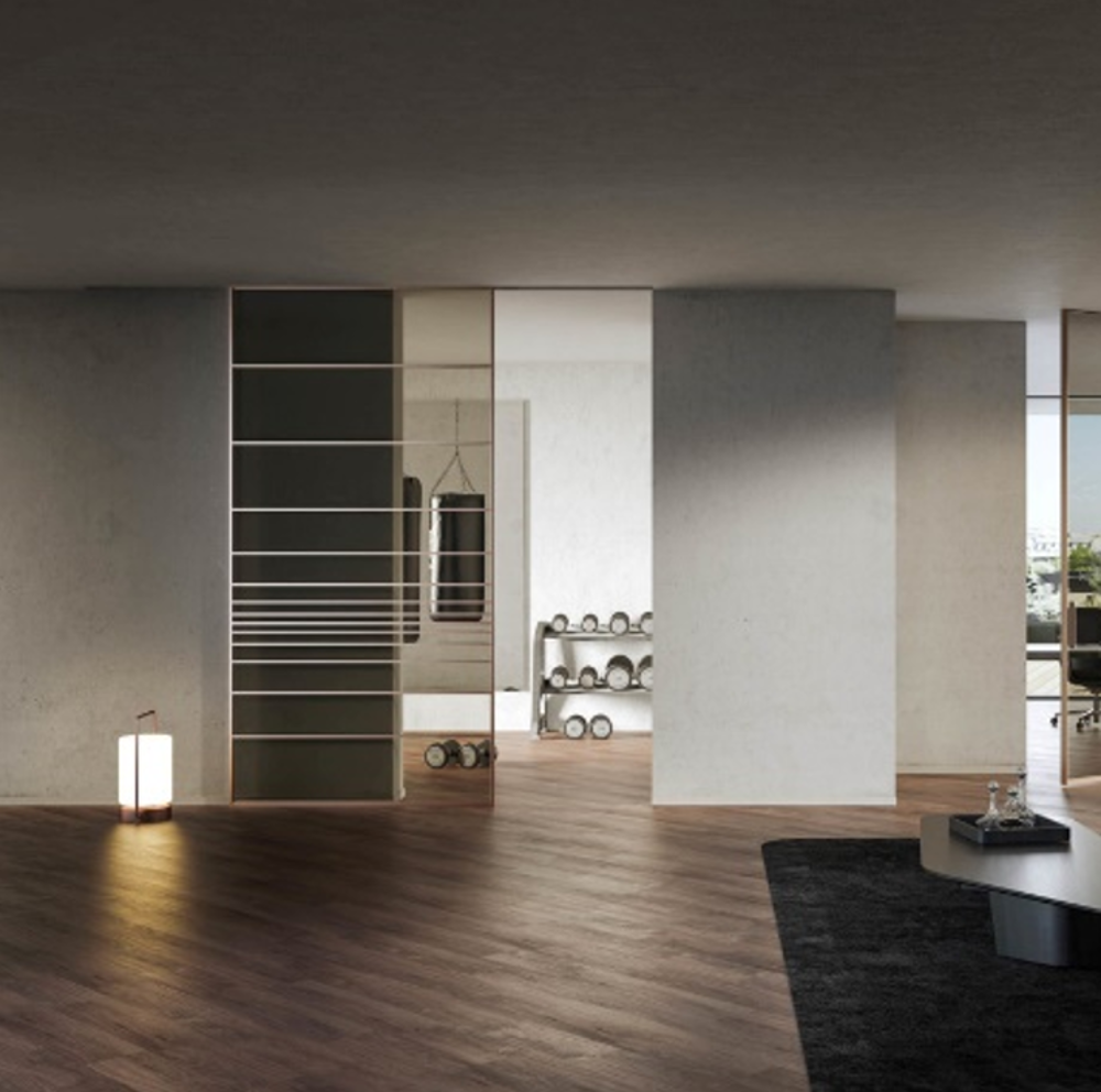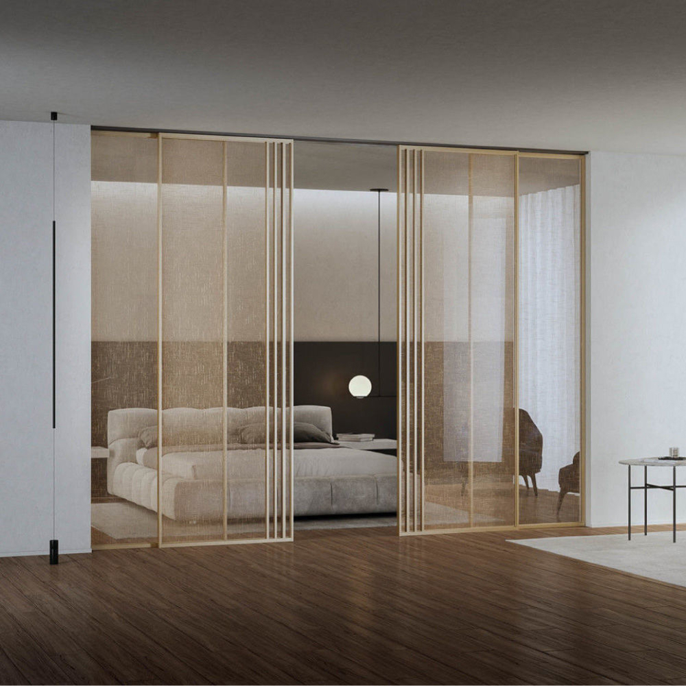 Volta is a versatile flush-to-ceiling sliding door system suitable for dividing spaces with the utmost elegance and aesthetic minimalism, also thanks to the invisible sliding bar. The metallic lacquered colours of the aluminium structure match perfectly with the many textile or metal-decorated glass options, a combination that creates stunning modern and stylish atmospheres.