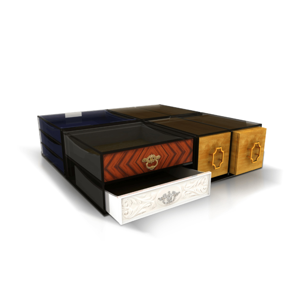 This coffee table, composed by 9 drawers, works in a modular system that offers you the possibility to change the drawers’ position in order that you can create your favorite composition whenever you feel like. All the drawers are customized as we also offer you the possibility to change the materials and the finishing.