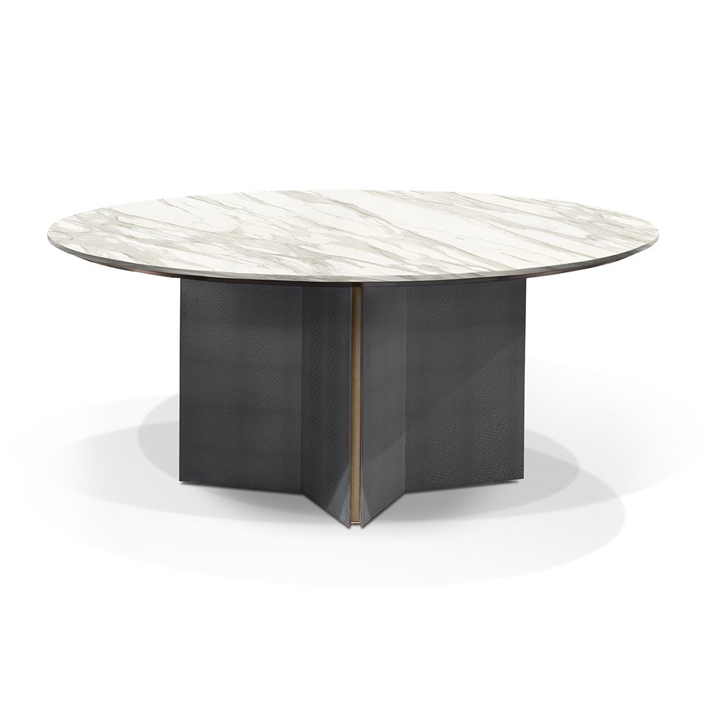 Top in marble Calacatta Gold, Base covered in art. Cuoio col. Graphite with lacquered inserts col. Pale Gold.