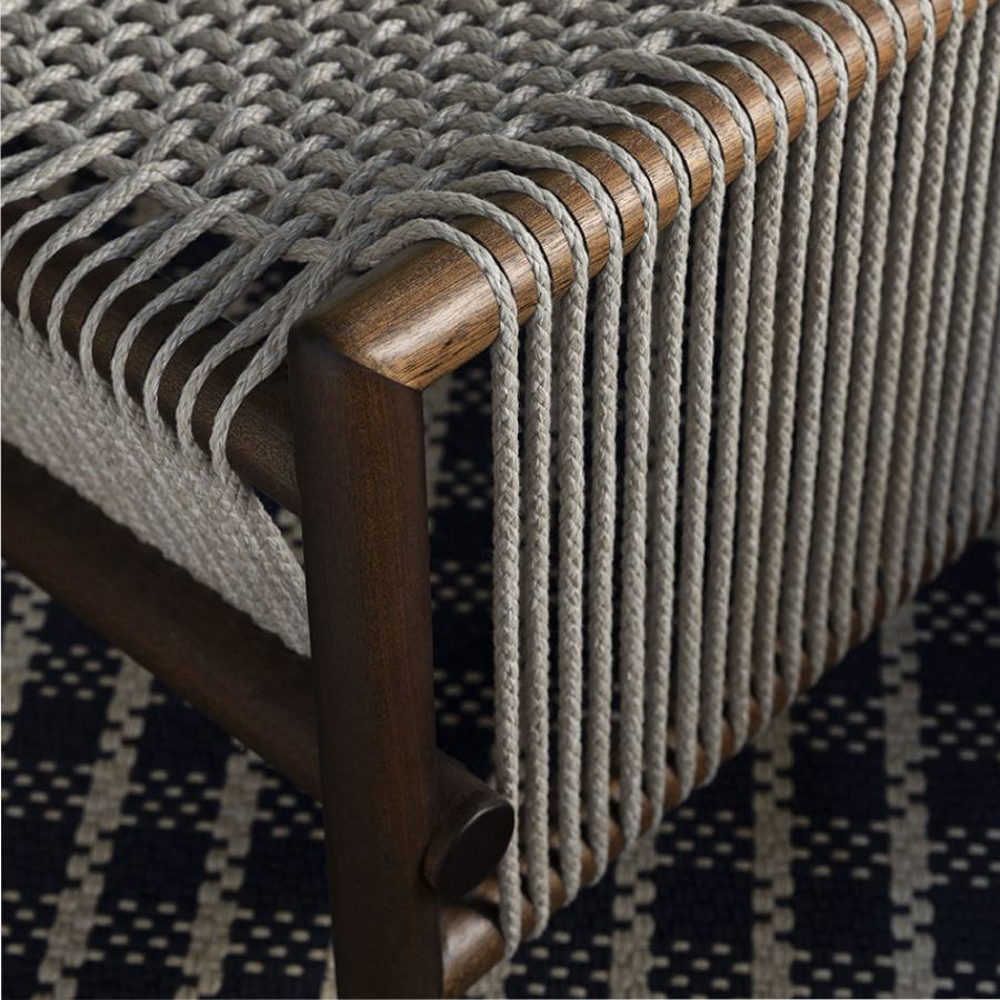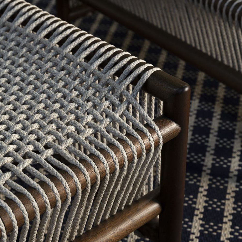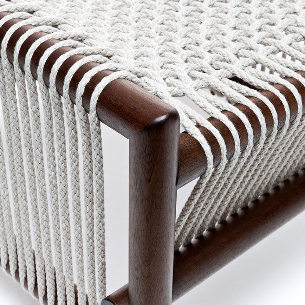 The rounded profile of the skeleton is adorned with woven strings. The Sapelli mahogany structure, available in matt mahogany, barrique and polished Mediterranean finish, is supported by PVC and stainless steel feet.