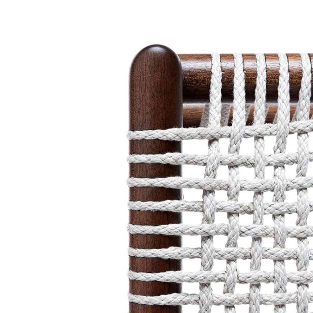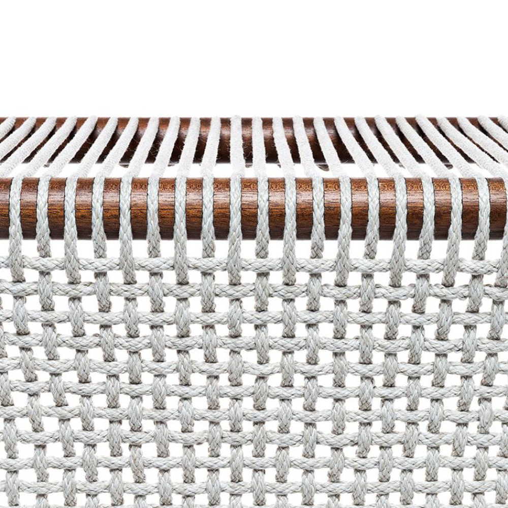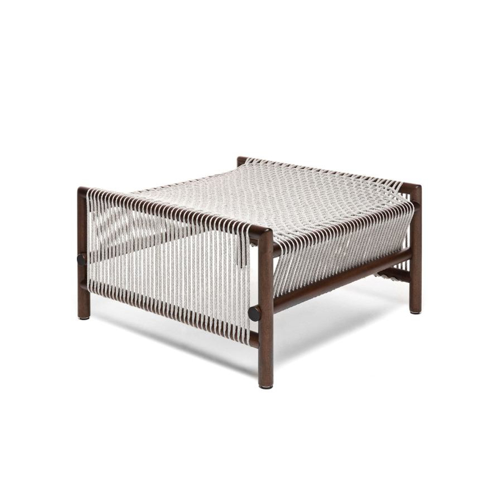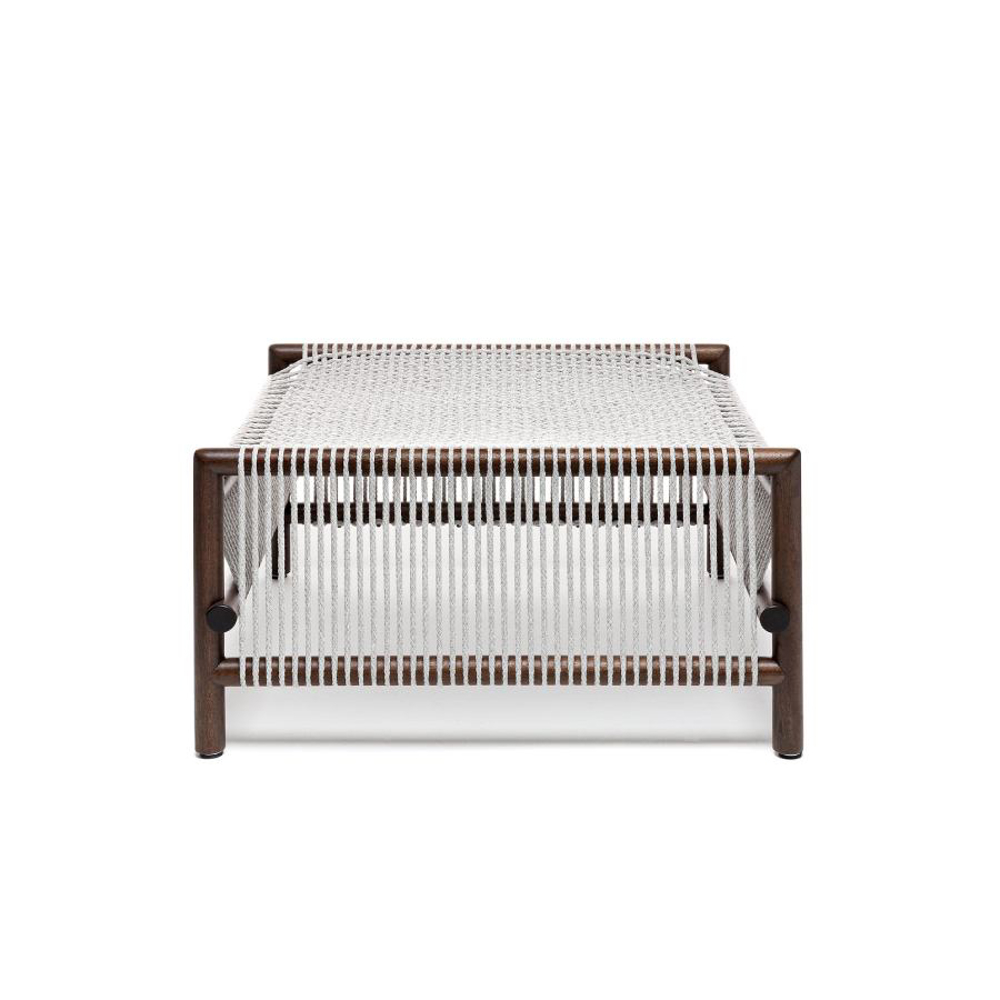 The rounded profile of the skeleton is adorned with woven strings. The Sapelli mahogany structure, available in matt mahogany, barrique and polished Mediterranean finish, is supported by PVC and stainless steel feet.