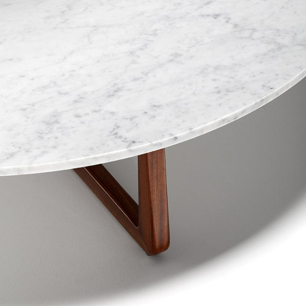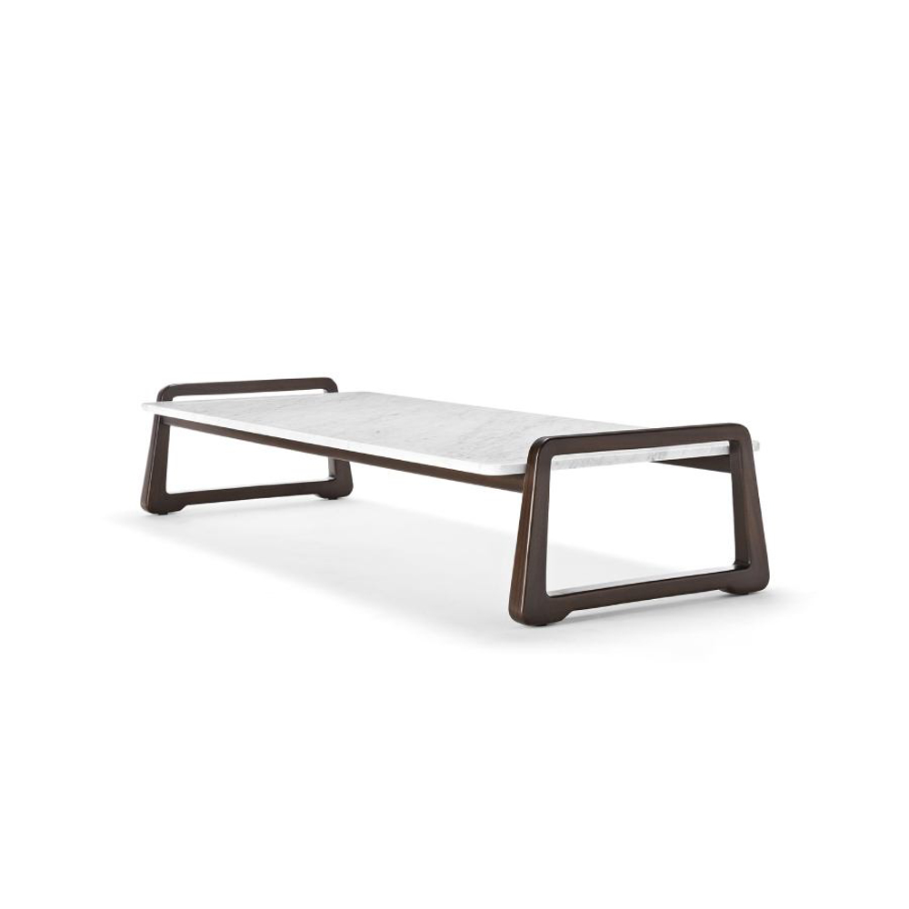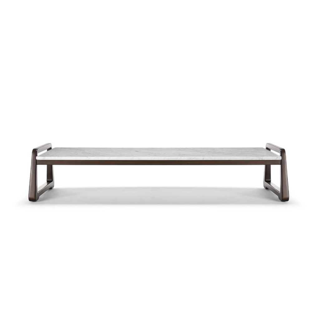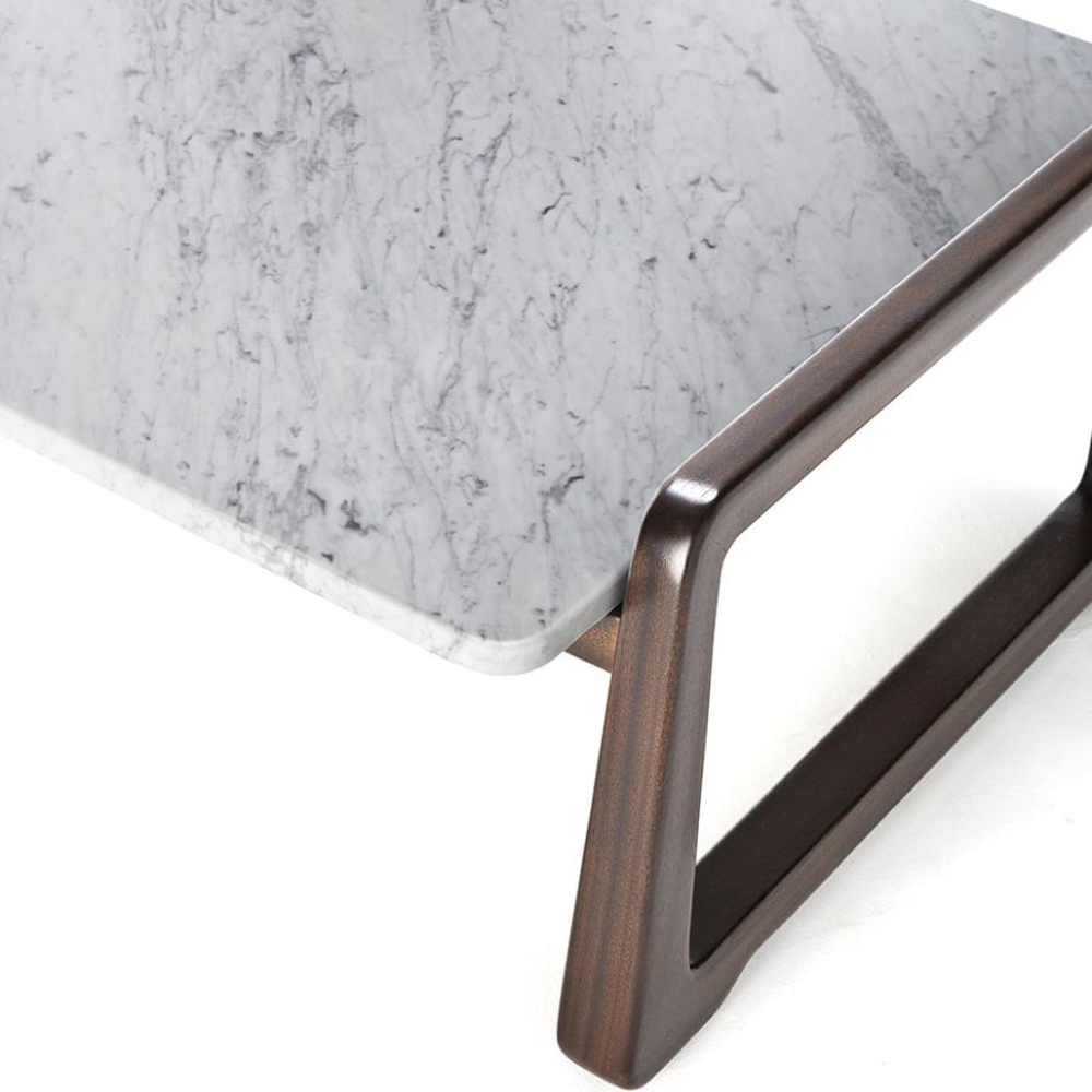 The majesty of the wood welcomes the marble top with its many veins. The supporting structure of the coffee table is made of solid Sapelli mahogany.