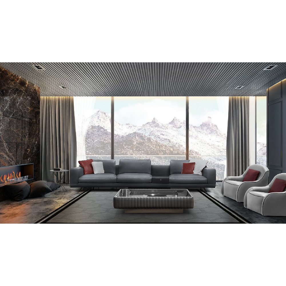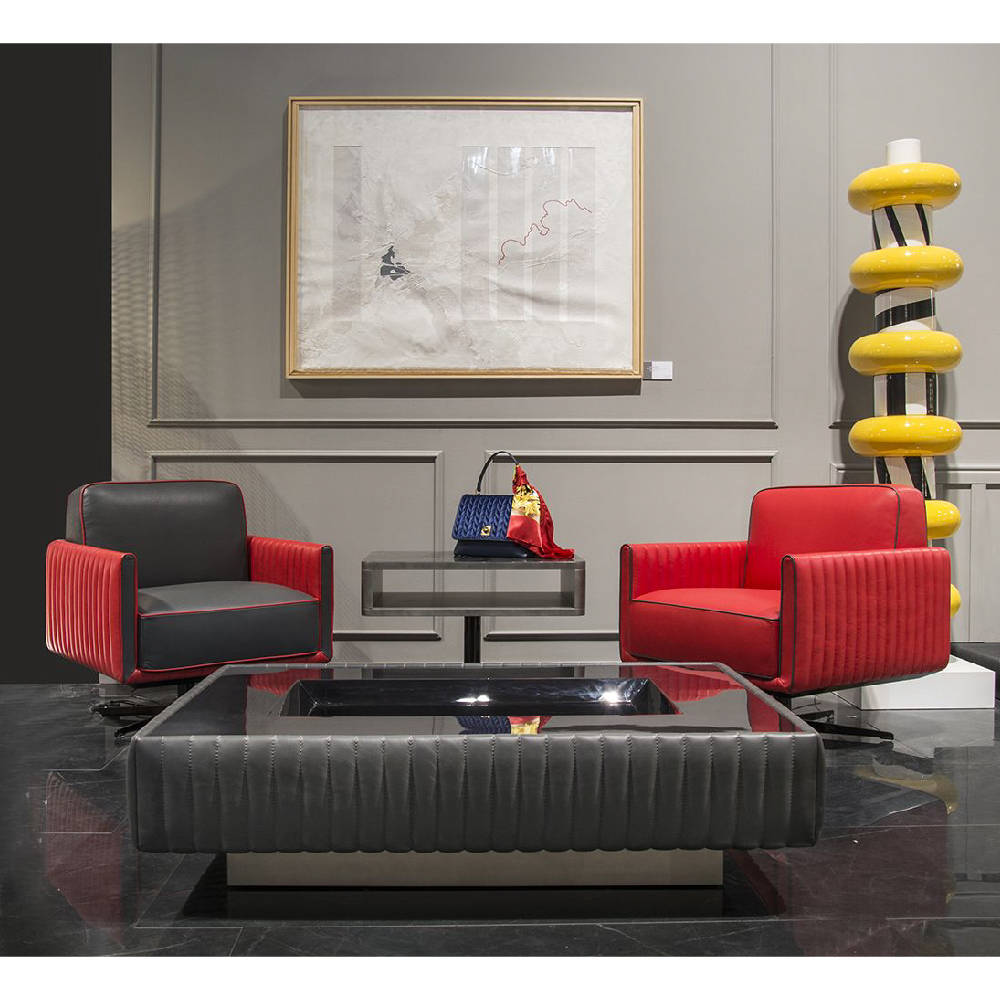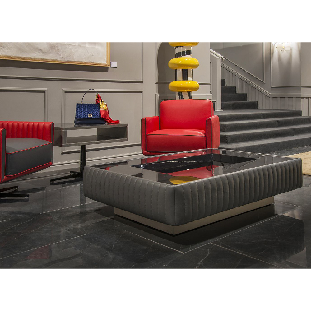 Top in veneer Planked col. black glossy, external structure in leather Daino col. Graphite matt, base lacquered col. iron.