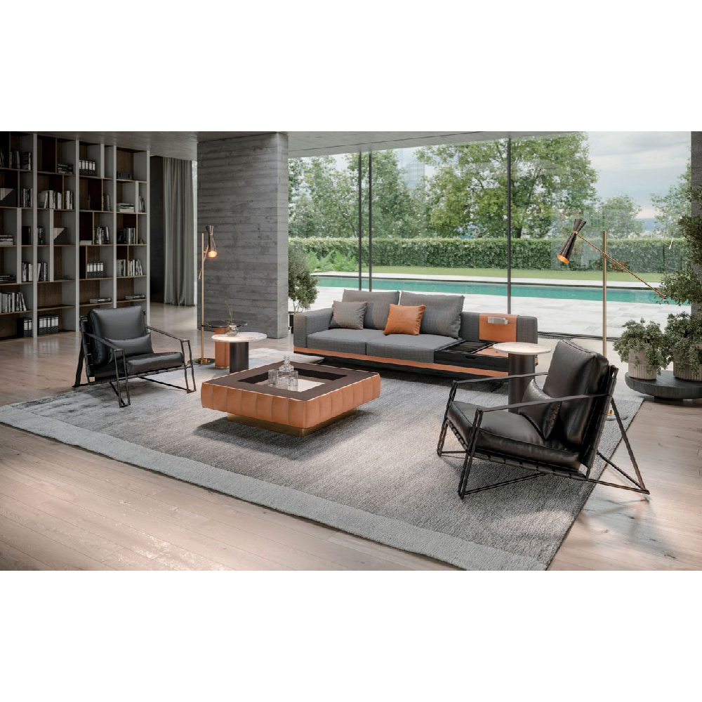 Top in veneer Wengé 2 flamed glossy finish, internal part of top in mirror bronze, external structure in leather Daino col. Whiskey, base lacquered col. bronze.