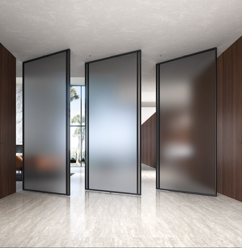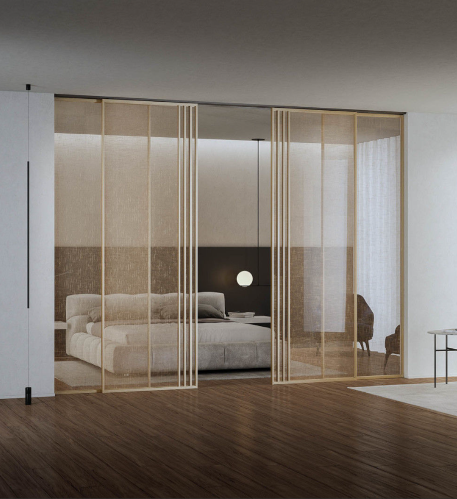 Minimal frame and laminated safety glass are the distinctive features of the glass doors of the TIP collection. Stopsol, lacquered, glazed or decorated with digital printing: download the catalogue to find out more about all the available variants.