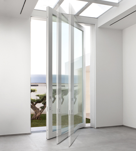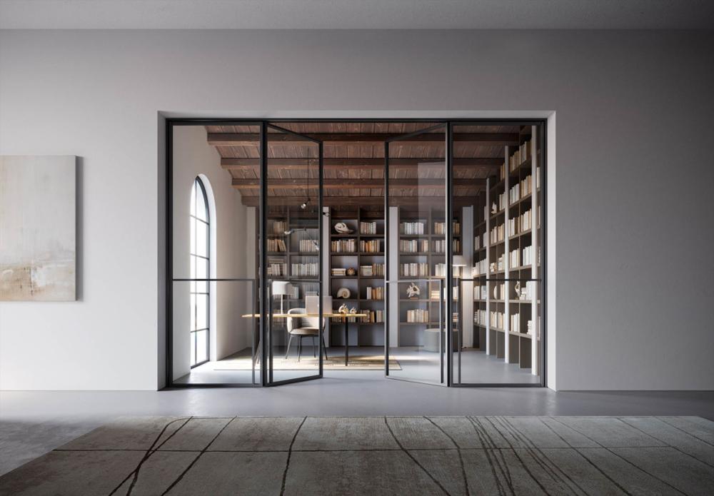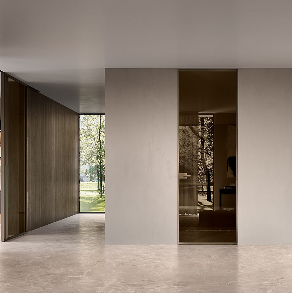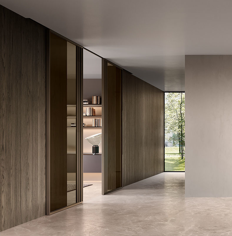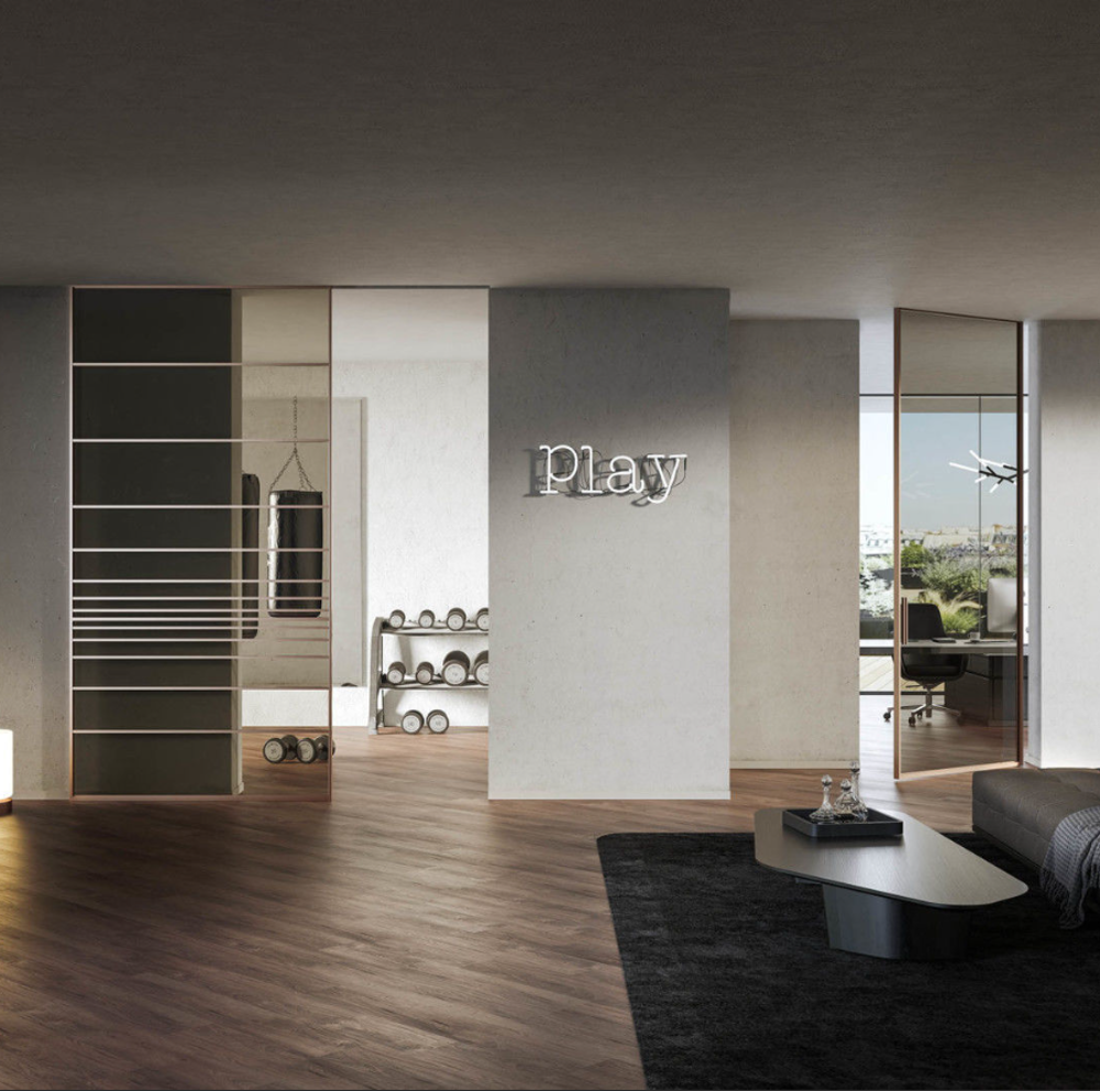 Thin aluminum profiles and wide transparent surfaces: the TIP glass door collection is dedicated to those who love bright and open spaces. Thanks to the handles perfectly integrated with the door design, the same models are available both in the standard and sliding options.
