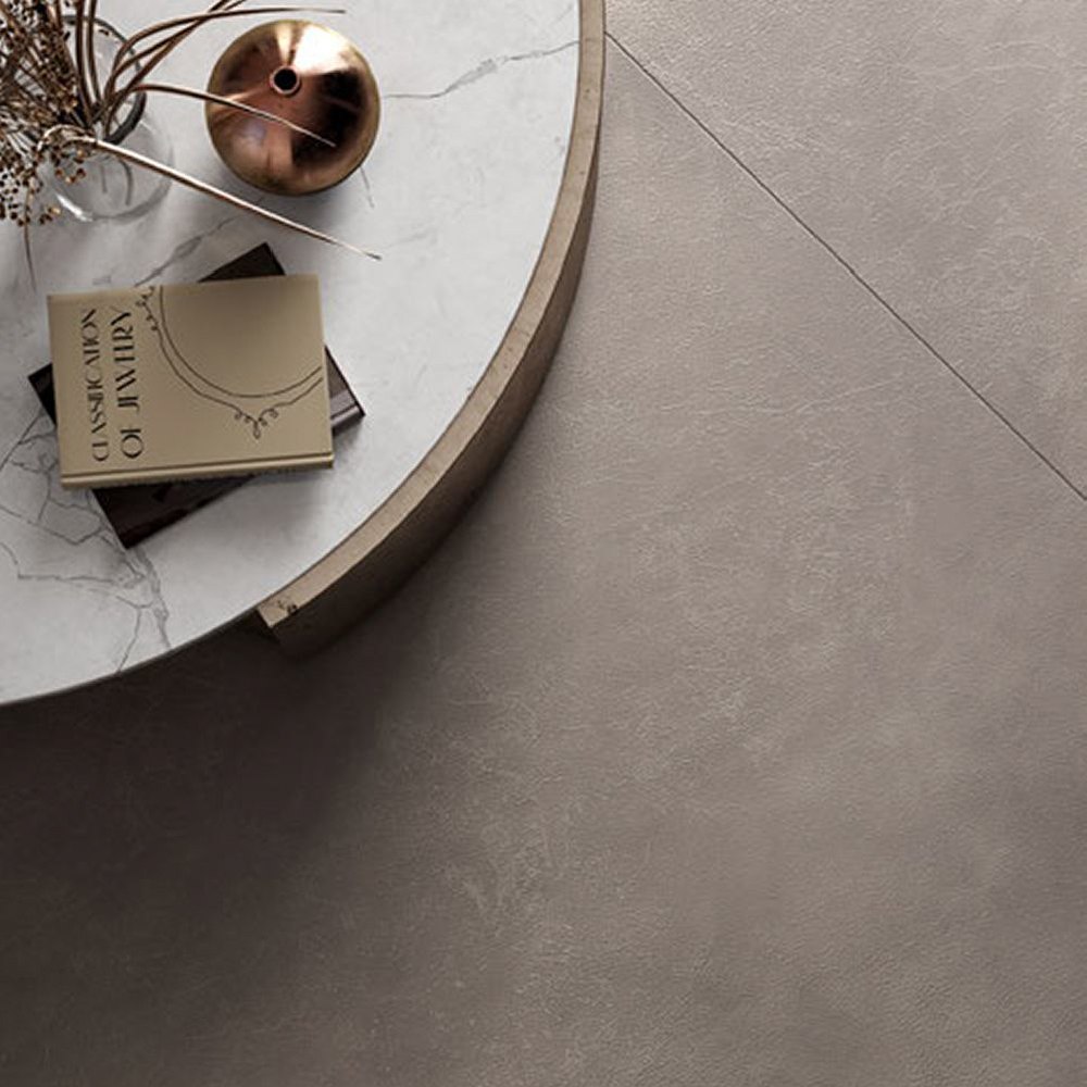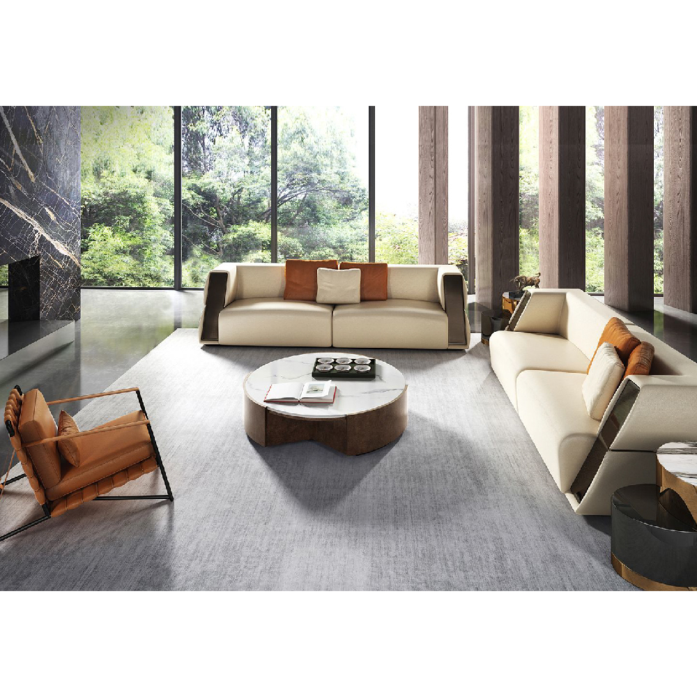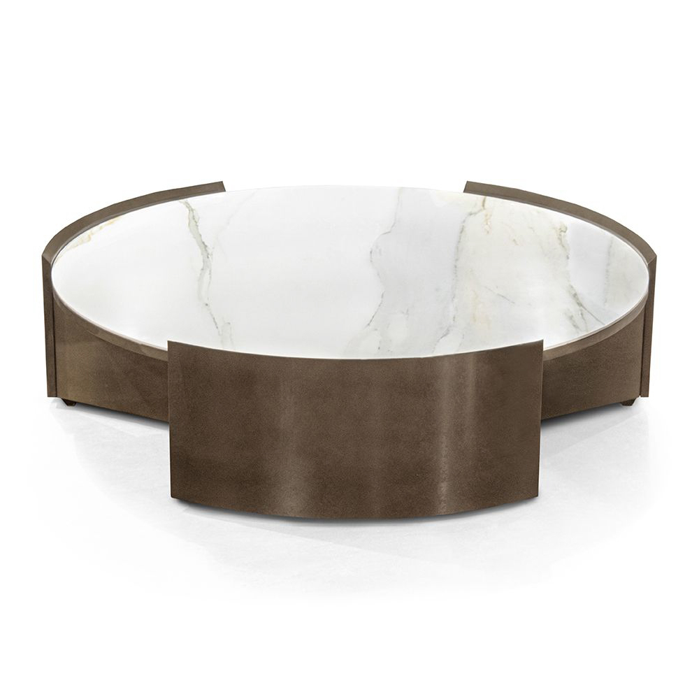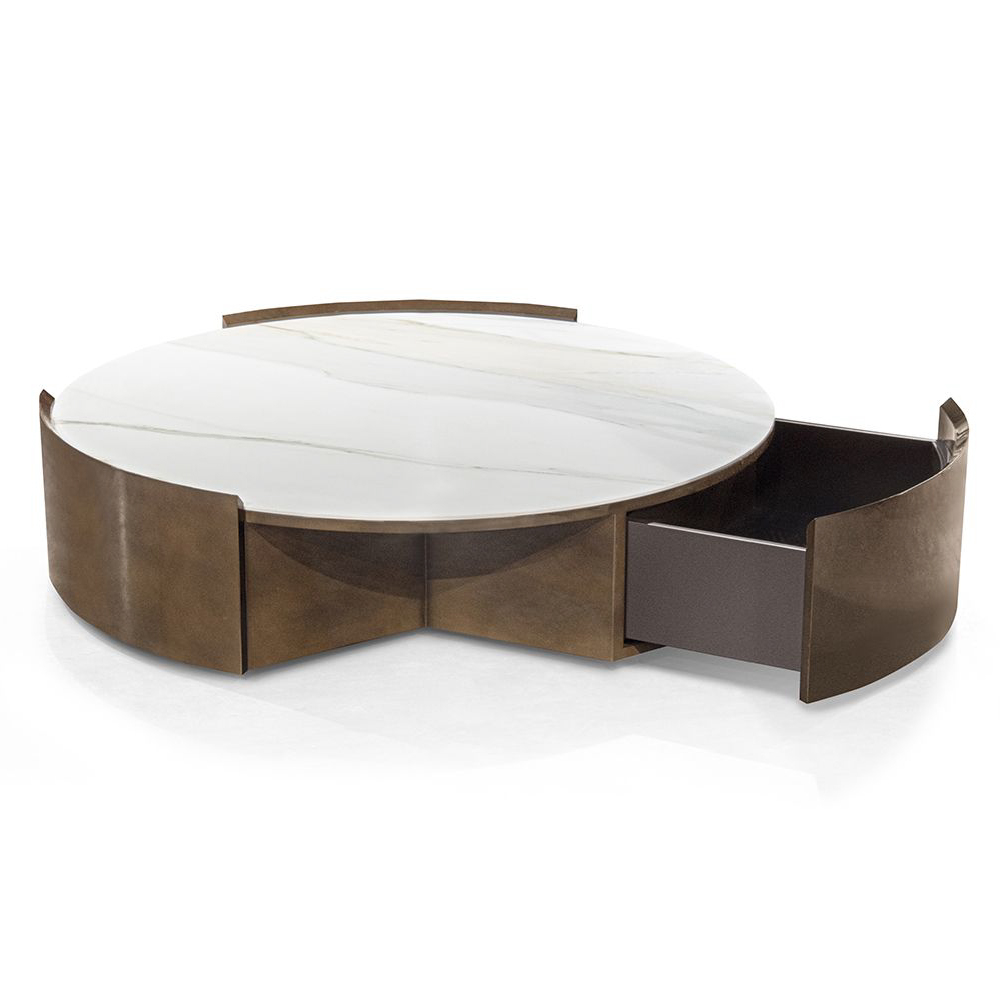 Round cocktail table, ceramic marble top with wooden structure in metallic finish, single drawer storage.