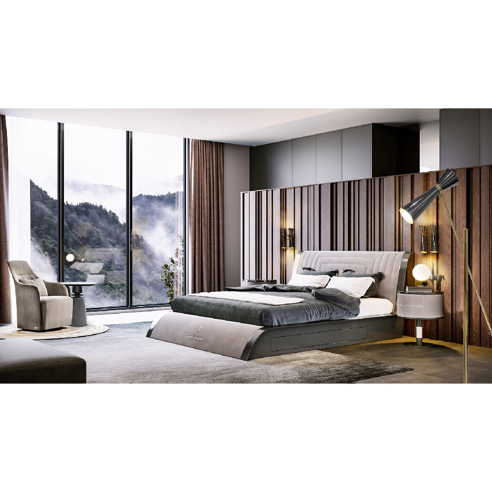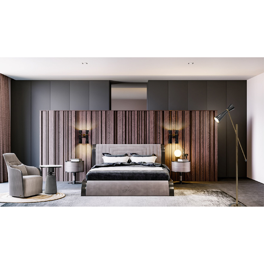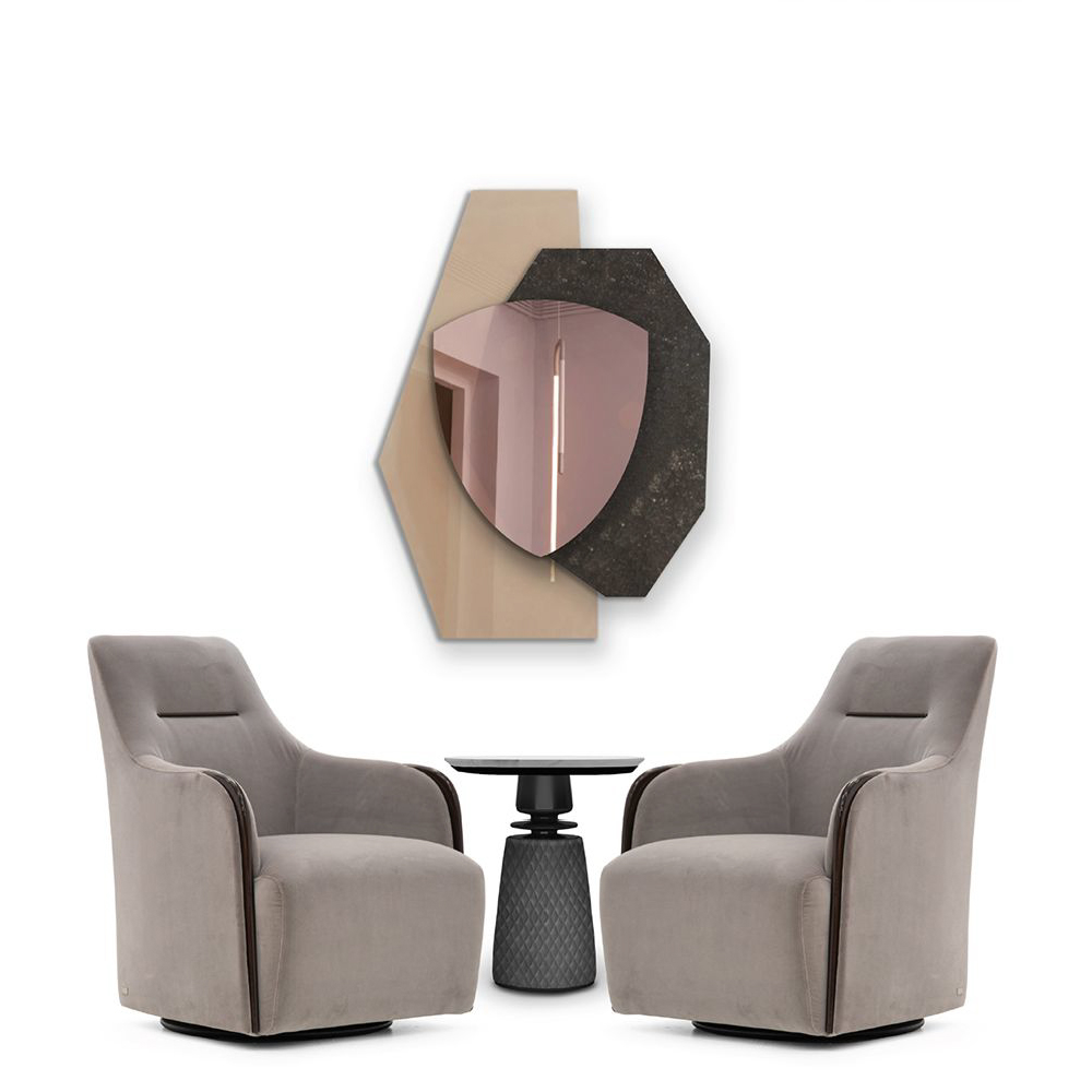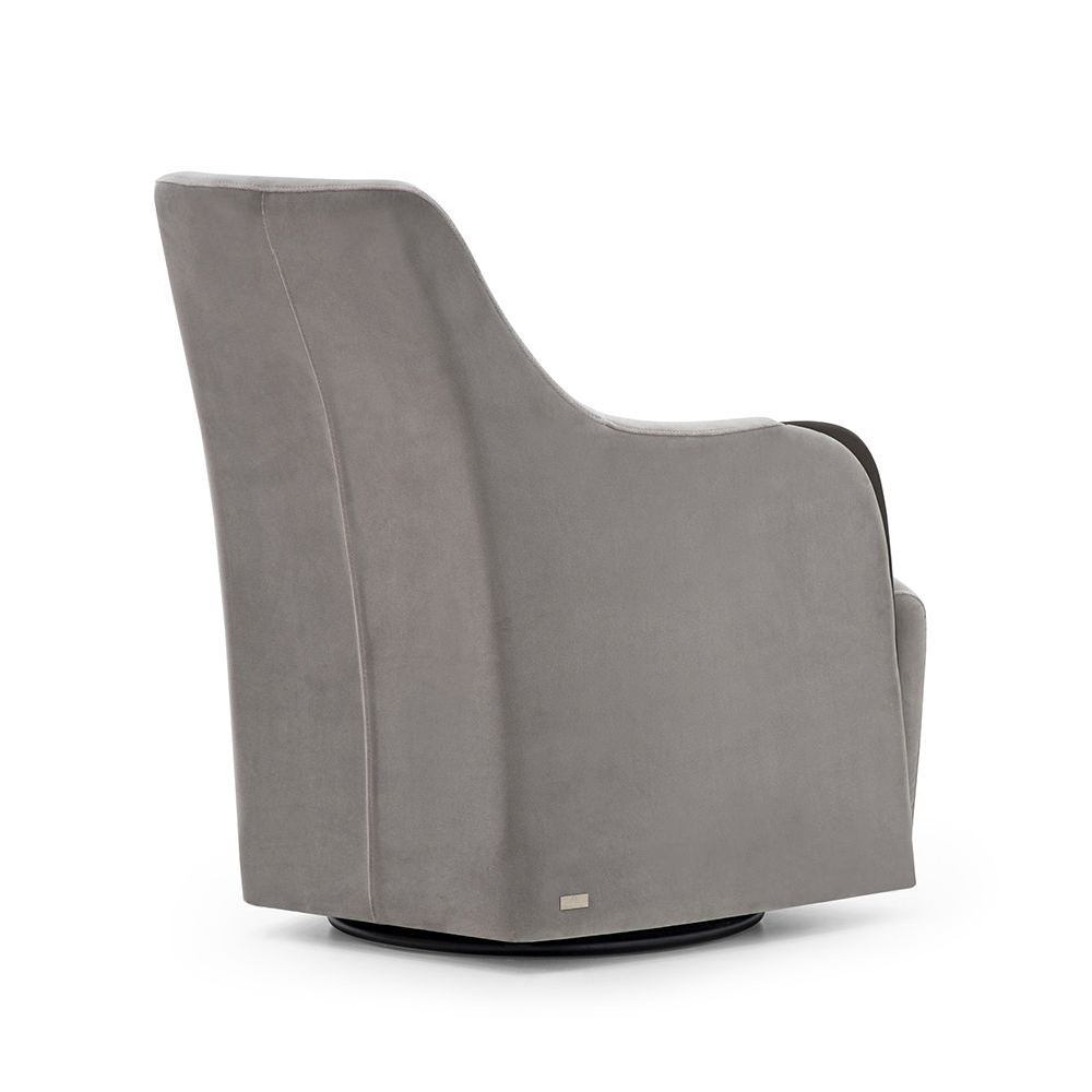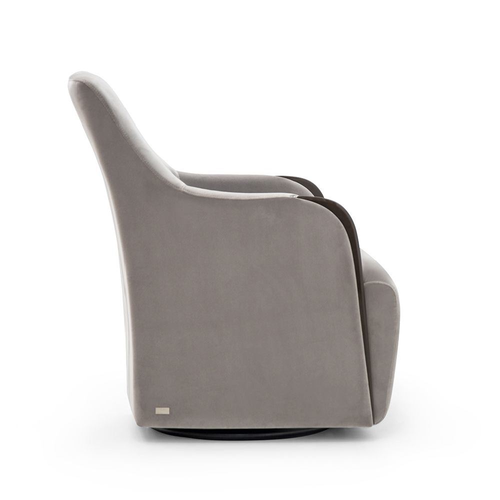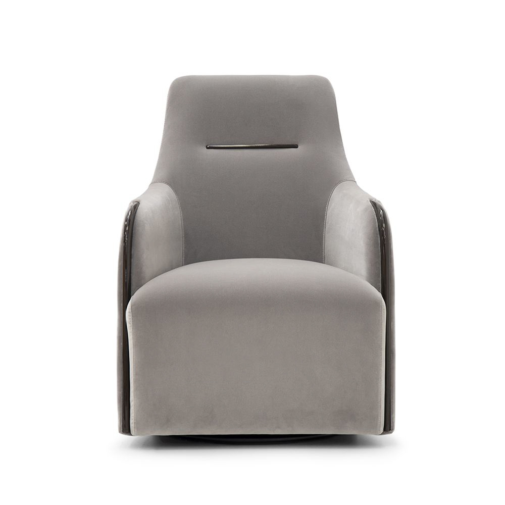 Accent swivel chair, upholstered in fabric or leather, inserts on backrest and armrest in metallic finish.