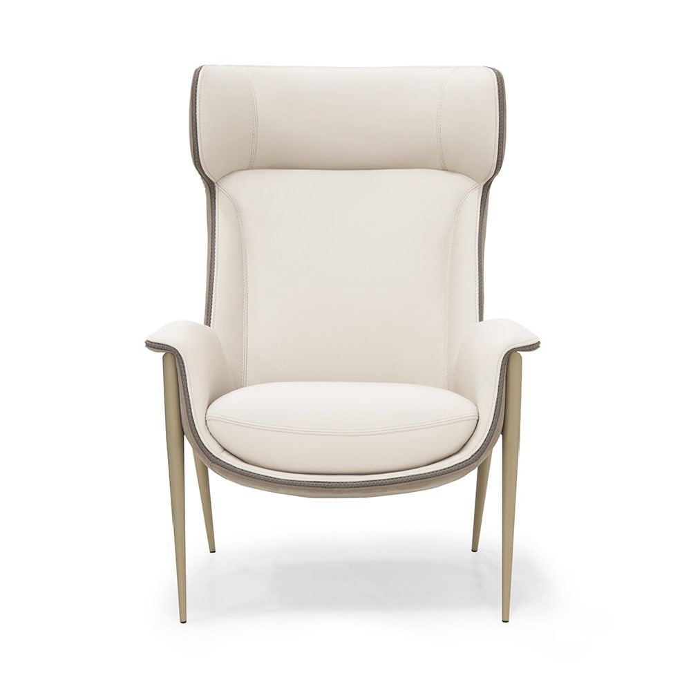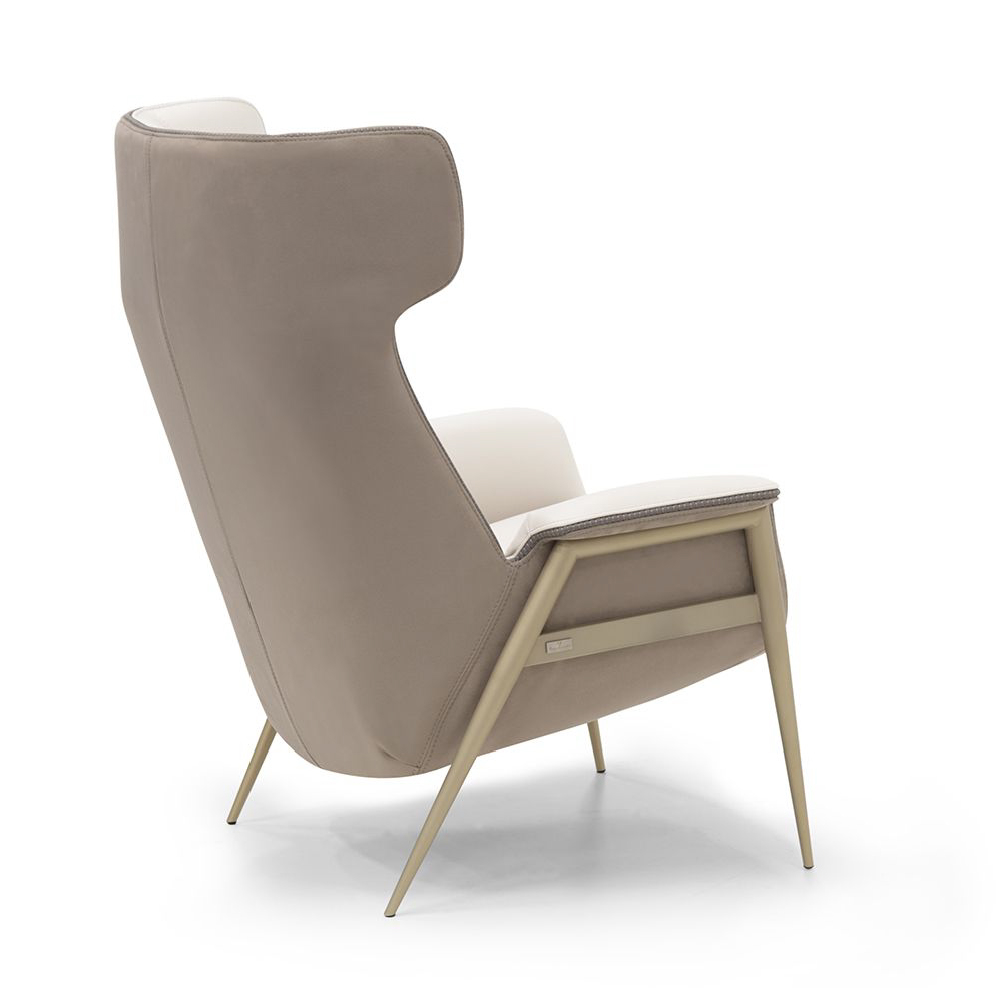 Accent chair with unique stitching technique upholstered in genuine leather and technosuede, metal legs.