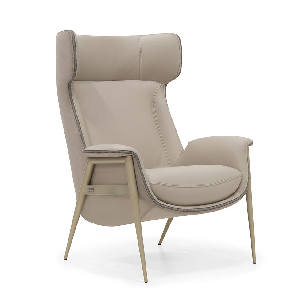 Accent chair with unique stitching technique upholstered in genuine leather and technosuede, metal legs.